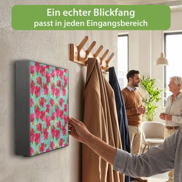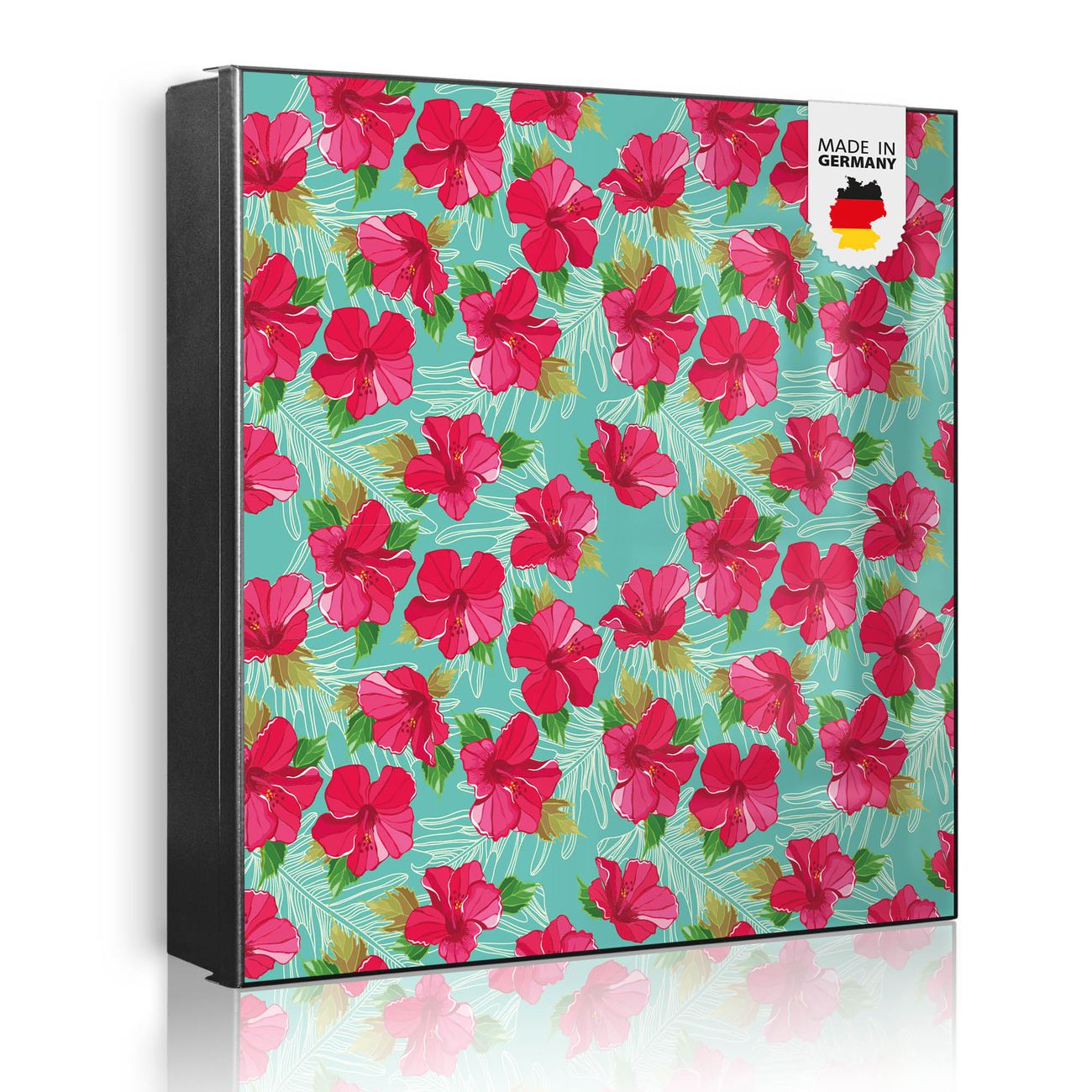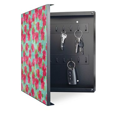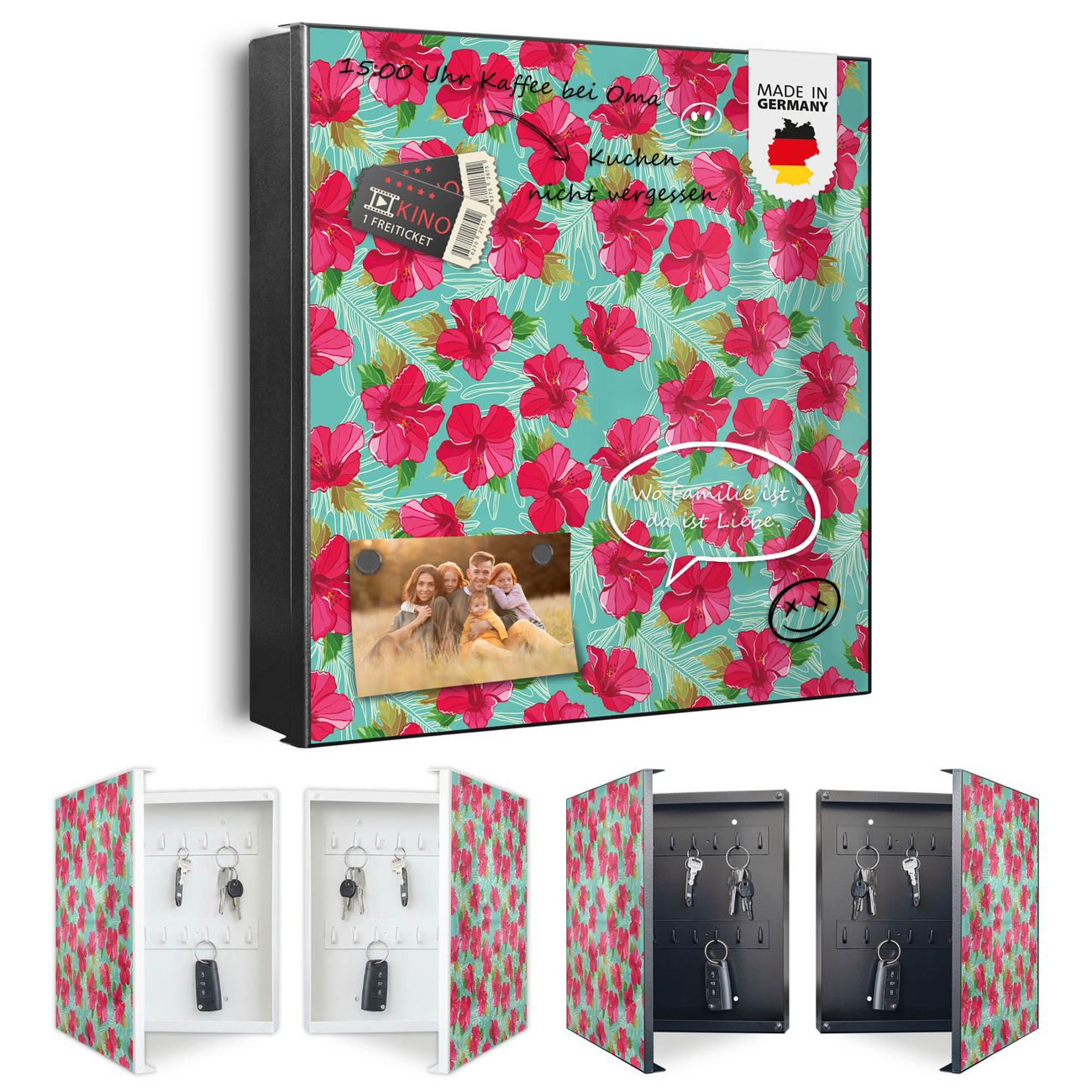 Bringe Ordnung und Eleganz in deinen Eingangsbereich mit dem banjado Schlüsselkasten Motiv Motiv Hibiskus. Die moderne Schlüsselbox kombiniert funktionales Design mit hochwertiger Verarbeitung und wird so zu einem echten Hingucker in Flur, Büro oder Ferienwohnung. ✅ Stilvolle Schlüsselaufbewahrung mit Motiv Motiv Hibiskus Der Design-Schlüsselkasten Motiv Motiv Hibiskus bietet Platz für bis zu 32 Schlüssel, die auf 4 stabilen Reihen mit je 8 Haken übersichtlich verstaut werden. Mit seinen kompakten Maßen von 30 x 30 x 5 cm passt die Schlüsselbox perfekt auch in kleinere Räume. Der schwarz lackierte Stahlkorpus mit links angeschlagenem Türscharnier harmoniert mit gedruckten Folie auf der Front und fügt sich nahtlos in jedes Wohnambiente ein. Ob als Schlüsselorganizer für Zuhause oder als praktische Lösung für Büros, Praxen und Gewerbe, der banjado Schlüsselkasten sorgt für Ordnung und Übersicht. Dank der magnetischen, mit Kreidestiften beschreibbaren Folie auf der Front kannst du Notizen anheften oder Termine direkt auf der Oberfläche festhalten. Die Schlüsselbox Motiv Motiv Hibiskus zur Wandmontage wird inklusive Befestigungsmaterial geliefert und ist schnell angebracht. So hast du deine Schlüssel jederzeit griffbereit und zugleich stilvoll verstaut. Mit diesem banjado Schlüsselkasten Motiv Motiv Hibiskus kombinierst du praktische Aufbewahrung mit stilvollem Wohndesign. Ob privat oder geschäftlich, die Schlüsselbox sorgt für mehr Ordnung, Übersicht und ein wohnliches Ambiente.Vorteile im Überblick