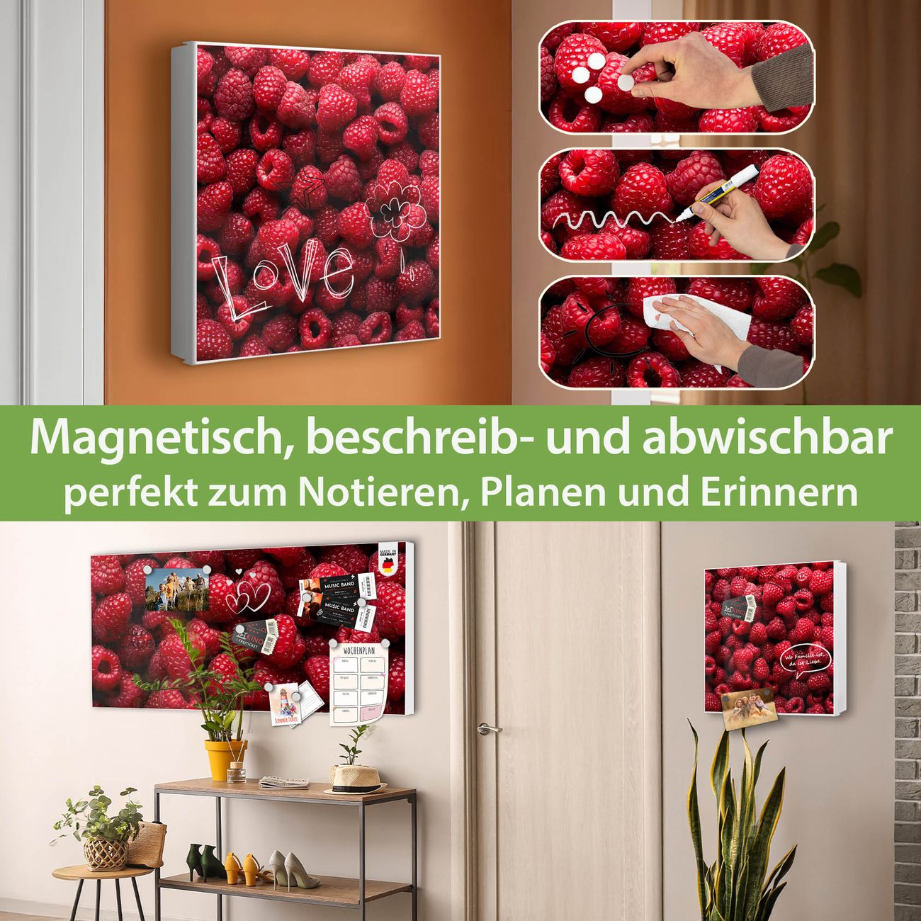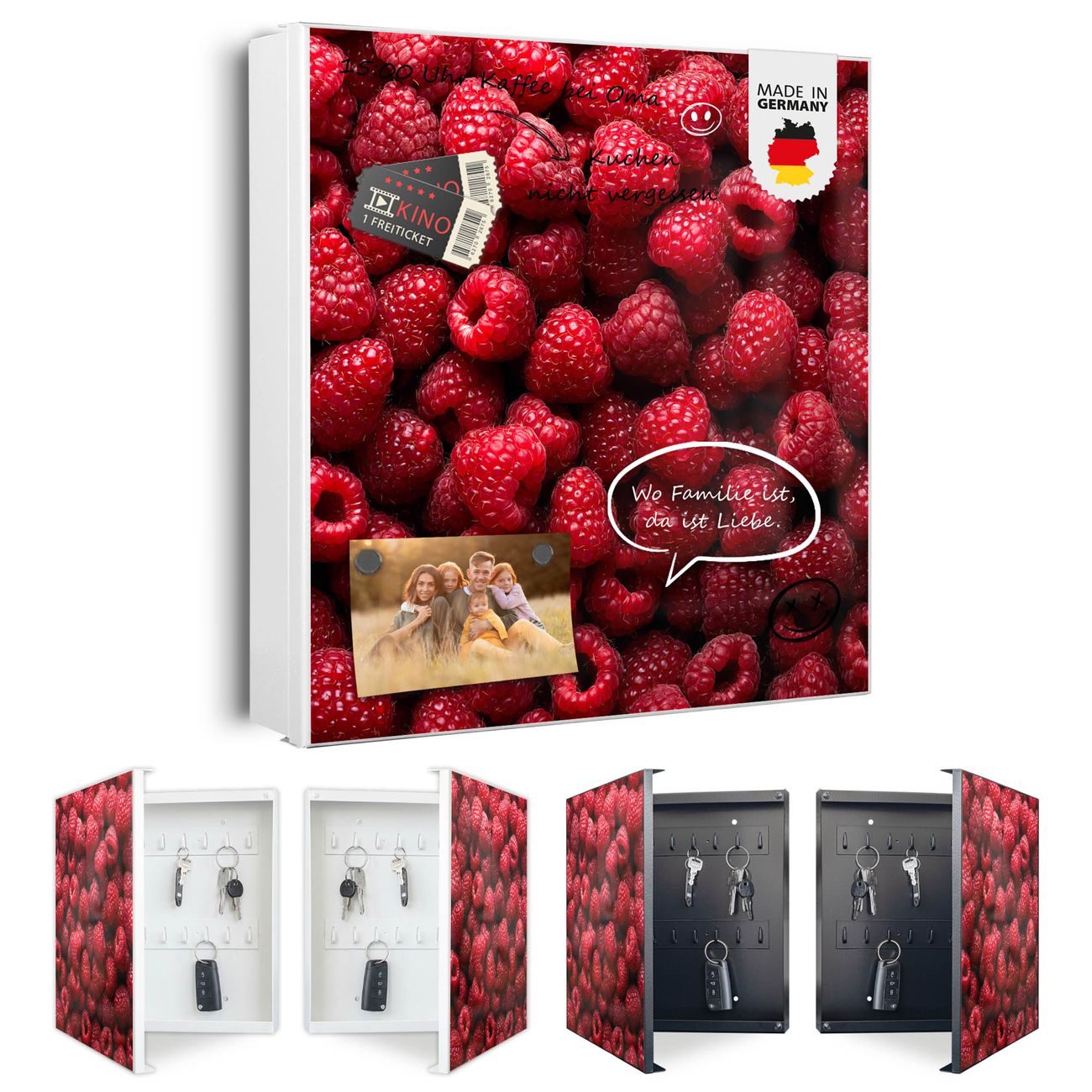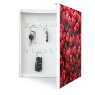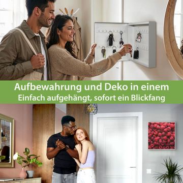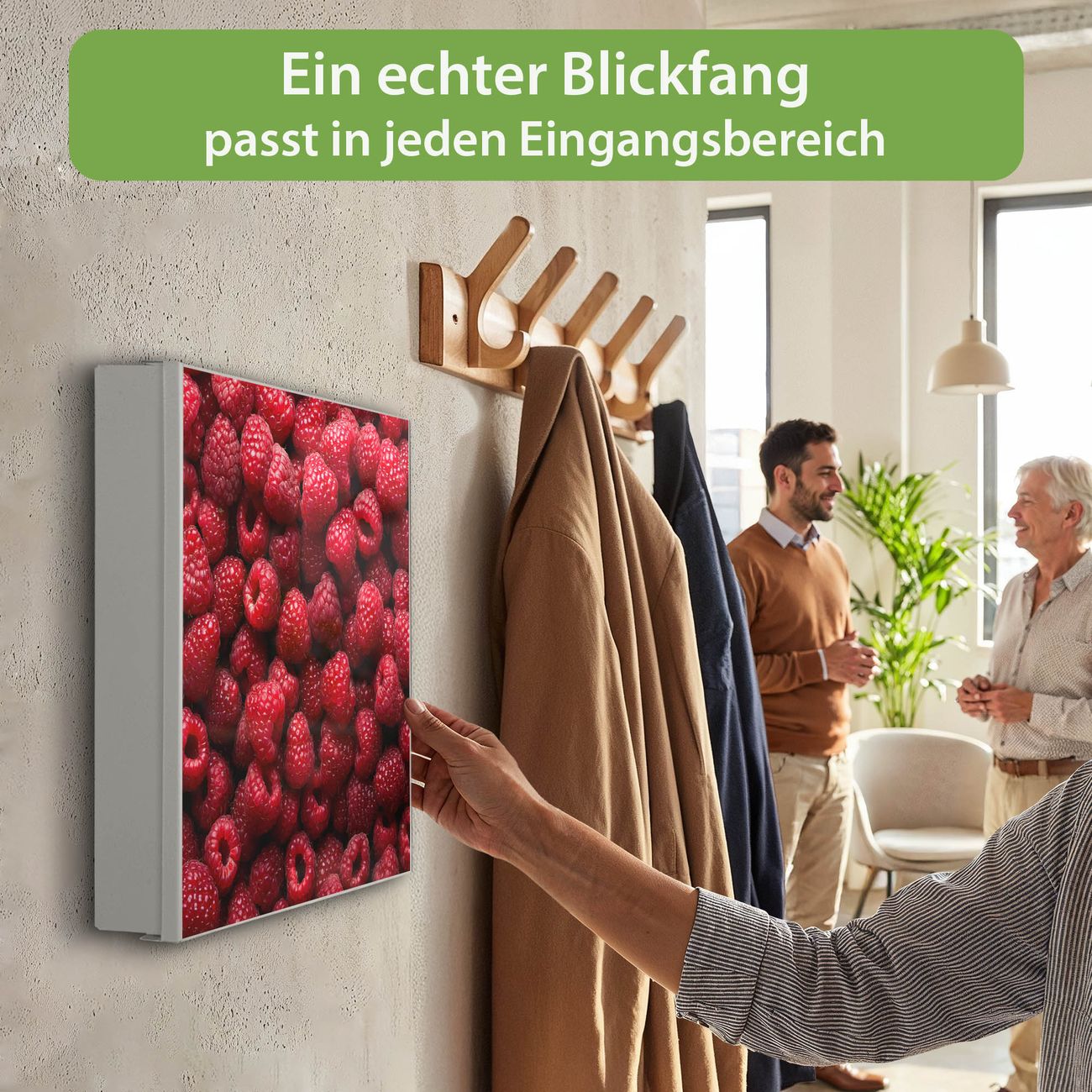 Bringe Ordnung und Eleganz in deinen Eingangsbereich mit dem banjado Schlüsselkasten Motiv Motiv Himbeeren. Die moderne Schlüsselbox kombiniert funktionales Design mit hochwertiger Verarbeitung und wird so zu einem echten Hingucker in Flur, Büro oder Ferienwohnung. ✅ Stilvolle Schlüsselaufbewahrung mit Motiv Motiv Himbeeren Der Design-Schlüsselkasten Motiv Motiv Himbeeren bietet Platz für bis zu 32 Schlüssel, die auf 4 stabilen Reihen mit je 8 Haken übersichtlich verstaut werden. Mit seinen kompakten Maßen von 30 x 30 x 5 cm passt die Schlüsselbox perfekt auch in kleinere Räume. Der weiß lackierte Stahlkorpus mit rechts angeschlagenem Türscharnier harmoniert mit gedruckten Folie auf der Front und fügt sich nahtlos in jedes Wohnambiente ein. Ob als Schlüsselorganizer für Zuhause oder als praktische Lösung für Büros, Praxen und Gewerbe, der banjado Schlüsselkasten sorgt für Ordnung und Übersicht. Dank der magnetischen, mit Kreidestiften beschreibbaren Folie auf der Front kannst du Notizen anheften oder Termine direkt auf der Oberfläche festhalten. Die Schlüsselbox Motiv Motiv Himbeeren zur Wandmontage wird inklusive Befestigungsmaterial geliefert und ist schnell angebracht. So hast du deine Schlüssel jederzeit griffbereit und zugleich stilvoll verstaut. Mit diesem banjado Schlüsselkasten Motiv Motiv Himbeeren kombinierst du praktische Aufbewahrung mit stilvollem Wohndesign. Ob privat oder geschäftlich, die Schlüsselbox sorgt für mehr Ordnung, Übersicht und ein wohnliches Ambiente.Vorteile im Überblick