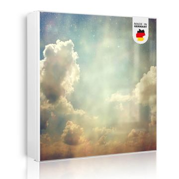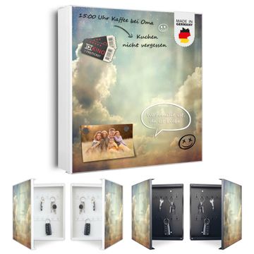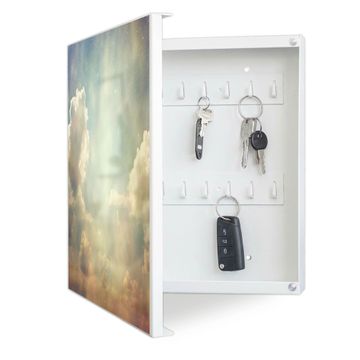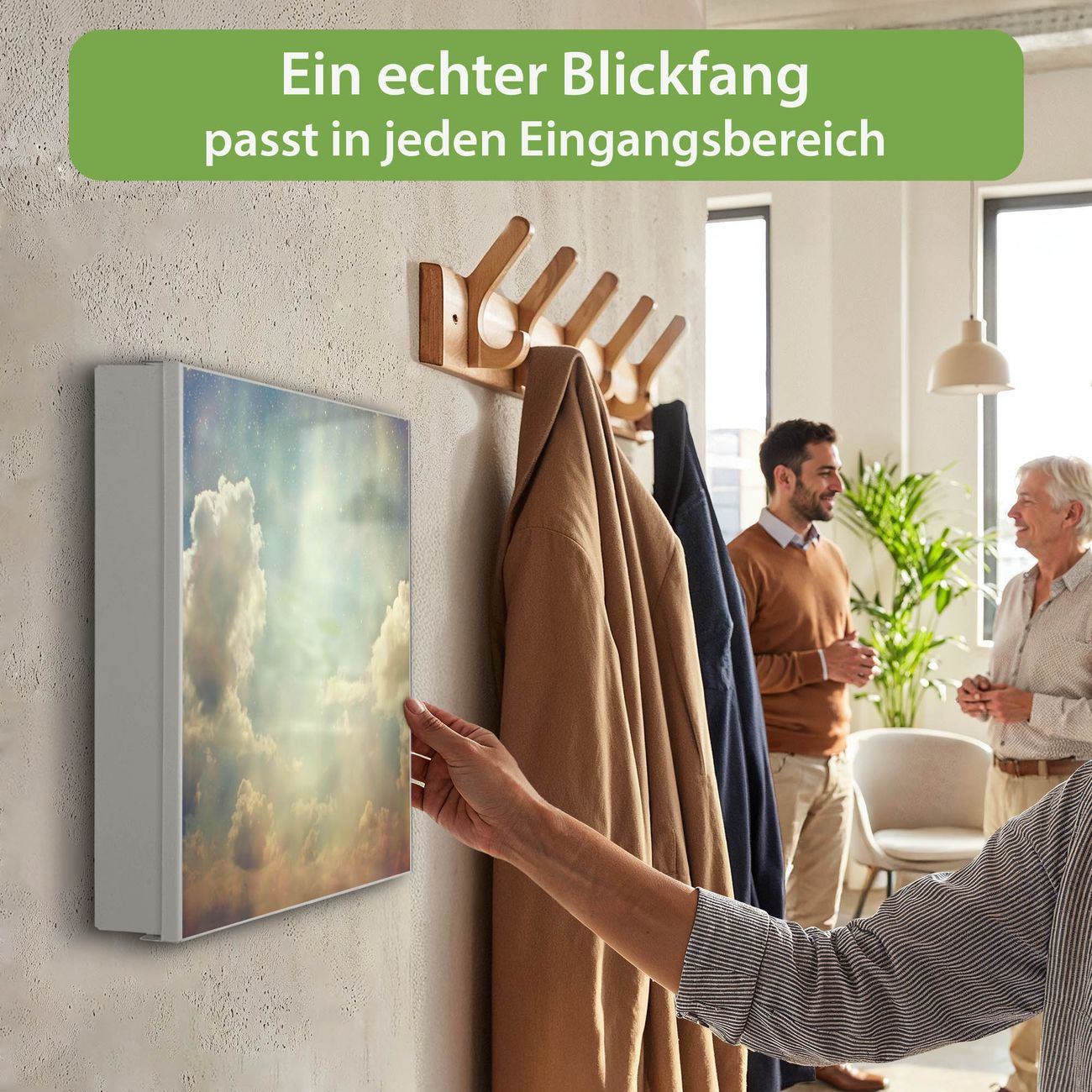 Bringe Ordnung und Eleganz in deinen Eingangsbereich mit dem banjado Schlüsselkasten Motiv Motiv Himmel Vintage. Die moderne Schlüsselbox kombiniert funktionales Design mit hochwertiger Verarbeitung und wird so zu einem echten Hingucker in Flur, Büro oder Ferienwohnung. ✅ Stilvolle Schlüsselaufbewahrung mit Motiv Motiv Himmel Vintage Der Design-Schlüsselkasten Motiv Motiv Himmel Vintage bietet Platz für bis zu 32 Schlüssel, die auf 4 stabilen Reihen mit je 8 Haken übersichtlich verstaut werden. Mit seinen kompakten Maßen von 30 x 30 x 5 cm passt die Schlüsselbox perfekt auch in kleinere Räume. Der weiß lackierte Stahlkorpus mit links angeschlagenem Türscharnier harmoniert mit gedruckten Folie auf der Front und fügt sich nahtlos in jedes Wohnambiente ein. Ob als Schlüsselorganizer für Zuhause oder als praktische Lösung für Büros, Praxen und Gewerbe, der banjado Schlüsselkasten sorgt für Ordnung und Übersicht. Dank der magnetischen, mit Kreidestiften beschreibbaren Folie auf der Front kannst du Notizen anheften oder Termine direkt auf der Oberfläche festhalten. Die Schlüsselbox Motiv Motiv Himmel Vintage zur Wandmontage wird inklusive Befestigungsmaterial geliefert und ist schnell angebracht. So hast du deine Schlüssel jederzeit griffbereit und zugleich stilvoll verstaut. Mit diesem banjado Schlüsselkasten Motiv Motiv Himmel Vintage kombinierst du praktische Aufbewahrung mit stilvollem Wohndesign. Ob privat oder geschäftlich, die Schlüsselbox sorgt für mehr Ordnung, Übersicht und ein wohnliches Ambiente.Vorteile im Überblick