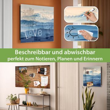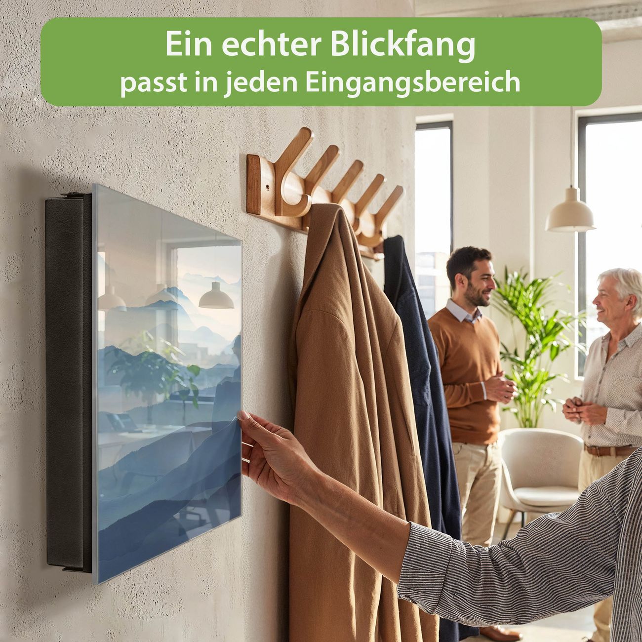 Bringe Ordnung und Eleganz in deinen Eingangsbereich mit dem banjado Schlüsselkasten Motiv Motiv Hinter den Bergen. Die moderne Schlüsselbox kombiniert funktionales Design mit hochwertiger Verarbeitung und wird so zu einem echten Hingucker in Flur, Büro oder Ferienwohnung. ✅ Stilvolle Schlüsselaufbewahrung mit Glasfront im Motiv Motiv Hinter den Bergen Der Design-Schlüsselkasten Motiv Motiv Hinter den Bergen bietet Platz für bis zu 50 Schlüssel, die auf 5 stabilen Reihen mit je 10 Haken übersichtlich verstaut werden. Mit seinen kompakten Maßen von 30 x 30 x 5 cm passt die Schlüsselbox perfekt auch in kleinere Räume. Der schwarz lackierte Stahlkorpus mit rechts angeschlagenem Türscharnier harmoniert mit der Glasfront und fügt sich nahtlos in jedes Wohnambiente ein. Ob als Schlüsselorganizer für Zuhause oder als praktische Lösung für Büros, Praxen und Gewerbe, der banjado Schlüsselkasten sorgt für Ordnung und Übersicht. Dank der magnetischen, mit Kreidestiften beschreibbaren Glasfront kannst du Notizen anheften oder Termine direkt auf der Oberfläche festhalten. Die Schlüsselbox Motiv Motiv Hinter den Bergen zur Wandmontage wird inklusive Befestigungsmaterial geliefert und ist schnell angebracht. So hast du deine Schlüssel jederzeit griffbereit und zugleich stilvoll verstaut. Mit diesem banjado Schlüsselkasten Motiv Motiv Hinter den Bergen kombinierst du praktische Aufbewahrung mit stilvollem Wohndesign. Ob privat oder geschäftlich, die Schlüsselbox sorgt für mehr Ordnung, Übersicht und ein wohnliches Ambiente.Vorteile im Überblick
