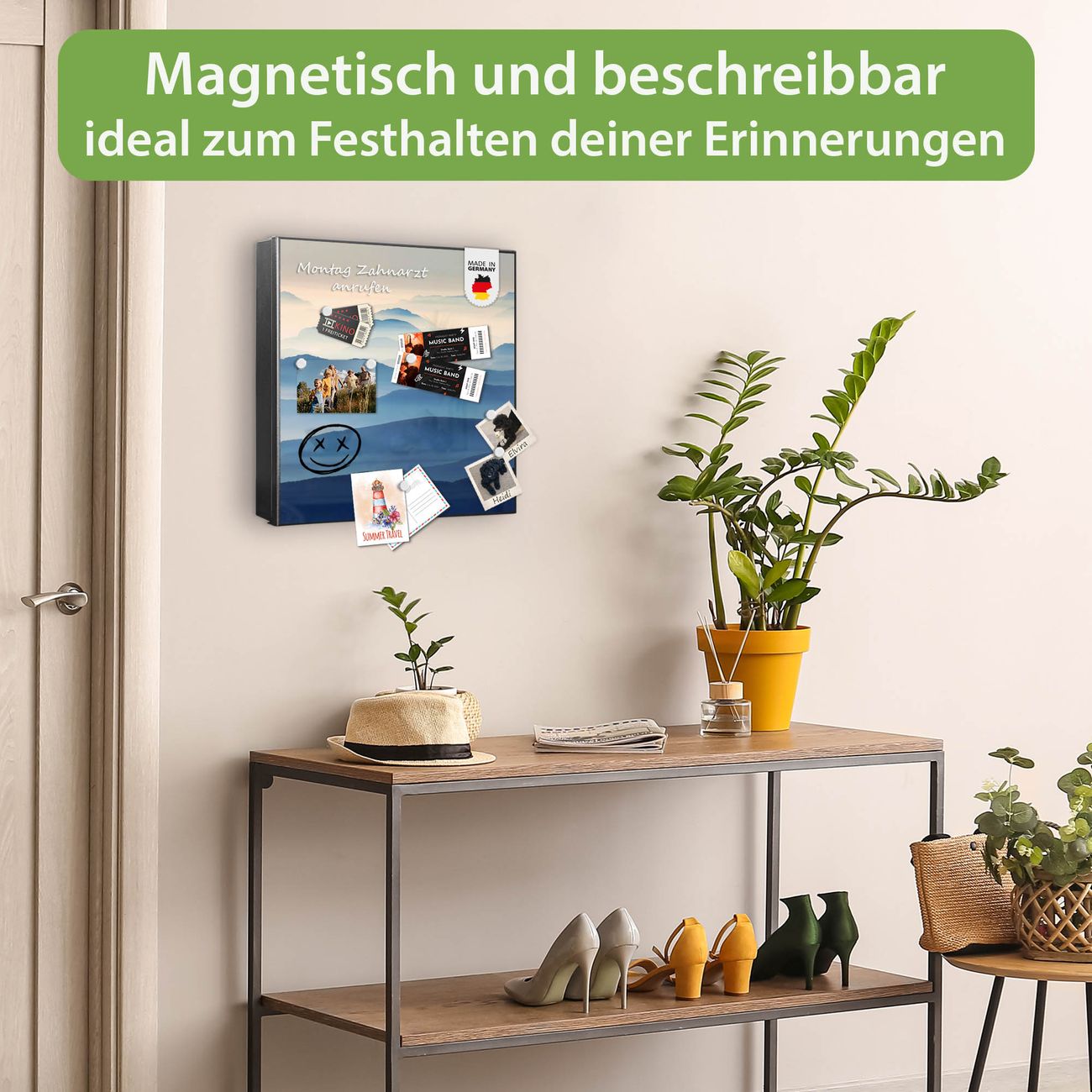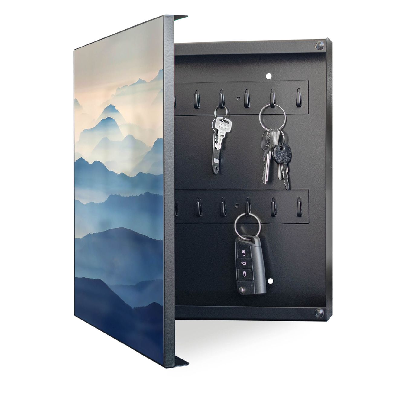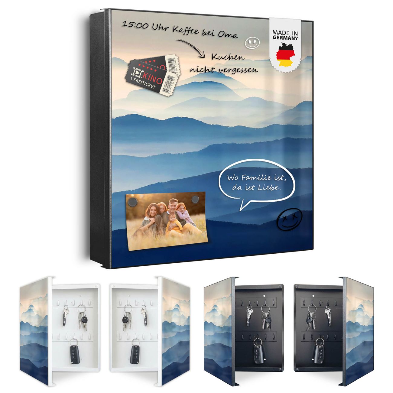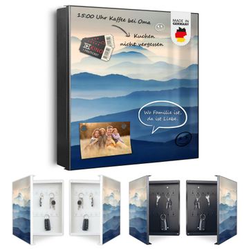 Bringe Ordnung und Eleganz in deinen Eingangsbereich mit dem banjado Schlüsselkasten Motiv Motiv Hinter den Bergen. Die moderne Schlüsselbox kombiniert funktionales Design mit hochwertiger Verarbeitung und wird so zu einem echten Hingucker in Flur, Büro oder Ferienwohnung. ✅ Stilvolle Schlüsselaufbewahrung mit Motiv Motiv Hinter den Bergen Der Design-Schlüsselkasten Motiv Motiv Hinter den Bergen bietet Platz für bis zu 32 Schlüssel, die auf 4 stabilen Reihen mit je 8 Haken übersichtlich verstaut werden. Mit seinen kompakten Maßen von 30 x 30 x 5 cm passt die Schlüsselbox perfekt auch in kleinere Räume. Der schwarz lackierte Stahlkorpus mit links angeschlagenem Türscharnier harmoniert mit gedruckten Folie auf der Front und fügt sich nahtlos in jedes Wohnambiente ein. Ob als Schlüsselorganizer für Zuhause oder als praktische Lösung für Büros, Praxen und Gewerbe, der banjado Schlüsselkasten sorgt für Ordnung und Übersicht. Dank der magnetischen, mit Kreidestiften beschreibbaren Folie auf der Front kannst du Notizen anheften oder Termine direkt auf der Oberfläche festhalten. Die Schlüsselbox Motiv Motiv Hinter den Bergen zur Wandmontage wird inklusive Befestigungsmaterial geliefert und ist schnell angebracht. So hast du deine Schlüssel jederzeit griffbereit und zugleich stilvoll verstaut. Mit diesem banjado Schlüsselkasten Motiv Motiv Hinter den Bergen kombinierst du praktische Aufbewahrung mit stilvollem Wohndesign. Ob privat oder geschäftlich, die Schlüsselbox sorgt für mehr Ordnung, Übersicht und ein wohnliches Ambiente.Vorteile im Überblick
