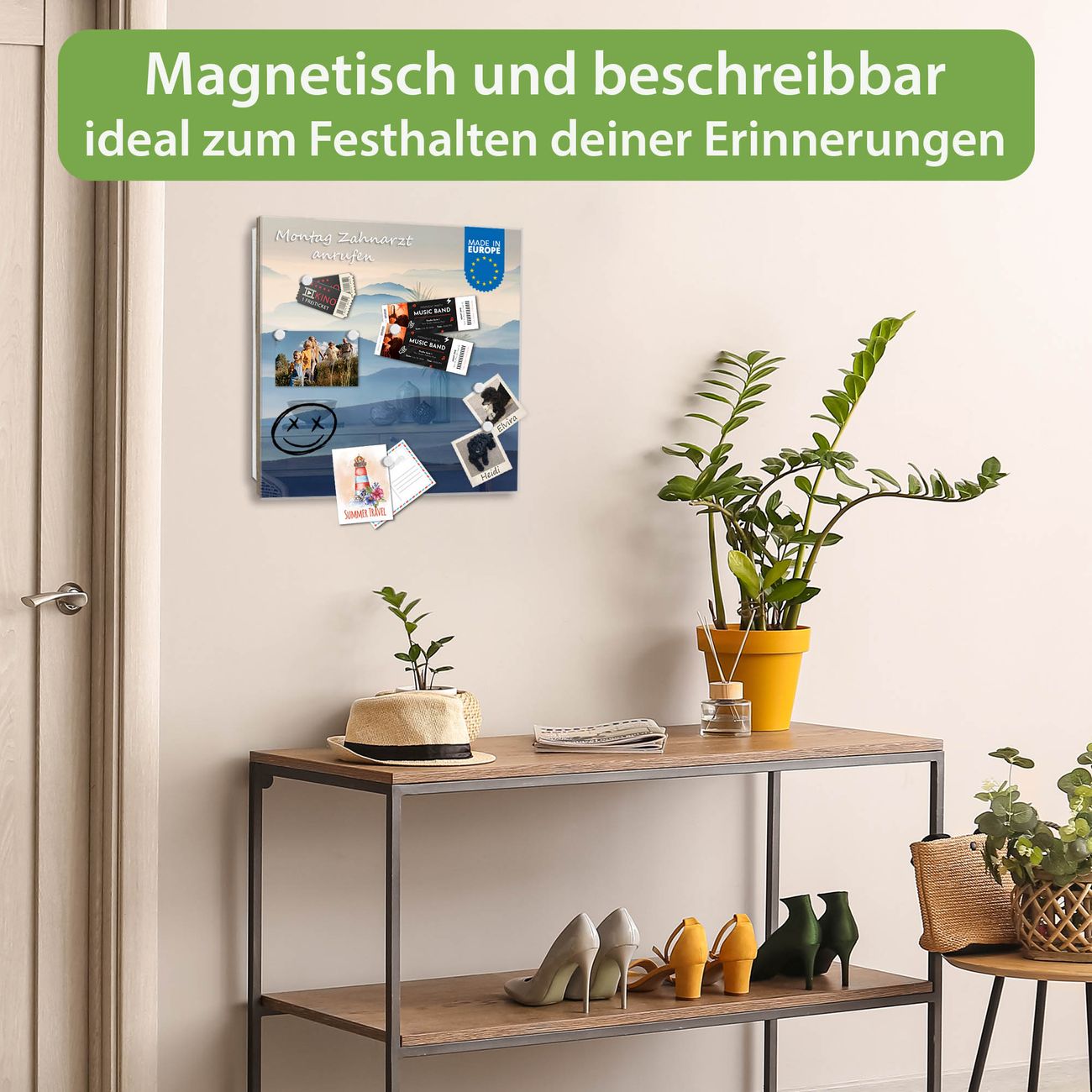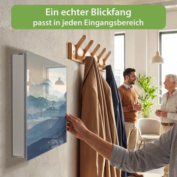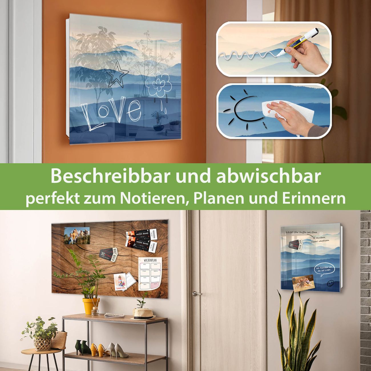 Bringe Ordnung und Eleganz in deinen Eingangsbereich mit dem banjado Schlüsselkasten Motiv Motiv Hinter den Bergen. Die moderne Schlüsselbox kombiniert funktionales Design mit hochwertiger Verarbeitung und wird so zu einem echten Hingucker in Flur, Büro oder Ferienwohnung. ✅ Stilvolle Schlüsselaufbewahrung mit Glasfront im Motiv Motiv Hinter den Bergen Der Design-Schlüsselkasten Motiv Motiv Hinter den Bergen bietet Platz für bis zu 50 Schlüssel, die auf 5 stabilen Reihen mit je 10 Haken übersichtlich verstaut werden. Mit seinen kompakten Maßen von 30 x 30 x 5 cm passt die Schlüsselbox perfekt auch in kleinere Räume. Der weiß lackierte Stahlkorpus mit rechts angeschlagenem Türscharnier harmoniert mit der Glasfront und fügt sich nahtlos in jedes Wohnambiente ein. Ob als Schlüsselorganizer für Zuhause oder als praktische Lösung für Büros, Praxen und Gewerbe, der banjado Schlüsselkasten sorgt für Ordnung und Übersicht. Dank der magnetischen, mit Kreidestiften beschreibbaren Glasfront kannst du Notizen anheften oder Termine direkt auf der Oberfläche festhalten. Die Schlüsselbox Motiv Motiv Hinter den Bergen zur Wandmontage wird inklusive Befestigungsmaterial geliefert und ist schnell angebracht. So hast du deine Schlüssel jederzeit griffbereit und zugleich stilvoll verstaut. Mit diesem banjado Schlüsselkasten Motiv Motiv Hinter den Bergen kombinierst du praktische Aufbewahrung mit stilvollem Wohndesign. Ob privat oder geschäftlich, die Schlüsselbox sorgt für mehr Ordnung, Übersicht und ein wohnliches Ambiente.Vorteile im Überblick