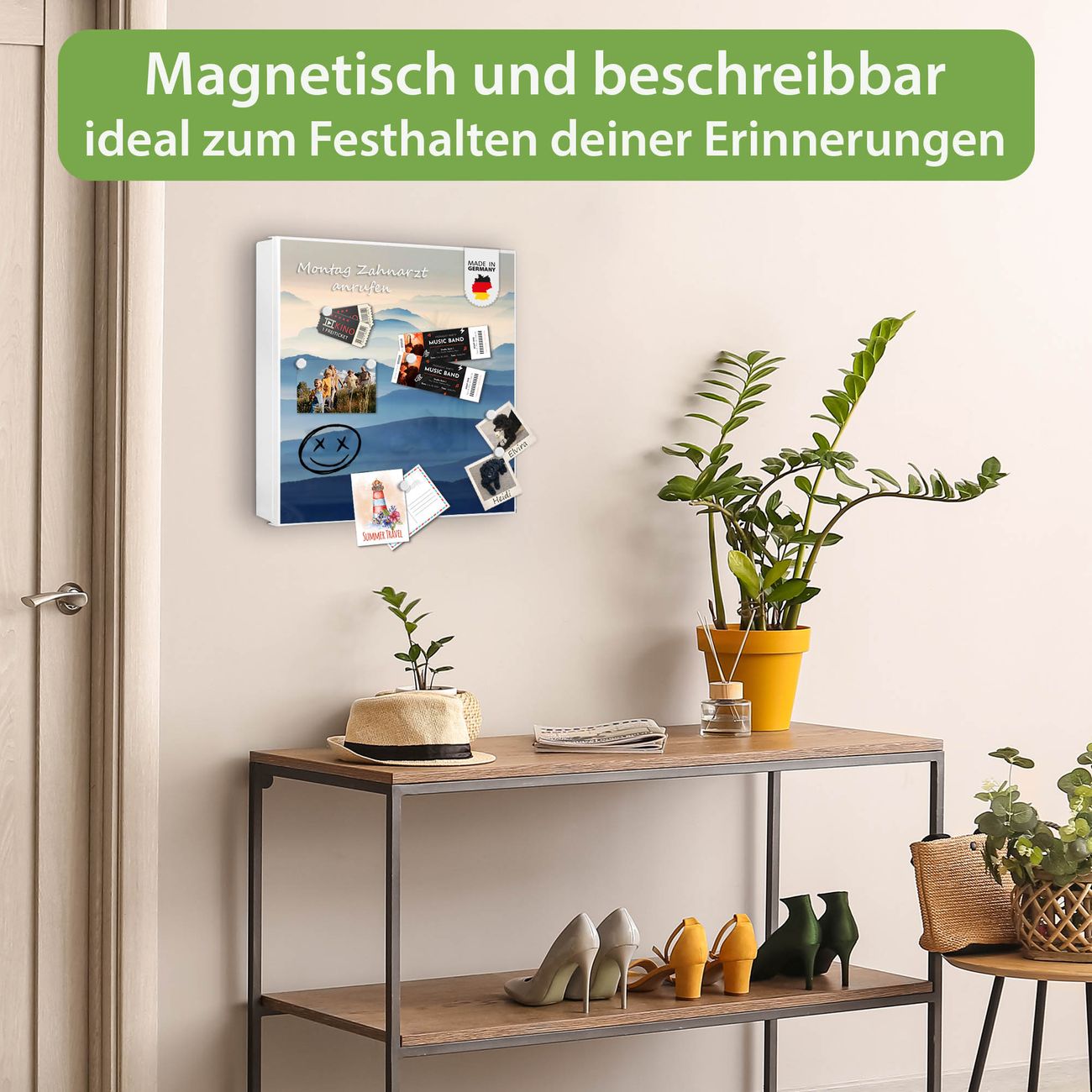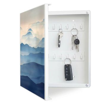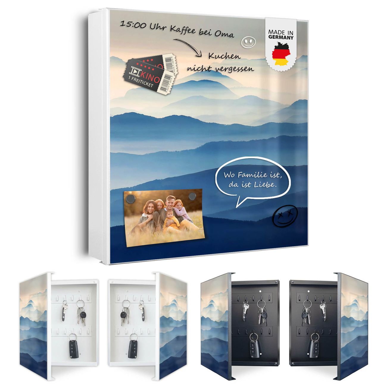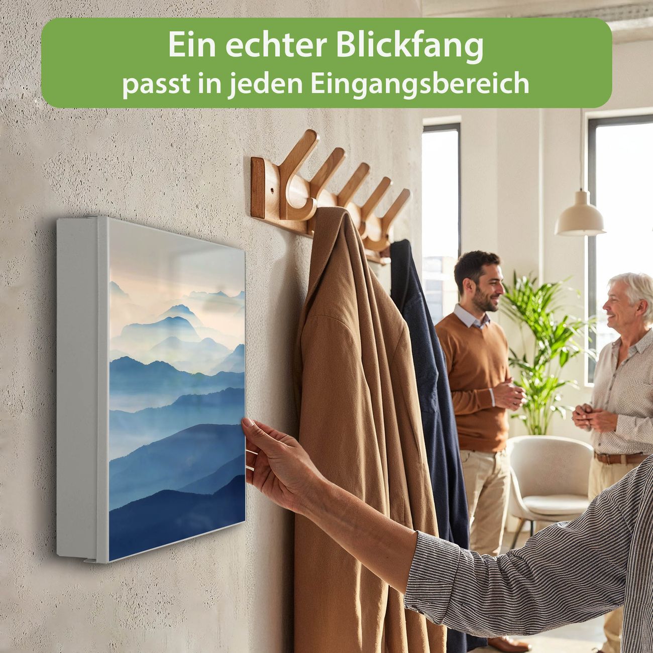 Bringe Ordnung und Eleganz in deinen Eingangsbereich mit dem banjado Schlüsselkasten Motiv Motiv Hinter den Bergen. Die moderne Schlüsselbox kombiniert funktionales Design mit hochwertiger Verarbeitung und wird so zu einem echten Hingucker in Flur, Büro oder Ferienwohnung. ✅ Stilvolle Schlüsselaufbewahrung mit Motiv Motiv Hinter den Bergen Der Design-Schlüsselkasten Motiv Motiv Hinter den Bergen bietet Platz für bis zu 32 Schlüssel, die auf 4 stabilen Reihen mit je 8 Haken übersichtlich verstaut werden. Mit seinen kompakten Maßen von 30 x 30 x 5 cm passt die Schlüsselbox perfekt auch in kleinere Räume. Der weiß lackierte Stahlkorpus mit links angeschlagenem Türscharnier harmoniert mit gedruckten Folie auf der Front und fügt sich nahtlos in jedes Wohnambiente ein. Ob als Schlüsselorganizer für Zuhause oder als praktische Lösung für Büros, Praxen und Gewerbe, der banjado Schlüsselkasten sorgt für Ordnung und Übersicht. Dank der magnetischen, mit Kreidestiften beschreibbaren Folie auf der Front kannst du Notizen anheften oder Termine direkt auf der Oberfläche festhalten. Die Schlüsselbox Motiv Motiv Hinter den Bergen zur Wandmontage wird inklusive Befestigungsmaterial geliefert und ist schnell angebracht. So hast du deine Schlüssel jederzeit griffbereit und zugleich stilvoll verstaut. Mit diesem banjado Schlüsselkasten Motiv Motiv Hinter den Bergen kombinierst du praktische Aufbewahrung mit stilvollem Wohndesign. Ob privat oder geschäftlich, die Schlüsselbox sorgt für mehr Ordnung, Übersicht und ein wohnliches Ambiente.Vorteile im Überblick