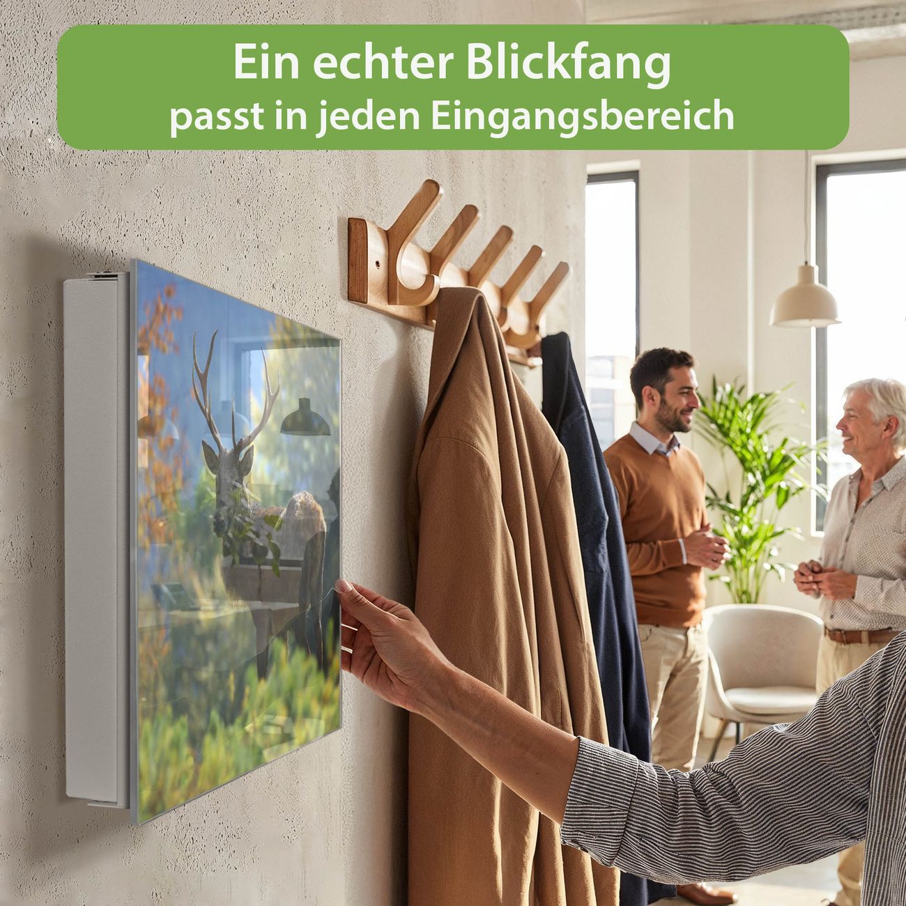 Bringe Ordnung und Eleganz in deinen Eingangsbereich mit dem banjado Schlüsselkasten Motiv Motiv Hirsch. Die moderne Schlüsselbox kombiniert funktionales Design mit hochwertiger Verarbeitung und wird so zu einem echten Hingucker in Flur, Büro oder Ferienwohnung. ✅ Stilvolle Schlüsselaufbewahrung mit Glasfront im Motiv Motiv Hirsch Der Design-Schlüsselkasten Motiv Motiv Hirsch bietet Platz für bis zu 50 Schlüssel, die auf 5 stabilen Reihen mit je 10 Haken übersichtlich verstaut werden. Mit seinen kompakten Maßen von 30 x 30 x 5 cm passt die Schlüsselbox perfekt auch in kleinere Räume. Der weiß lackierte Stahlkorpus mit rechts angeschlagenem Türscharnier harmoniert mit der Glasfront und fügt sich nahtlos in jedes Wohnambiente ein. Ob als Schlüsselorganizer für Zuhause oder als praktische Lösung für Büros, Praxen und Gewerbe, der banjado Schlüsselkasten sorgt für Ordnung und Übersicht. Dank der magnetischen, mit Kreidestiften beschreibbaren Glasfront kannst du Notizen anheften oder Termine direkt auf der Oberfläche festhalten. Die Schlüsselbox Motiv Motiv Hirsch zur Wandmontage wird inklusive Befestigungsmaterial geliefert und ist schnell angebracht. So hast du deine Schlüssel jederzeit griffbereit und zugleich stilvoll verstaut. Mit diesem banjado Schlüsselkasten Motiv Motiv Hirsch kombinierst du praktische Aufbewahrung mit stilvollem Wohndesign. Ob privat oder geschäftlich, die Schlüsselbox sorgt für mehr Ordnung, Übersicht und ein wohnliches Ambiente.Vorteile im Überblick