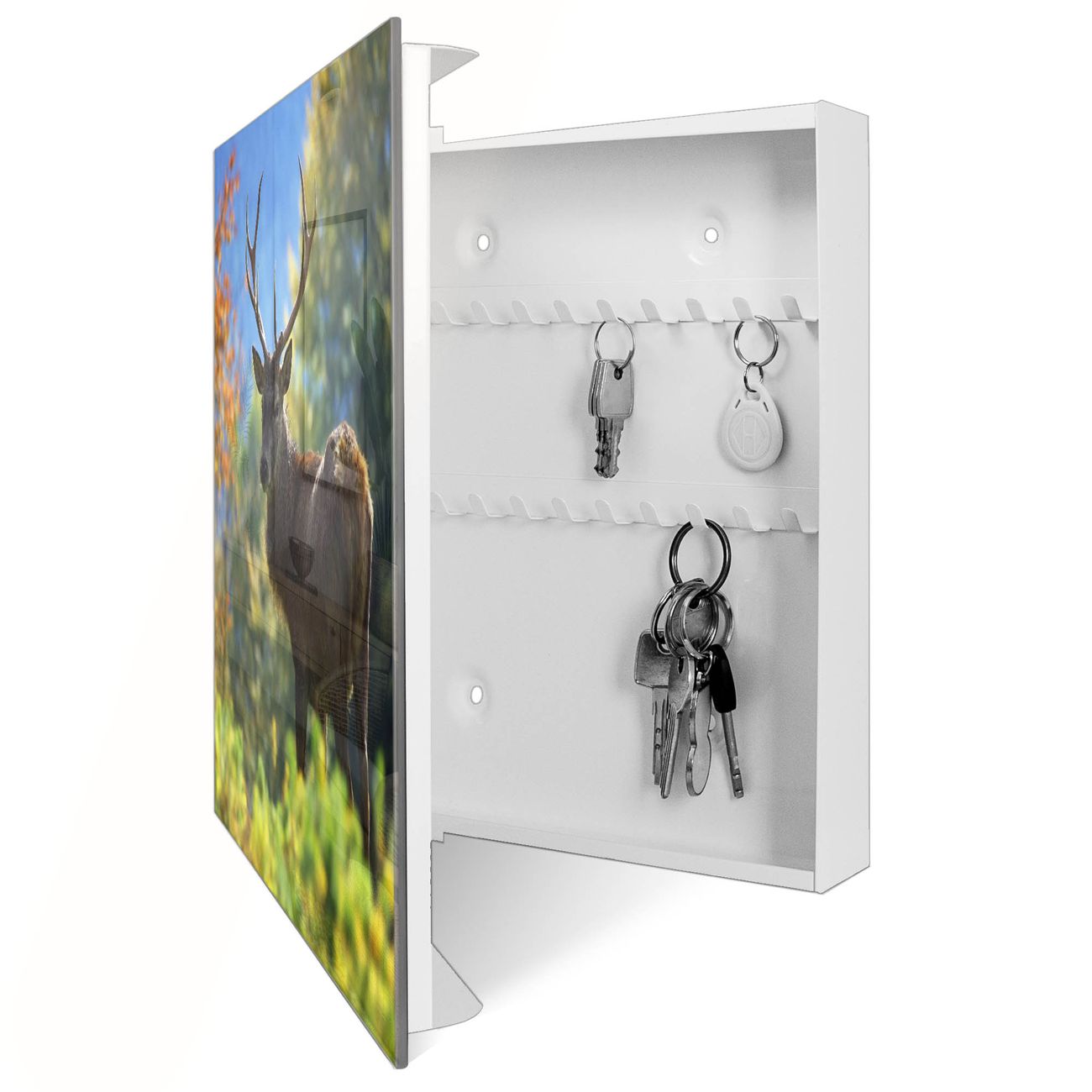 Bringe Ordnung und Eleganz in deinen Eingangsbereich mit dem banjado Schlüsselkasten Motiv Motiv Hirsch. Die moderne Schlüsselbox kombiniert funktionales Design mit hochwertiger Verarbeitung und wird so zu einem echten Hingucker in Flur, Büro oder Ferienwohnung. ✅ Stilvolle Schlüsselaufbewahrung mit Glasfront im Motiv Motiv Hirsch Der Design-Schlüsselkasten Motiv Motiv Hirsch bietet Platz für bis zu 50 Schlüssel, die auf 5 stabilen Reihen mit je 10 Haken übersichtlich verstaut werden. Mit seinen kompakten Maßen von 30 x 30 x 5 cm passt die Schlüsselbox perfekt auch in kleinere Räume. Der weiß lackierte Stahlkorpus mit rechts angeschlagenem Türscharnier harmoniert mit der Glasfront und fügt sich nahtlos in jedes Wohnambiente ein. Ob als Schlüsselorganizer für Zuhause oder als praktische Lösung für Büros, Praxen und Gewerbe, der banjado Schlüsselkasten sorgt für Ordnung und Übersicht. Dank der magnetischen, mit Kreidestiften beschreibbaren Glasfront kannst du Notizen anheften oder Termine direkt auf der Oberfläche festhalten. Die Schlüsselbox Motiv Motiv Hirsch zur Wandmontage wird inklusive Befestigungsmaterial geliefert und ist schnell angebracht. So hast du deine Schlüssel jederzeit griffbereit und zugleich stilvoll verstaut. Mit diesem banjado Schlüsselkasten Motiv Motiv Hirsch kombinierst du praktische Aufbewahrung mit stilvollem Wohndesign. Ob privat oder geschäftlich, die Schlüsselbox sorgt für mehr Ordnung, Übersicht und ein wohnliches Ambiente.Vorteile im Überblick