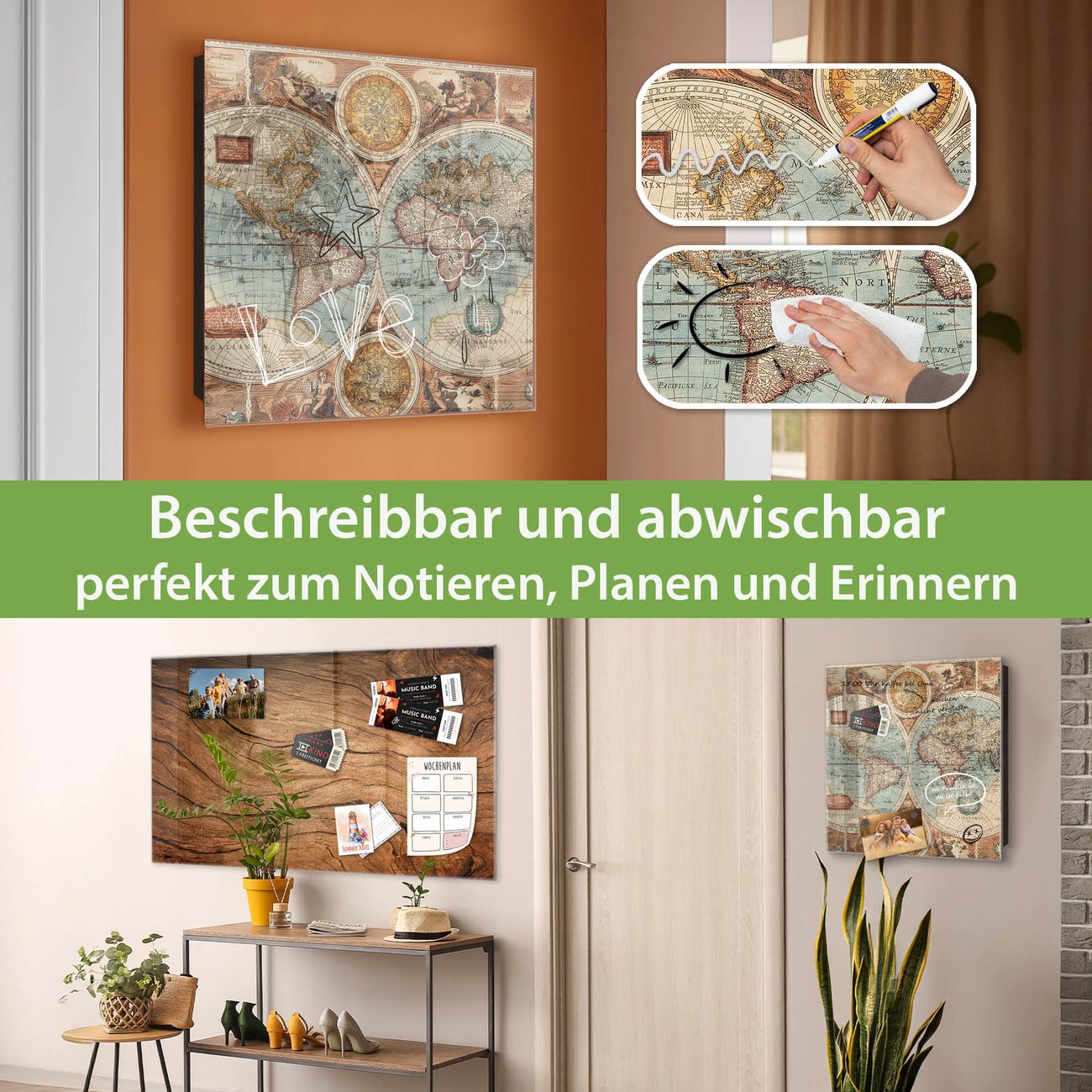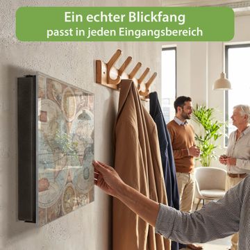Bringe Ordnung und Eleganz in deinen Eingangsbereich mit dem banjado Schlüsselkasten Motiv Motiv Historische Weltkarte. Die moderne Schlüsselbox kombiniert funktionales Design mit hochwertiger Verarbeitung und wird so zu einem echten Hingucker in Flur, Büro oder Ferienwohnung. ✅ Stilvolle Schlüsselaufbewahrung mit Glasfront im Motiv Motiv Historische Weltkarte Der Design-Schlüsselkasten Motiv Motiv Historische Weltkarte bietet Platz für bis zu 50 Schlüssel, die auf 5 stabilen Reihen mit je 10 Haken übersichtlich verstaut werden. Mit seinen kompakten Maßen von 30 x 30 x 5 cm passt die Schlüsselbox perfekt auch in kleinere Räume. Der schwarz lackierte Stahlkorpus mit rechts angeschlagenem Türscharnier harmoniert mit der Glasfront und fügt sich nahtlos in jedes Wohnambiente ein. Ob als Schlüsselorganizer für Zuhause oder als praktische Lösung für Büros, Praxen und Gewerbe, der banjado Schlüsselkasten sorgt für Ordnung und Übersicht. Dank der magnetischen, mit Kreidestiften beschreibbaren Glasfront kannst du Notizen anheften oder Termine direkt auf der Oberfläche festhalten. Die Schlüsselbox Motiv Motiv Historische Weltkarte zur Wandmontage wird inklusive Befestigungsmaterial geliefert und ist schnell angebracht. So hast du deine Schlüssel jederzeit griffbereit und zugleich stilvoll verstaut. Mit diesem banjado Schlüsselkasten Motiv Motiv Historische Weltkarte kombinierst du praktische Aufbewahrung mit stilvollem Wohndesign. Ob privat oder geschäftlich, die Schlüsselbox sorgt für mehr Ordnung, Übersicht und ein wohnliches Ambiente.Vorteile im Überblick