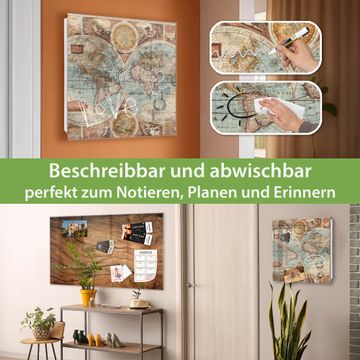 Bringe Ordnung und Eleganz in deinen Eingangsbereich mit dem banjado Schlüsselkasten Motiv Motiv Historische Weltkarte. Die moderne Schlüsselbox kombiniert funktionales Design mit hochwertiger Verarbeitung und wird so zu einem echten Hingucker in Flur, Büro oder Ferienwohnung. ✅ Stilvolle Schlüsselaufbewahrung mit Glasfront im Motiv Motiv Historische Weltkarte Der Design-Schlüsselkasten Motiv Motiv Historische Weltkarte bietet Platz für bis zu 50 Schlüssel, die auf 5 stabilen Reihen mit je 10 Haken übersichtlich verstaut werden. Mit seinen kompakten Maßen von 30 x 30 x 5 cm passt die Schlüsselbox perfekt auch in kleinere Räume. Der weiß lackierte Stahlkorpus mit rechts angeschlagenem Türscharnier harmoniert mit der Glasfront und fügt sich nahtlos in jedes Wohnambiente ein. Ob als Schlüsselorganizer für Zuhause oder als praktische Lösung für Büros, Praxen und Gewerbe, der banjado Schlüsselkasten sorgt für Ordnung und Übersicht. Dank der magnetischen, mit Kreidestiften beschreibbaren Glasfront kannst du Notizen anheften oder Termine direkt auf der Oberfläche festhalten. Die Schlüsselbox Motiv Motiv Historische Weltkarte zur Wandmontage wird inklusive Befestigungsmaterial geliefert und ist schnell angebracht. So hast du deine Schlüssel jederzeit griffbereit und zugleich stilvoll verstaut. Mit diesem banjado Schlüsselkasten Motiv Motiv Historische Weltkarte kombinierst du praktische Aufbewahrung mit stilvollem Wohndesign. Ob privat oder geschäftlich, die Schlüsselbox sorgt für mehr Ordnung, Übersicht und ein wohnliches Ambiente.Vorteile im Überblick