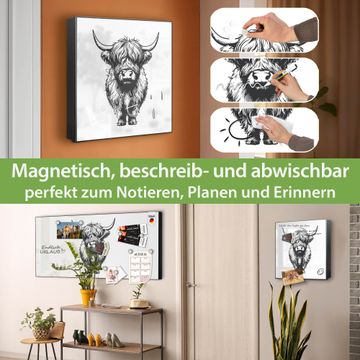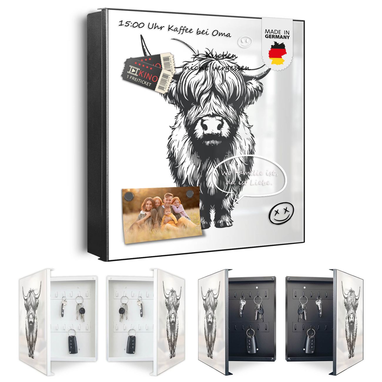 Bringe Ordnung und Eleganz in deinen Eingangsbereich mit dem banjado Schlüsselkasten Motiv Motiv Hochlandrind. Die moderne Schlüsselbox kombiniert funktionales Design mit hochwertiger Verarbeitung und wird so zu einem echten Hingucker in Flur, Büro oder Ferienwohnung. ✅ Stilvolle Schlüsselaufbewahrung mit Motiv Motiv Hochlandrind Der Design-Schlüsselkasten Motiv Motiv Hochlandrind bietet Platz für bis zu 32 Schlüssel, die auf 4 stabilen Reihen mit je 8 Haken übersichtlich verstaut werden. Mit seinen kompakten Maßen von 30 x 30 x 5 cm passt die Schlüsselbox perfekt auch in kleinere Räume. Der schwarz lackierte Stahlkorpus mit rechts angeschlagenem Türscharnier harmoniert mit gedruckten Folie auf der Front und fügt sich nahtlos in jedes Wohnambiente ein. Ob als Schlüsselorganizer für Zuhause oder als praktische Lösung für Büros, Praxen und Gewerbe, der banjado Schlüsselkasten sorgt für Ordnung und Übersicht. Dank der magnetischen, mit Kreidestiften beschreibbaren Folie auf der Front kannst du Notizen anheften oder Termine direkt auf der Oberfläche festhalten. Die Schlüsselbox Motiv Motiv Hochlandrind zur Wandmontage wird inklusive Befestigungsmaterial geliefert und ist schnell angebracht. So hast du deine Schlüssel jederzeit griffbereit und zugleich stilvoll verstaut. Mit diesem banjado Schlüsselkasten Motiv Motiv Hochlandrind kombinierst du praktische Aufbewahrung mit stilvollem Wohndesign. Ob privat oder geschäftlich, die Schlüsselbox sorgt für mehr Ordnung, Übersicht und ein wohnliches Ambiente.Vorteile im Überblick