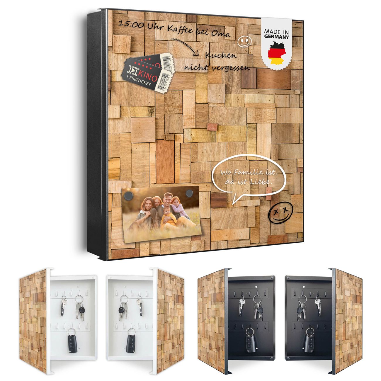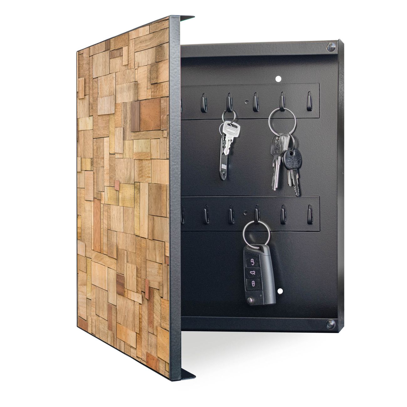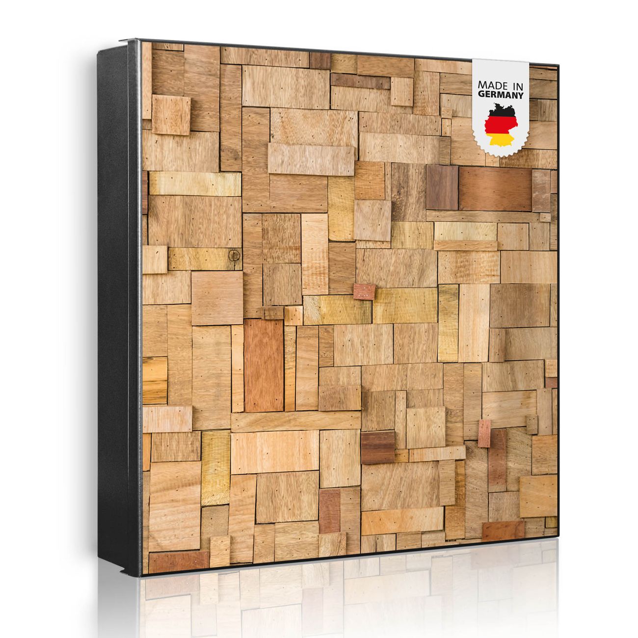 Bringe Ordnung und Eleganz in deinen Eingangsbereich mit dem banjado Schlüsselkasten Motiv Motiv Hölzernes Flickwerk. Die moderne Schlüsselbox kombiniert funktionales Design mit hochwertiger Verarbeitung und wird so zu einem echten Hingucker in Flur, Büro oder Ferienwohnung. ✅ Stilvolle Schlüsselaufbewahrung mit Motiv Motiv Hölzernes Flickwerk Der Design-Schlüsselkasten Motiv Motiv Hölzernes Flickwerk bietet Platz für bis zu 32 Schlüssel, die auf 4 stabilen Reihen mit je 8 Haken übersichtlich verstaut werden. Mit seinen kompakten Maßen von 30 x 30 x 5 cm passt die Schlüsselbox perfekt auch in kleinere Räume. Der schwarz lackierte Stahlkorpus mit links angeschlagenem Türscharnier harmoniert mit gedruckten Folie auf der Front und fügt sich nahtlos in jedes Wohnambiente ein. Ob als Schlüsselorganizer für Zuhause oder als praktische Lösung für Büros, Praxen und Gewerbe, der banjado Schlüsselkasten sorgt für Ordnung und Übersicht. Dank der magnetischen, mit Kreidestiften beschreibbaren Folie auf der Front kannst du Notizen anheften oder Termine direkt auf der Oberfläche festhalten. Die Schlüsselbox Motiv Motiv Hölzernes Flickwerk zur Wandmontage wird inklusive Befestigungsmaterial geliefert und ist schnell angebracht. So hast du deine Schlüssel jederzeit griffbereit und zugleich stilvoll verstaut. Mit diesem banjado Schlüsselkasten Motiv Motiv Hölzernes Flickwerk kombinierst du praktische Aufbewahrung mit stilvollem Wohndesign. Ob privat oder geschäftlich, die Schlüsselbox sorgt für mehr Ordnung, Übersicht und ein wohnliches Ambiente.Vorteile im Überblick