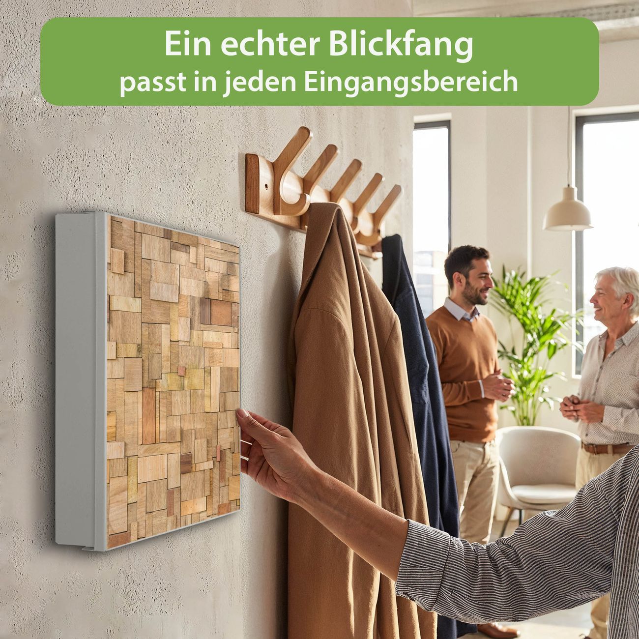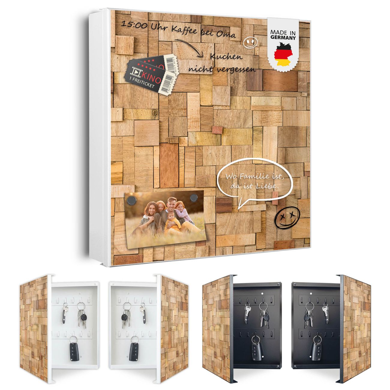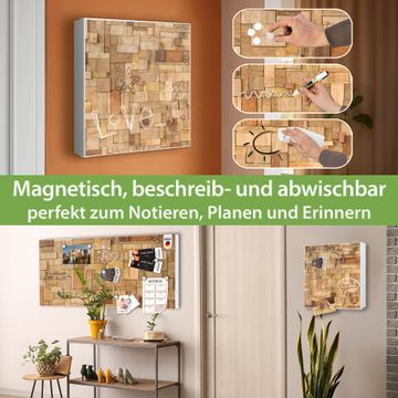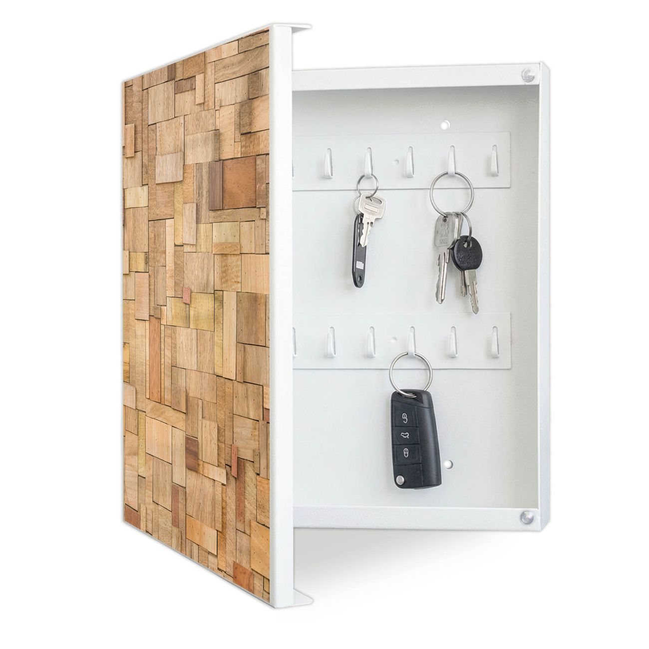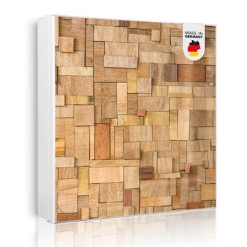 Bringe Ordnung und Eleganz in deinen Eingangsbereich mit dem banjado Schlüsselkasten Motiv Motiv Hölzernes Flickwerk. Die moderne Schlüsselbox kombiniert funktionales Design mit hochwertiger Verarbeitung und wird so zu einem echten Hingucker in Flur, Büro oder Ferienwohnung. ✅ Stilvolle Schlüsselaufbewahrung mit Motiv Motiv Hölzernes Flickwerk Der Design-Schlüsselkasten Motiv Motiv Hölzernes Flickwerk bietet Platz für bis zu 32 Schlüssel, die auf 4 stabilen Reihen mit je 8 Haken übersichtlich verstaut werden. Mit seinen kompakten Maßen von 30 x 30 x 5 cm passt die Schlüsselbox perfekt auch in kleinere Räume. Der weiß lackierte Stahlkorpus mit links angeschlagenem Türscharnier harmoniert mit gedruckten Folie auf der Front und fügt sich nahtlos in jedes Wohnambiente ein. Ob als Schlüsselorganizer für Zuhause oder als praktische Lösung für Büros, Praxen und Gewerbe, der banjado Schlüsselkasten sorgt für Ordnung und Übersicht. Dank der magnetischen, mit Kreidestiften beschreibbaren Folie auf der Front kannst du Notizen anheften oder Termine direkt auf der Oberfläche festhalten. Die Schlüsselbox Motiv Motiv Hölzernes Flickwerk zur Wandmontage wird inklusive Befestigungsmaterial geliefert und ist schnell angebracht. So hast du deine Schlüssel jederzeit griffbereit und zugleich stilvoll verstaut. Mit diesem banjado Schlüsselkasten Motiv Motiv Hölzernes Flickwerk kombinierst du praktische Aufbewahrung mit stilvollem Wohndesign. Ob privat oder geschäftlich, die Schlüsselbox sorgt für mehr Ordnung, Übersicht und ein wohnliches Ambiente.Vorteile im Überblick
