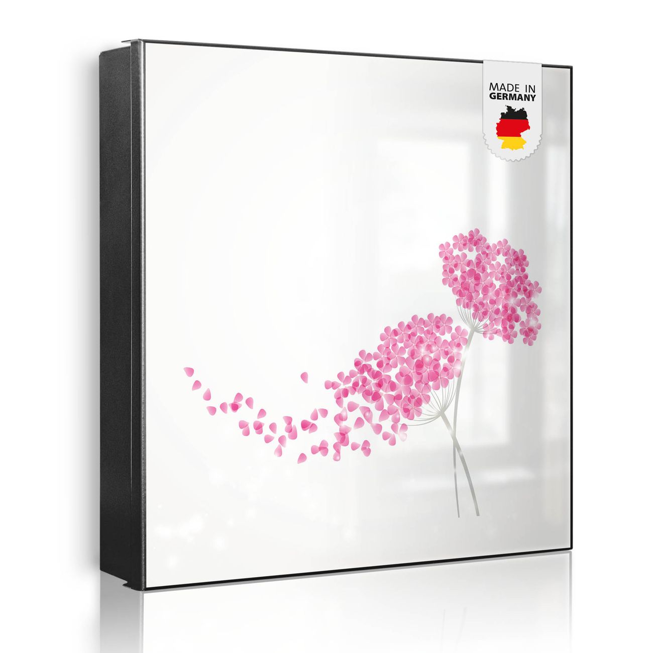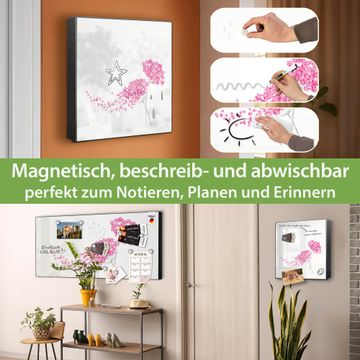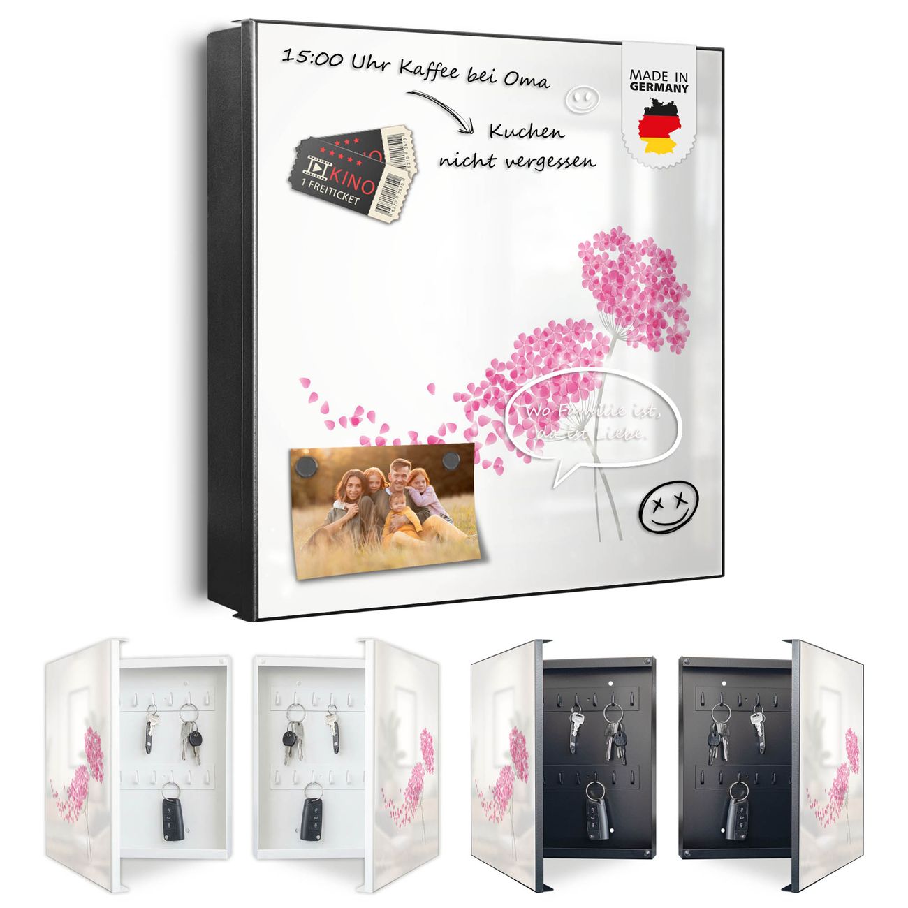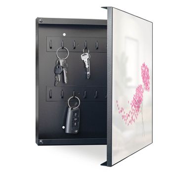 Bringe Ordnung und Eleganz in deinen Eingangsbereich mit dem banjado Schlüsselkasten Motiv Motiv Holunder Pink. Die moderne Schlüsselbox kombiniert funktionales Design mit hochwertiger Verarbeitung und wird so zu einem echten Hingucker in Flur, Büro oder Ferienwohnung. ✅ Stilvolle Schlüsselaufbewahrung mit Motiv Motiv Holunder Pink Der Design-Schlüsselkasten Motiv Motiv Holunder Pink bietet Platz für bis zu 32 Schlüssel, die auf 4 stabilen Reihen mit je 8 Haken übersichtlich verstaut werden. Mit seinen kompakten Maßen von 30 x 30 x 5 cm passt die Schlüsselbox perfekt auch in kleinere Räume. Der schwarz lackierte Stahlkorpus mit rechts angeschlagenem Türscharnier harmoniert mit gedruckten Folie auf der Front und fügt sich nahtlos in jedes Wohnambiente ein. Ob als Schlüsselorganizer für Zuhause oder als praktische Lösung für Büros, Praxen und Gewerbe, der banjado Schlüsselkasten sorgt für Ordnung und Übersicht. Dank der magnetischen, mit Kreidestiften beschreibbaren Folie auf der Front kannst du Notizen anheften oder Termine direkt auf der Oberfläche festhalten. Die Schlüsselbox Motiv Motiv Holunder Pink zur Wandmontage wird inklusive Befestigungsmaterial geliefert und ist schnell angebracht. So hast du deine Schlüssel jederzeit griffbereit und zugleich stilvoll verstaut. Mit diesem banjado Schlüsselkasten Motiv Motiv Holunder Pink kombinierst du praktische Aufbewahrung mit stilvollem Wohndesign. Ob privat oder geschäftlich, die Schlüsselbox sorgt für mehr Ordnung, Übersicht und ein wohnliches Ambiente.Vorteile im Überblick