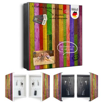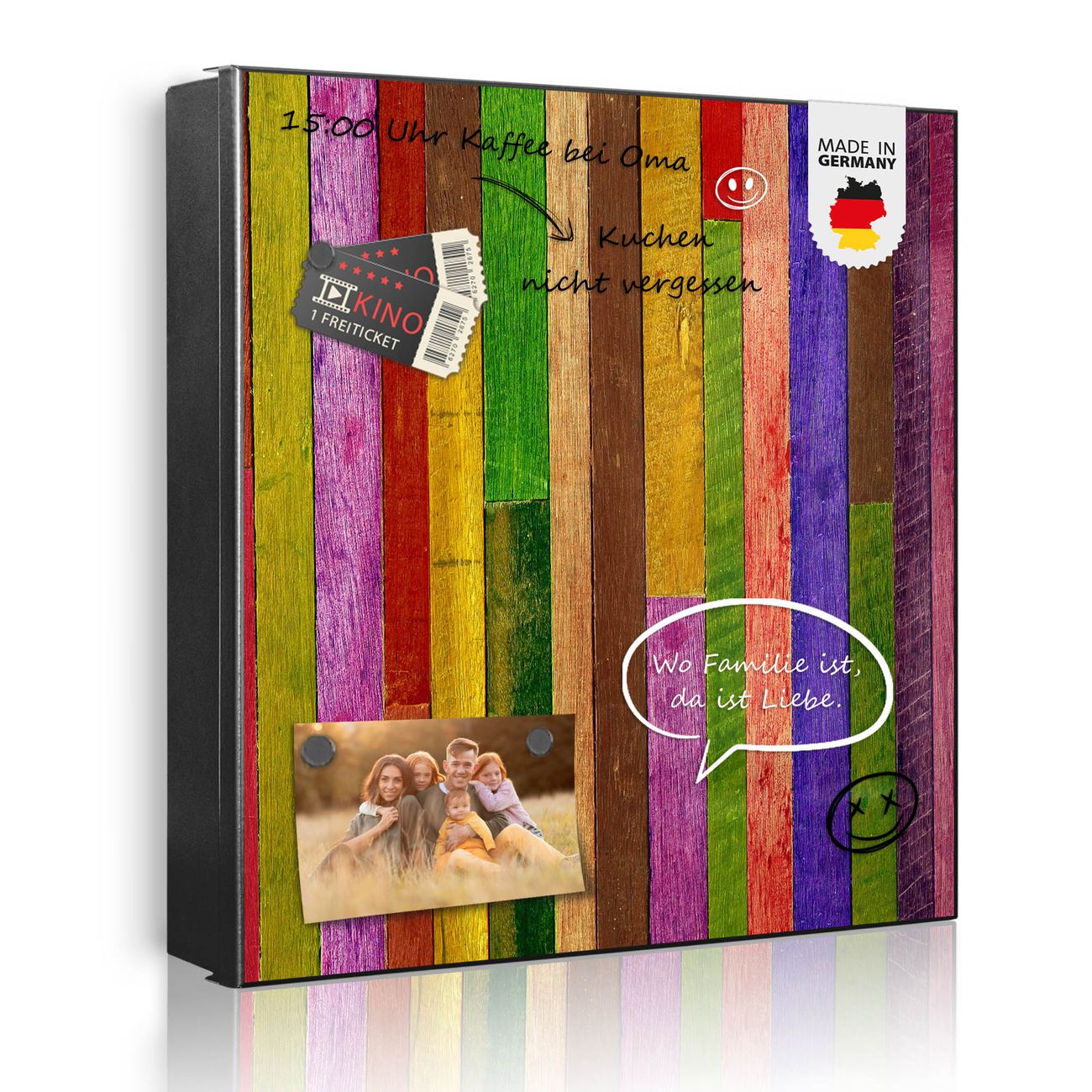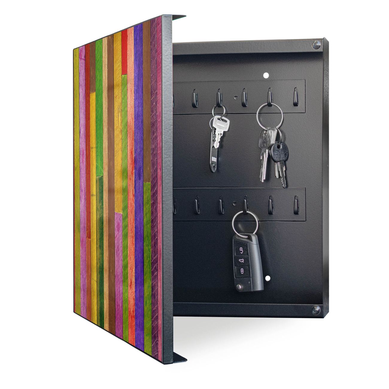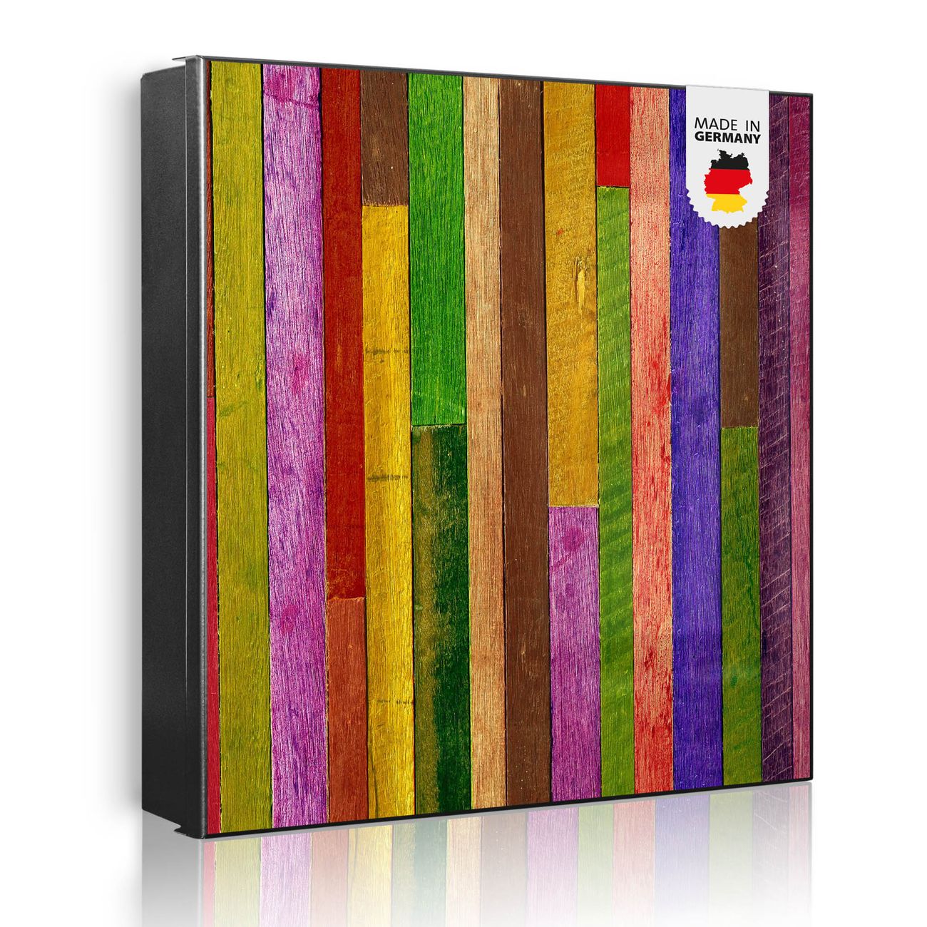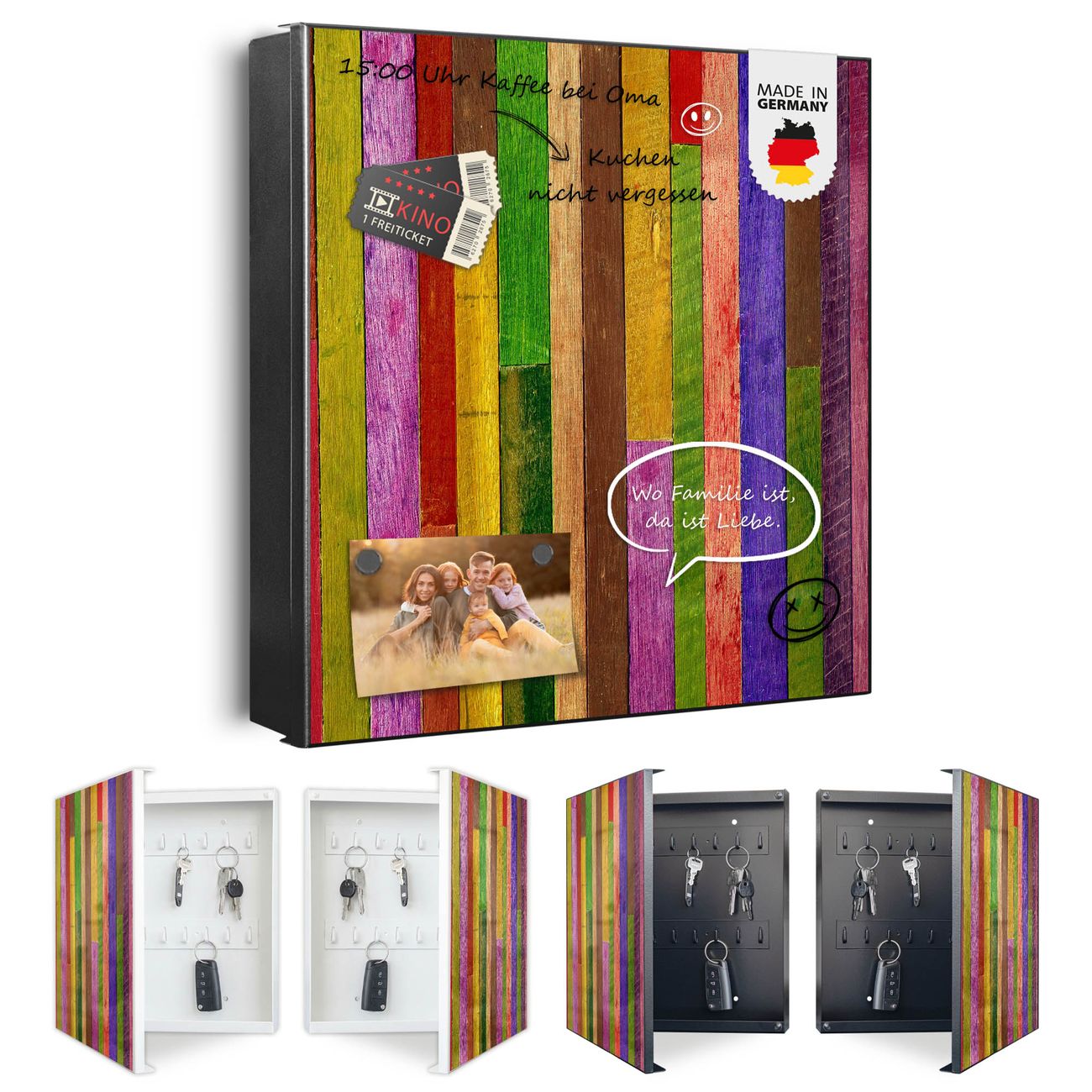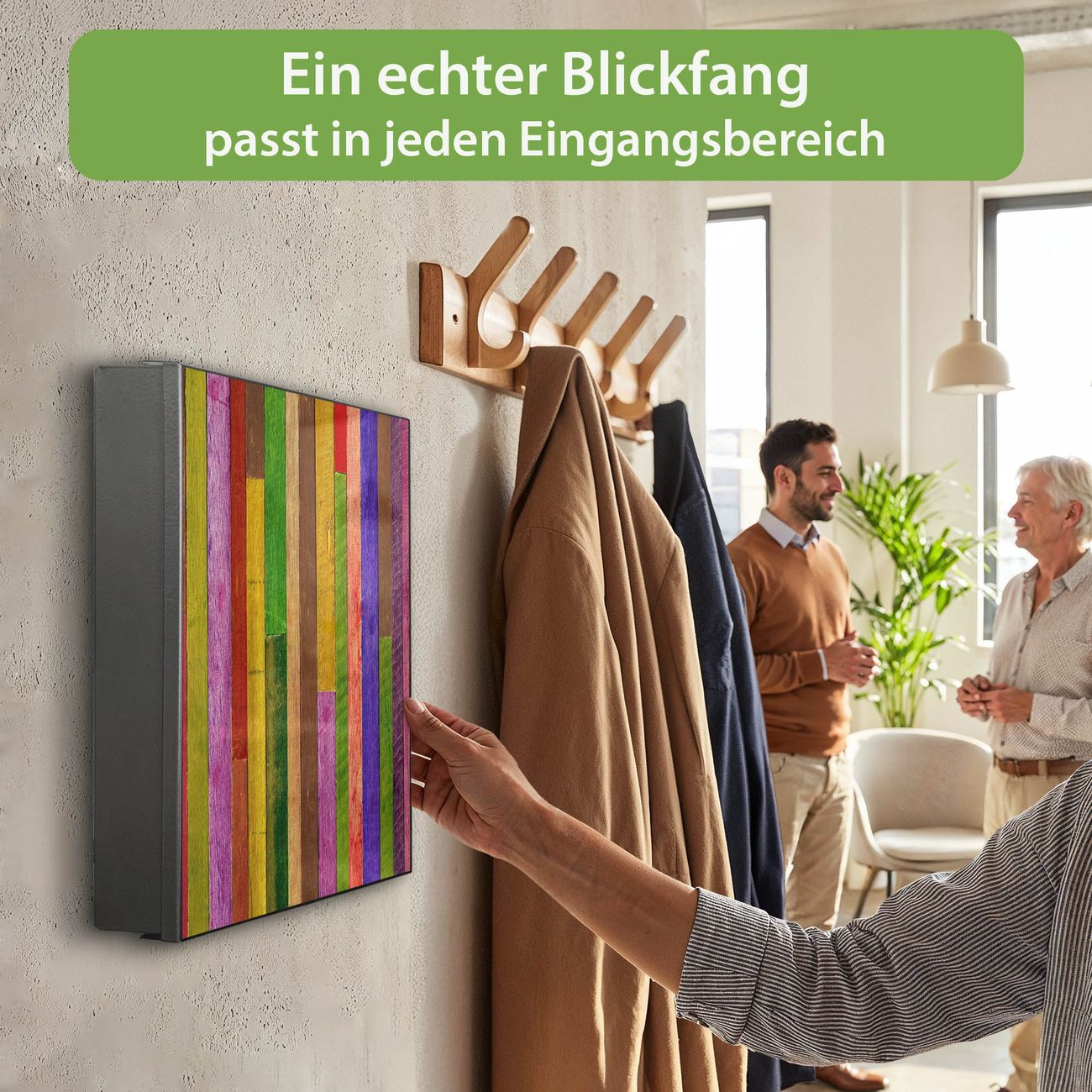 Bringe Ordnung und Eleganz in deinen Eingangsbereich mit dem banjado Schlüsselkasten Motiv Motiv Holz Collage Bunt. Die moderne Schlüsselbox kombiniert funktionales Design mit hochwertiger Verarbeitung und wird so zu einem echten Hingucker in Flur, Büro oder Ferienwohnung. ✅ Stilvolle Schlüsselaufbewahrung mit Motiv Motiv Holz Collage Bunt Der Design-Schlüsselkasten Motiv Motiv Holz Collage Bunt bietet Platz für bis zu 32 Schlüssel, die auf 4 stabilen Reihen mit je 8 Haken übersichtlich verstaut werden. Mit seinen kompakten Maßen von 30 x 30 x 5 cm passt die Schlüsselbox perfekt auch in kleinere Räume. Der schwarz lackierte Stahlkorpus mit links angeschlagenem Türscharnier harmoniert mit gedruckten Folie auf der Front und fügt sich nahtlos in jedes Wohnambiente ein. Ob als Schlüsselorganizer für Zuhause oder als praktische Lösung für Büros, Praxen und Gewerbe, der banjado Schlüsselkasten sorgt für Ordnung und Übersicht. Dank der magnetischen, mit Kreidestiften beschreibbaren Folie auf der Front kannst du Notizen anheften oder Termine direkt auf der Oberfläche festhalten. Die Schlüsselbox Motiv Motiv Holz Collage Bunt zur Wandmontage wird inklusive Befestigungsmaterial geliefert und ist schnell angebracht. So hast du deine Schlüssel jederzeit griffbereit und zugleich stilvoll verstaut. Mit diesem banjado Schlüsselkasten Motiv Motiv Holz Collage Bunt kombinierst du praktische Aufbewahrung mit stilvollem Wohndesign. Ob privat oder geschäftlich, die Schlüsselbox sorgt für mehr Ordnung, Übersicht und ein wohnliches Ambiente.Vorteile im Überblick