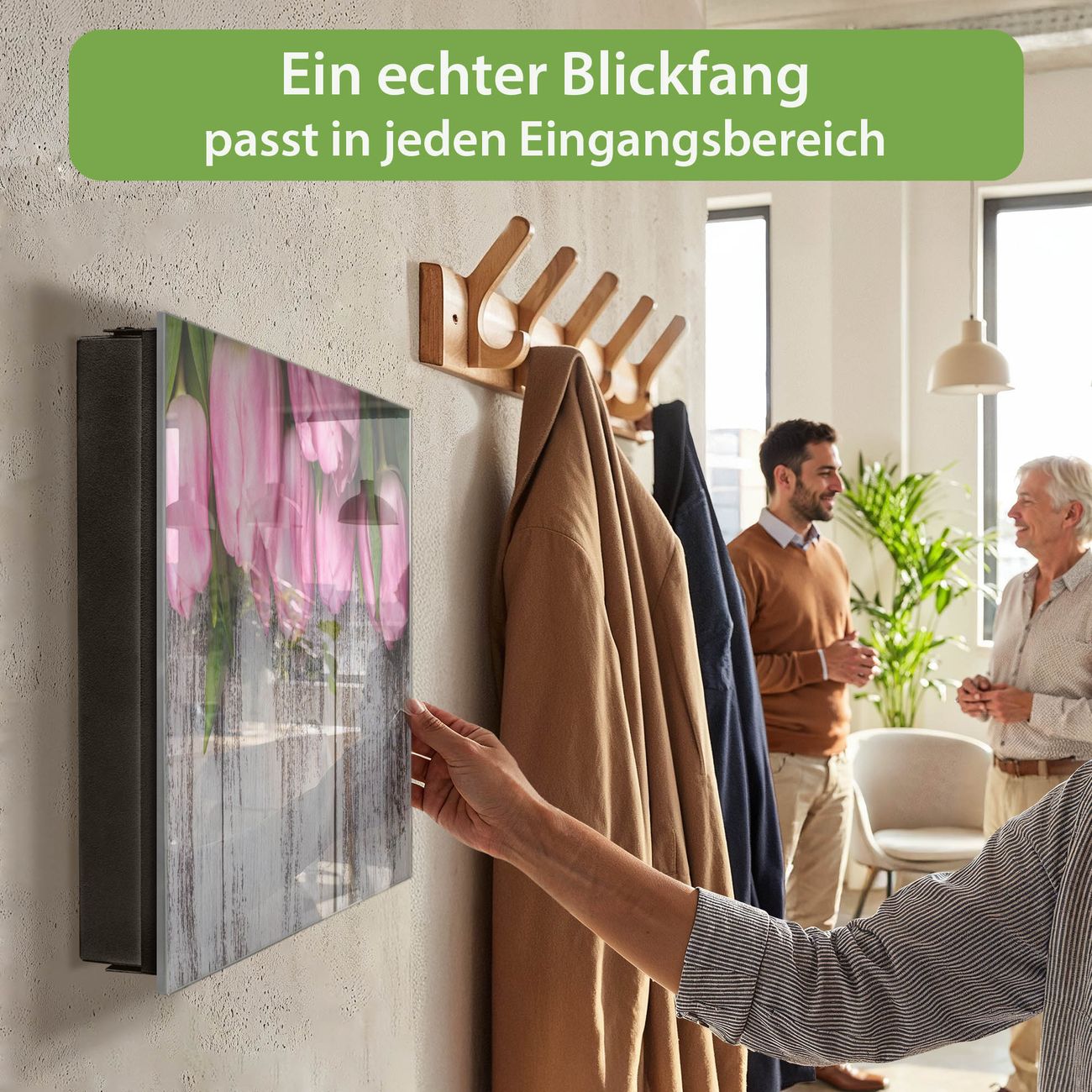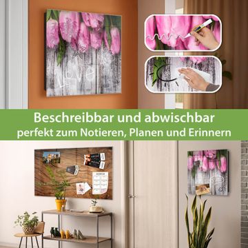 Bringe Ordnung und Eleganz in deinen Eingangsbereich mit dem banjado Schlüsselkasten Motiv Motiv Holz und Tulpen. Die moderne Schlüsselbox kombiniert funktionales Design mit hochwertiger Verarbeitung und wird so zu einem echten Hingucker in Flur, Büro oder Ferienwohnung. ✅ Stilvolle Schlüsselaufbewahrung mit Glasfront im Motiv Motiv Holz und Tulpen Der Design-Schlüsselkasten Motiv Motiv Holz und Tulpen bietet Platz für bis zu 50 Schlüssel, die auf 5 stabilen Reihen mit je 10 Haken übersichtlich verstaut werden. Mit seinen kompakten Maßen von 30 x 30 x 5 cm passt die Schlüsselbox perfekt auch in kleinere Räume. Der schwarz lackierte Stahlkorpus mit rechts angeschlagenem Türscharnier harmoniert mit der Glasfront und fügt sich nahtlos in jedes Wohnambiente ein. Ob als Schlüsselorganizer für Zuhause oder als praktische Lösung für Büros, Praxen und Gewerbe, der banjado Schlüsselkasten sorgt für Ordnung und Übersicht. Dank der magnetischen, mit Kreidestiften beschreibbaren Glasfront kannst du Notizen anheften oder Termine direkt auf der Oberfläche festhalten. Die Schlüsselbox Motiv Motiv Holz und Tulpen zur Wandmontage wird inklusive Befestigungsmaterial geliefert und ist schnell angebracht. So hast du deine Schlüssel jederzeit griffbereit und zugleich stilvoll verstaut. Mit diesem banjado Schlüsselkasten Motiv Motiv Holz und Tulpen kombinierst du praktische Aufbewahrung mit stilvollem Wohndesign. Ob privat oder geschäftlich, die Schlüsselbox sorgt für mehr Ordnung, Übersicht und ein wohnliches Ambiente.Vorteile im Überblick