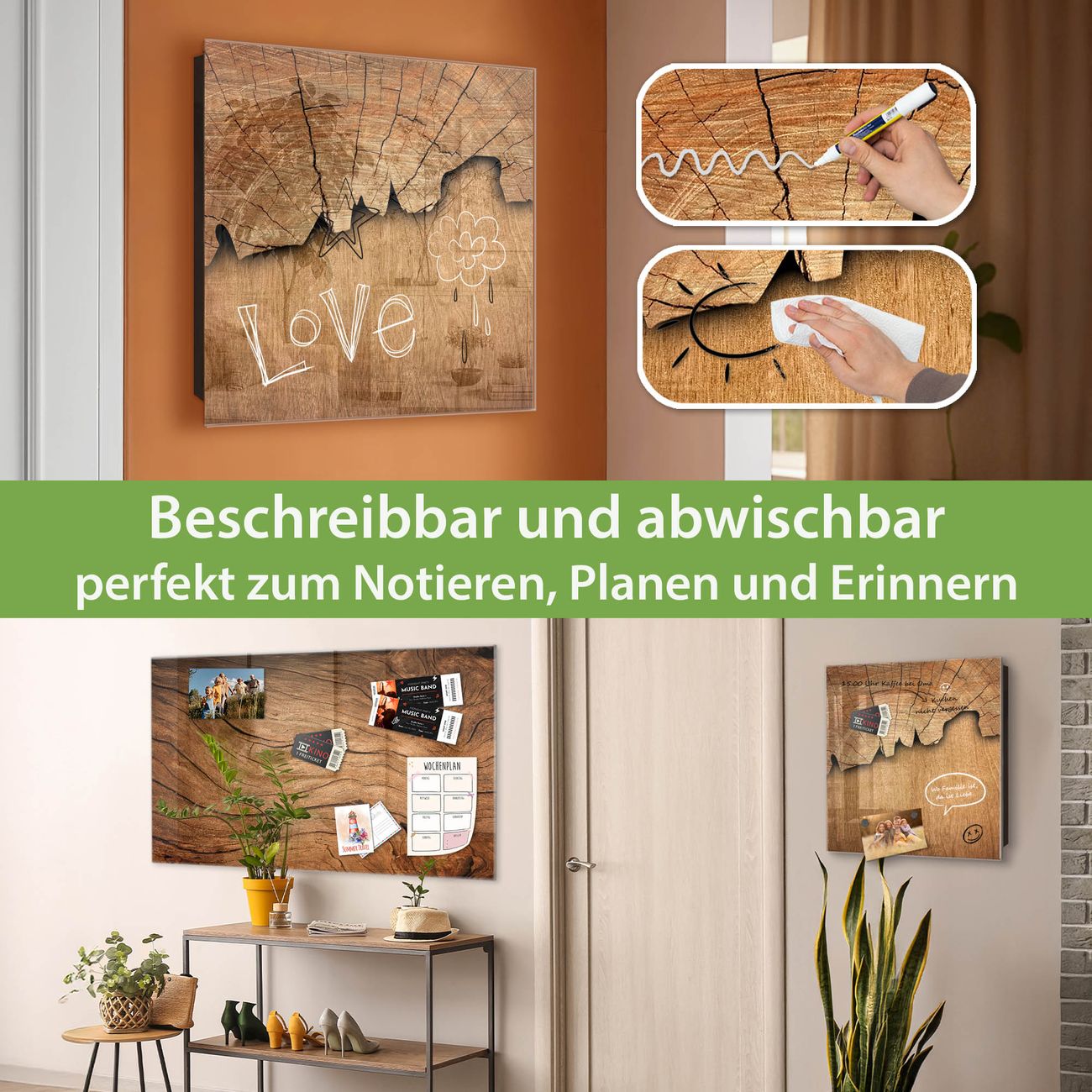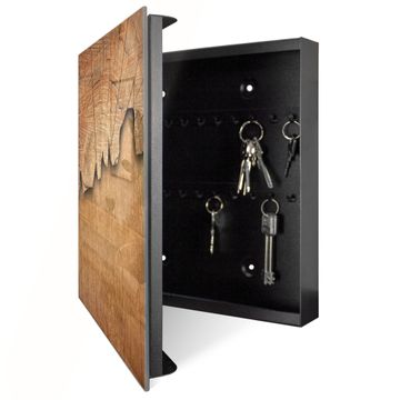 Bringe Ordnung und Eleganz in deinen Eingangsbereich mit dem banjado Schlüsselkasten Motiv Motiv Holz. Die moderne Schlüsselbox kombiniert funktionales Design mit hochwertiger Verarbeitung und wird so zu einem echten Hingucker in Flur, Büro oder Ferienwohnung. ✅ Stilvolle Schlüsselaufbewahrung mit Glasfront im Motiv Motiv Holz Der Design-Schlüsselkasten Motiv Motiv Holz bietet Platz für bis zu 50 Schlüssel, die auf 5 stabilen Reihen mit je 10 Haken übersichtlich verstaut werden. Mit seinen kompakten Maßen von 30 x 30 x 5 cm passt die Schlüsselbox perfekt auch in kleinere Räume. Der schwarz lackierte Stahlkorpus mit rechts angeschlagenem Türscharnier harmoniert mit der Glasfront und fügt sich nahtlos in jedes Wohnambiente ein. Ob als Schlüsselorganizer für Zuhause oder als praktische Lösung für Büros, Praxen und Gewerbe, der banjado Schlüsselkasten sorgt für Ordnung und Übersicht. Dank der magnetischen, mit Kreidestiften beschreibbaren Glasfront kannst du Notizen anheften oder Termine direkt auf der Oberfläche festhalten. Die Schlüsselbox Motiv Motiv Holz zur Wandmontage wird inklusive Befestigungsmaterial geliefert und ist schnell angebracht. So hast du deine Schlüssel jederzeit griffbereit und zugleich stilvoll verstaut. Mit diesem banjado Schlüsselkasten Motiv Motiv Holz kombinierst du praktische Aufbewahrung mit stilvollem Wohndesign. Ob privat oder geschäftlich, die Schlüsselbox sorgt für mehr Ordnung, Übersicht und ein wohnliches Ambiente.Vorteile im Überblick