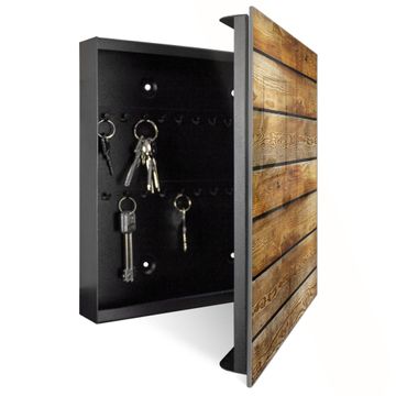 Bringe Ordnung und Eleganz in deinen Eingangsbereich mit dem banjado Schlüsselkasten Motiv Motiv Holzbretter. Die moderne Schlüsselbox kombiniert funktionales Design mit hochwertiger Verarbeitung und wird so zu einem echten Hingucker in Flur, Büro oder Ferienwohnung. ✅ Stilvolle Schlüsselaufbewahrung mit Glasfront im Motiv Motiv Holzbretter Der Design-Schlüsselkasten Motiv Motiv Holzbretter bietet Platz für bis zu 50 Schlüssel, die auf 5 stabilen Reihen mit je 10 Haken übersichtlich verstaut werden. Mit seinen kompakten Maßen von 30 x 30 x 5 cm passt die Schlüsselbox perfekt auch in kleinere Räume. Der schwarz lackierte Stahlkorpus mit rechts angeschlagenem Türscharnier harmoniert mit der Glasfront und fügt sich nahtlos in jedes Wohnambiente ein. Ob als Schlüsselorganizer für Zuhause oder als praktische Lösung für Büros, Praxen und Gewerbe, der banjado Schlüsselkasten sorgt für Ordnung und Übersicht. Dank der magnetischen, mit Kreidestiften beschreibbaren Glasfront kannst du Notizen anheften oder Termine direkt auf der Oberfläche festhalten. Die Schlüsselbox Motiv Motiv Holzbretter zur Wandmontage wird inklusive Befestigungsmaterial geliefert und ist schnell angebracht. So hast du deine Schlüssel jederzeit griffbereit und zugleich stilvoll verstaut. Mit diesem banjado Schlüsselkasten Motiv Motiv Holzbretter kombinierst du praktische Aufbewahrung mit stilvollem Wohndesign. Ob privat oder geschäftlich, die Schlüsselbox sorgt für mehr Ordnung, Übersicht und ein wohnliches Ambiente.Vorteile im Überblick