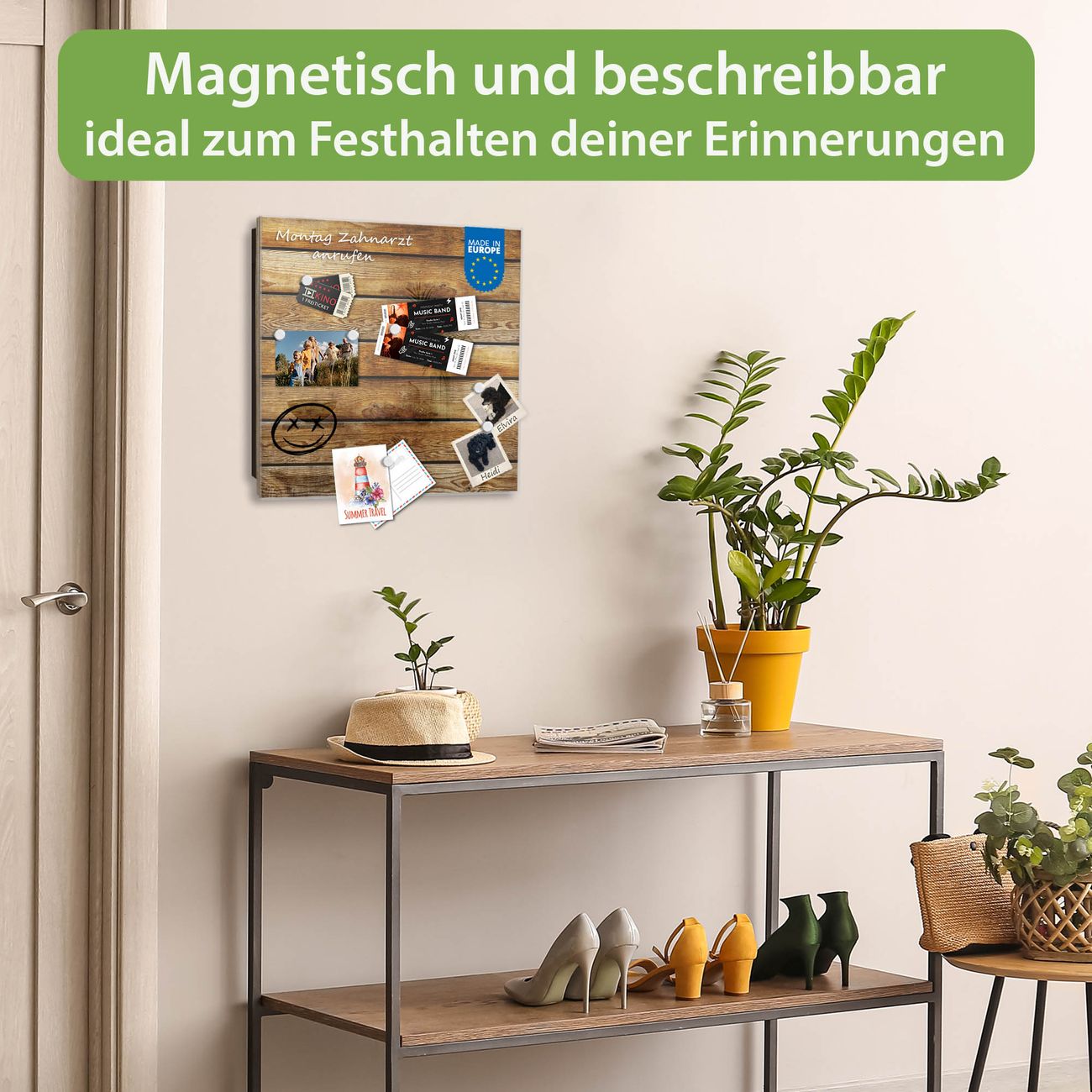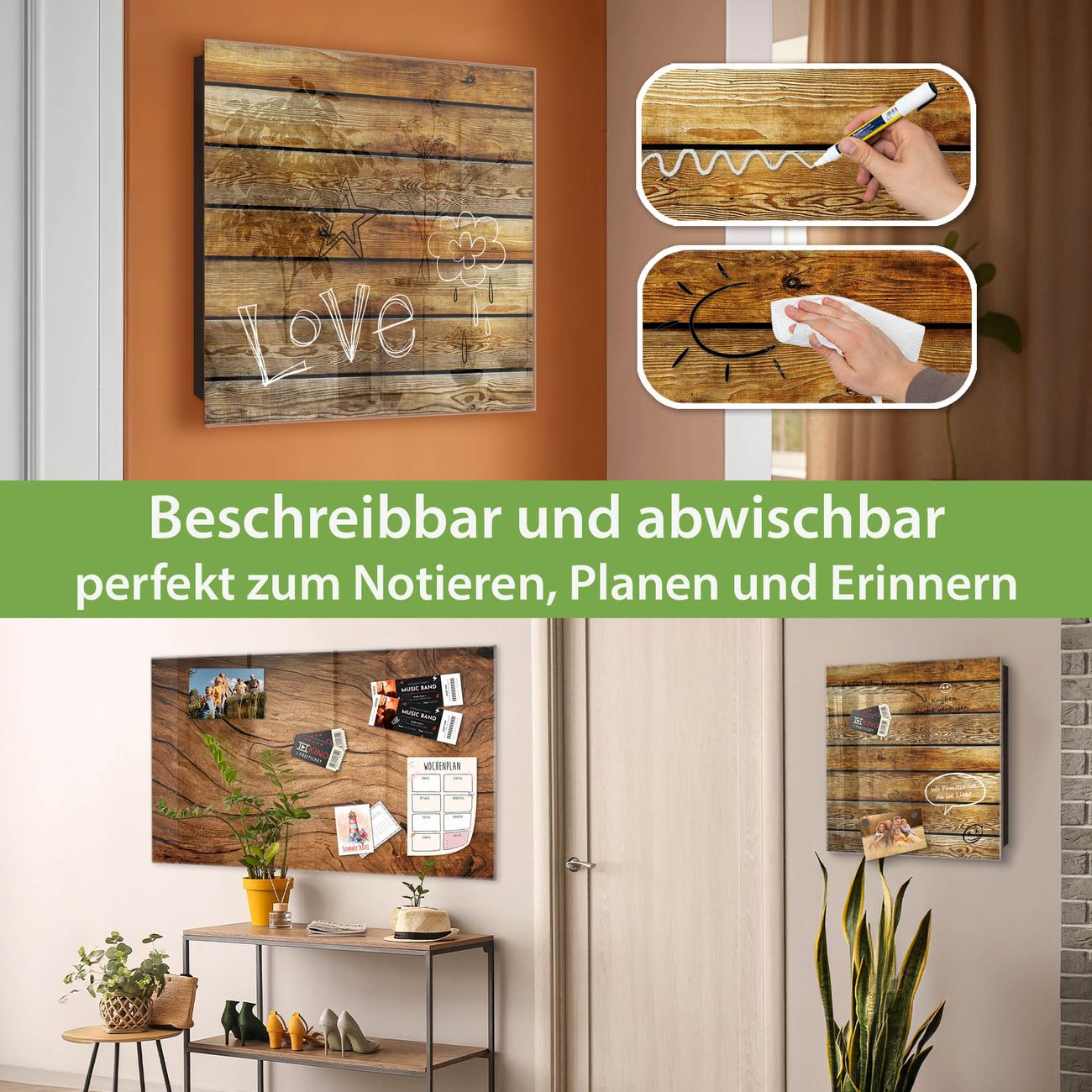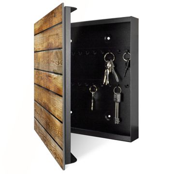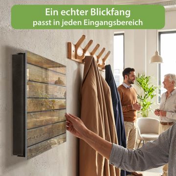 Bringe Ordnung und Eleganz in deinen Eingangsbereich mit dem banjado Schlüsselkasten Motiv Motiv Holzbretter. Die moderne Schlüsselbox kombiniert funktionales Design mit hochwertiger Verarbeitung und wird so zu einem echten Hingucker in Flur, Büro oder Ferienwohnung. ✅ Stilvolle Schlüsselaufbewahrung mit Glasfront im Motiv Motiv Holzbretter Der Design-Schlüsselkasten Motiv Motiv Holzbretter bietet Platz für bis zu 50 Schlüssel, die auf 5 stabilen Reihen mit je 10 Haken übersichtlich verstaut werden. Mit seinen kompakten Maßen von 30 x 30 x 5 cm passt die Schlüsselbox perfekt auch in kleinere Räume. Der schwarz lackierte Stahlkorpus mit rechts angeschlagenem Türscharnier harmoniert mit der Glasfront und fügt sich nahtlos in jedes Wohnambiente ein. Ob als Schlüsselorganizer für Zuhause oder als praktische Lösung für Büros, Praxen und Gewerbe, der banjado Schlüsselkasten sorgt für Ordnung und Übersicht. Dank der magnetischen, mit Kreidestiften beschreibbaren Glasfront kannst du Notizen anheften oder Termine direkt auf der Oberfläche festhalten. Die Schlüsselbox Motiv Motiv Holzbretter zur Wandmontage wird inklusive Befestigungsmaterial geliefert und ist schnell angebracht. So hast du deine Schlüssel jederzeit griffbereit und zugleich stilvoll verstaut. Mit diesem banjado Schlüsselkasten Motiv Motiv Holzbretter kombinierst du praktische Aufbewahrung mit stilvollem Wohndesign. Ob privat oder geschäftlich, die Schlüsselbox sorgt für mehr Ordnung, Übersicht und ein wohnliches Ambiente.Vorteile im Überblick
