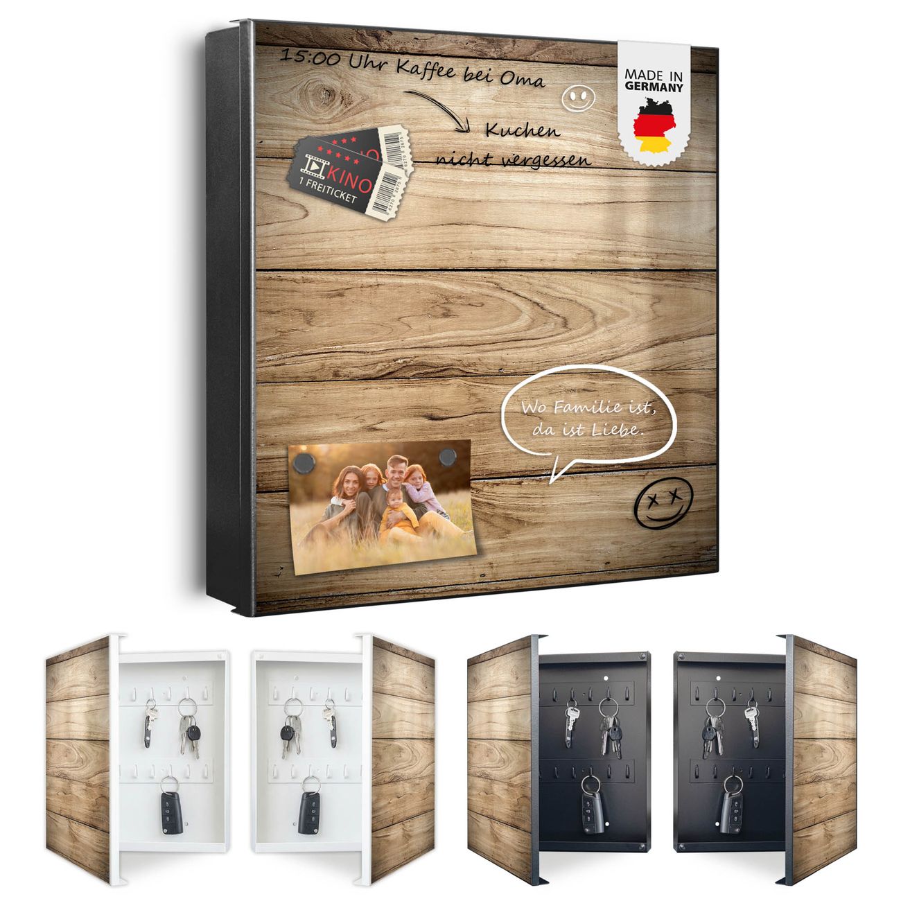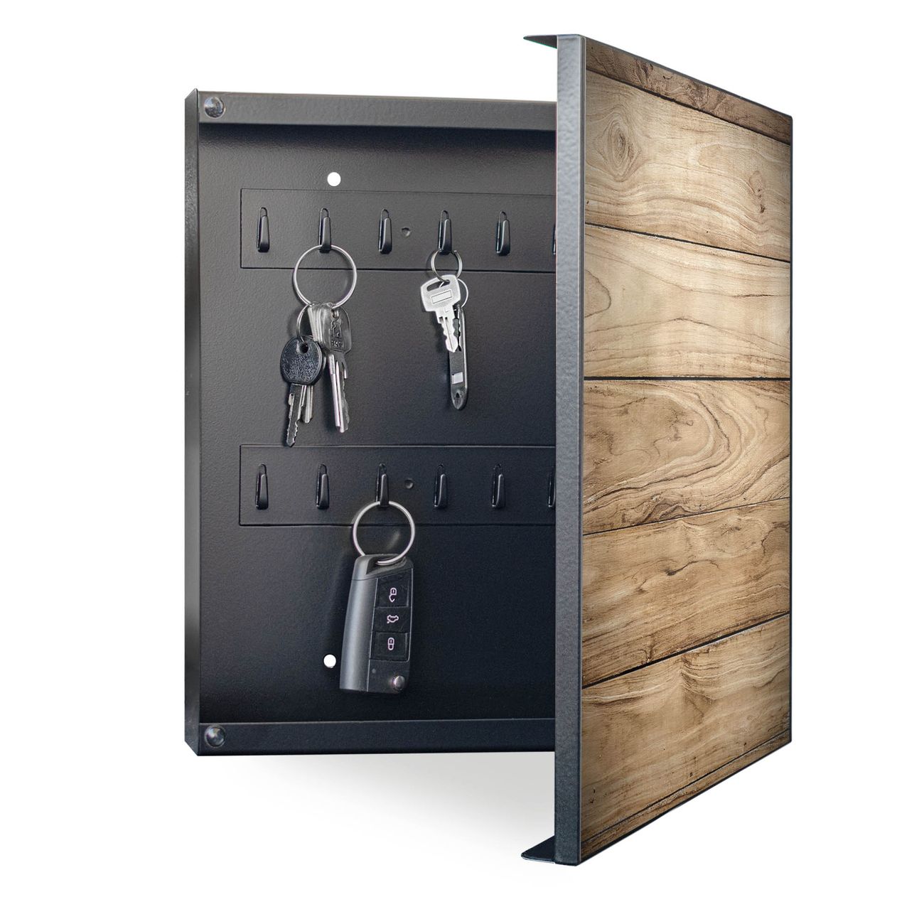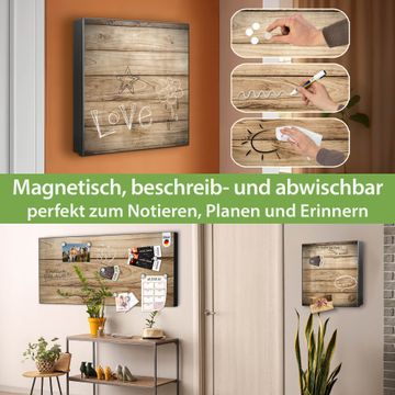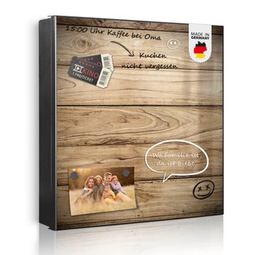 Bringe Ordnung und Eleganz in deinen Eingangsbereich mit dem banjado Schlüsselkasten Motiv Motiv Holzplanken. Die moderne Schlüsselbox kombiniert funktionales Design mit hochwertiger Verarbeitung und wird so zu einem echten Hingucker in Flur, Büro oder Ferienwohnung. ✅ Stilvolle Schlüsselaufbewahrung mit Motiv Motiv Holzplanken Der Design-Schlüsselkasten Motiv Motiv Holzplanken bietet Platz für bis zu 32 Schlüssel, die auf 4 stabilen Reihen mit je 8 Haken übersichtlich verstaut werden. Mit seinen kompakten Maßen von 30 x 30 x 5 cm passt die Schlüsselbox perfekt auch in kleinere Räume. Der schwarz lackierte Stahlkorpus mit rechts angeschlagenem Türscharnier harmoniert mit gedruckten Folie auf der Front und fügt sich nahtlos in jedes Wohnambiente ein. Ob als Schlüsselorganizer für Zuhause oder als praktische Lösung für Büros, Praxen und Gewerbe, der banjado Schlüsselkasten sorgt für Ordnung und Übersicht. Dank der magnetischen, mit Kreidestiften beschreibbaren Folie auf der Front kannst du Notizen anheften oder Termine direkt auf der Oberfläche festhalten. Die Schlüsselbox Motiv Motiv Holzplanken zur Wandmontage wird inklusive Befestigungsmaterial geliefert und ist schnell angebracht. So hast du deine Schlüssel jederzeit griffbereit und zugleich stilvoll verstaut. Mit diesem banjado Schlüsselkasten Motiv Motiv Holzplanken kombinierst du praktische Aufbewahrung mit stilvollem Wohndesign. Ob privat oder geschäftlich, die Schlüsselbox sorgt für mehr Ordnung, Übersicht und ein wohnliches Ambiente.Vorteile im Überblick