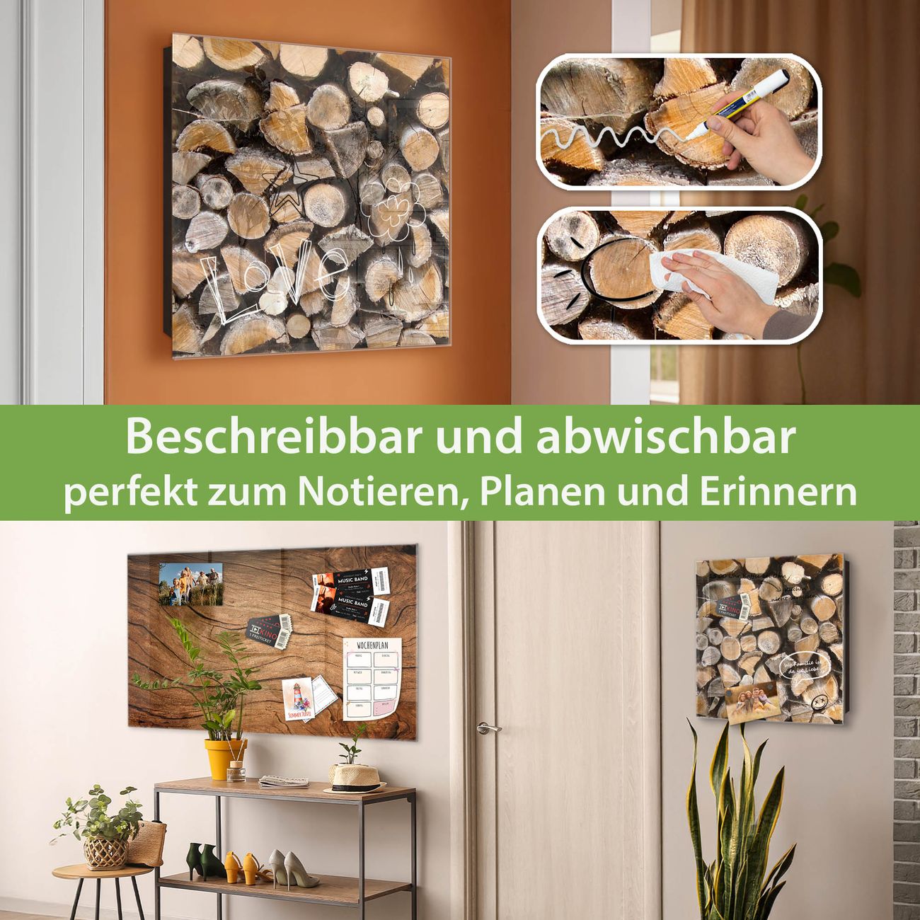 Bringe Ordnung und Eleganz in deinen Eingangsbereich mit dem banjado Schlüsselkasten Motiv Motiv Holzstapel. Die moderne Schlüsselbox kombiniert funktionales Design mit hochwertiger Verarbeitung und wird so zu einem echten Hingucker in Flur, Büro oder Ferienwohnung. ✅ Stilvolle Schlüsselaufbewahrung mit Glasfront im Motiv Motiv Holzstapel Der Design-Schlüsselkasten Motiv Motiv Holzstapel bietet Platz für bis zu 50 Schlüssel, die auf 5 stabilen Reihen mit je 10 Haken übersichtlich verstaut werden. Mit seinen kompakten Maßen von 30 x 30 x 5 cm passt die Schlüsselbox perfekt auch in kleinere Räume. Der schwarz lackierte Stahlkorpus mit rechts angeschlagenem Türscharnier harmoniert mit der Glasfront und fügt sich nahtlos in jedes Wohnambiente ein. Ob als Schlüsselorganizer für Zuhause oder als praktische Lösung für Büros, Praxen und Gewerbe, der banjado Schlüsselkasten sorgt für Ordnung und Übersicht. Dank der magnetischen, mit Kreidestiften beschreibbaren Glasfront kannst du Notizen anheften oder Termine direkt auf der Oberfläche festhalten. Die Schlüsselbox Motiv Motiv Holzstapel zur Wandmontage wird inklusive Befestigungsmaterial geliefert und ist schnell angebracht. So hast du deine Schlüssel jederzeit griffbereit und zugleich stilvoll verstaut. Mit diesem banjado Schlüsselkasten Motiv Motiv Holzstapel kombinierst du praktische Aufbewahrung mit stilvollem Wohndesign. Ob privat oder geschäftlich, die Schlüsselbox sorgt für mehr Ordnung, Übersicht und ein wohnliches Ambiente.Vorteile im Überblick