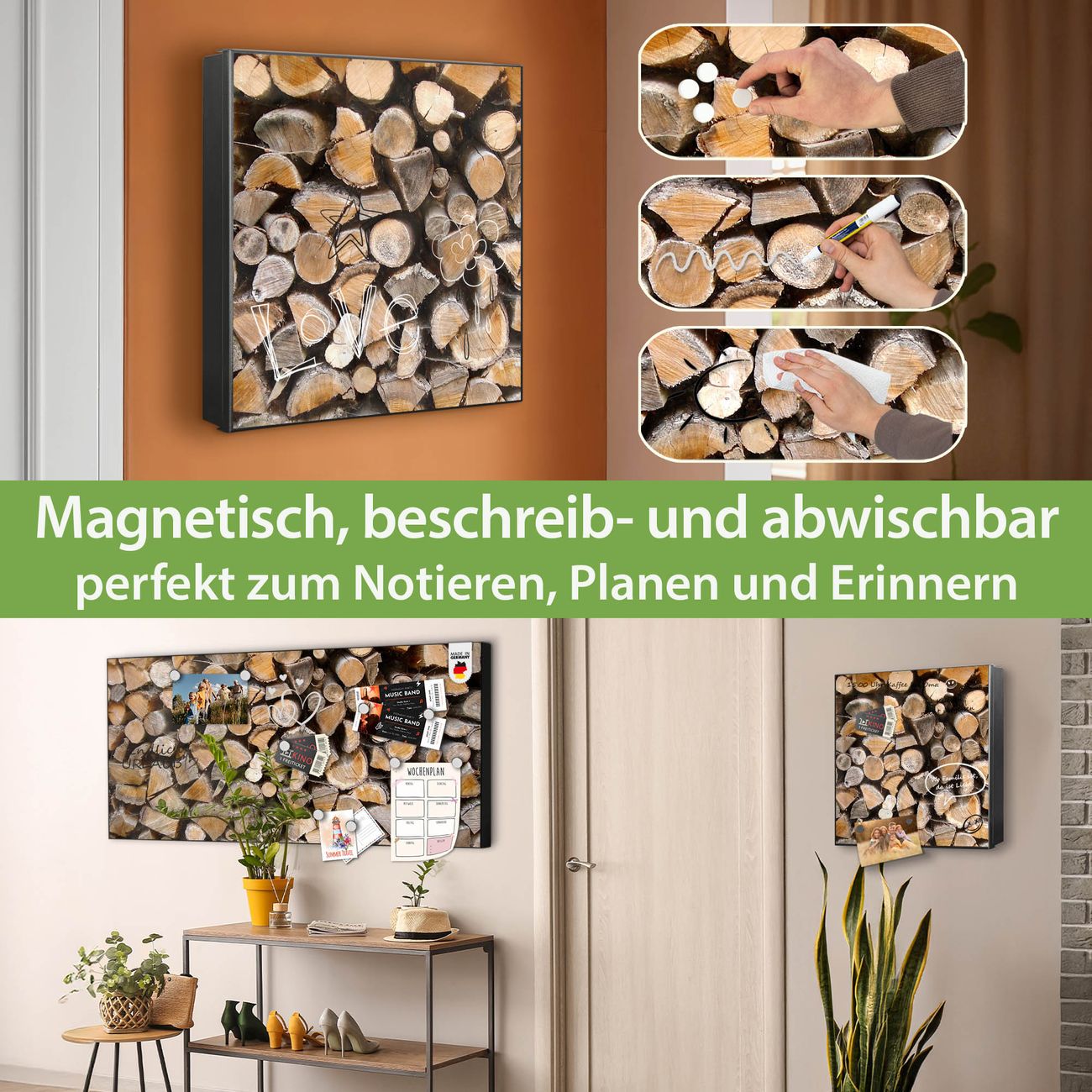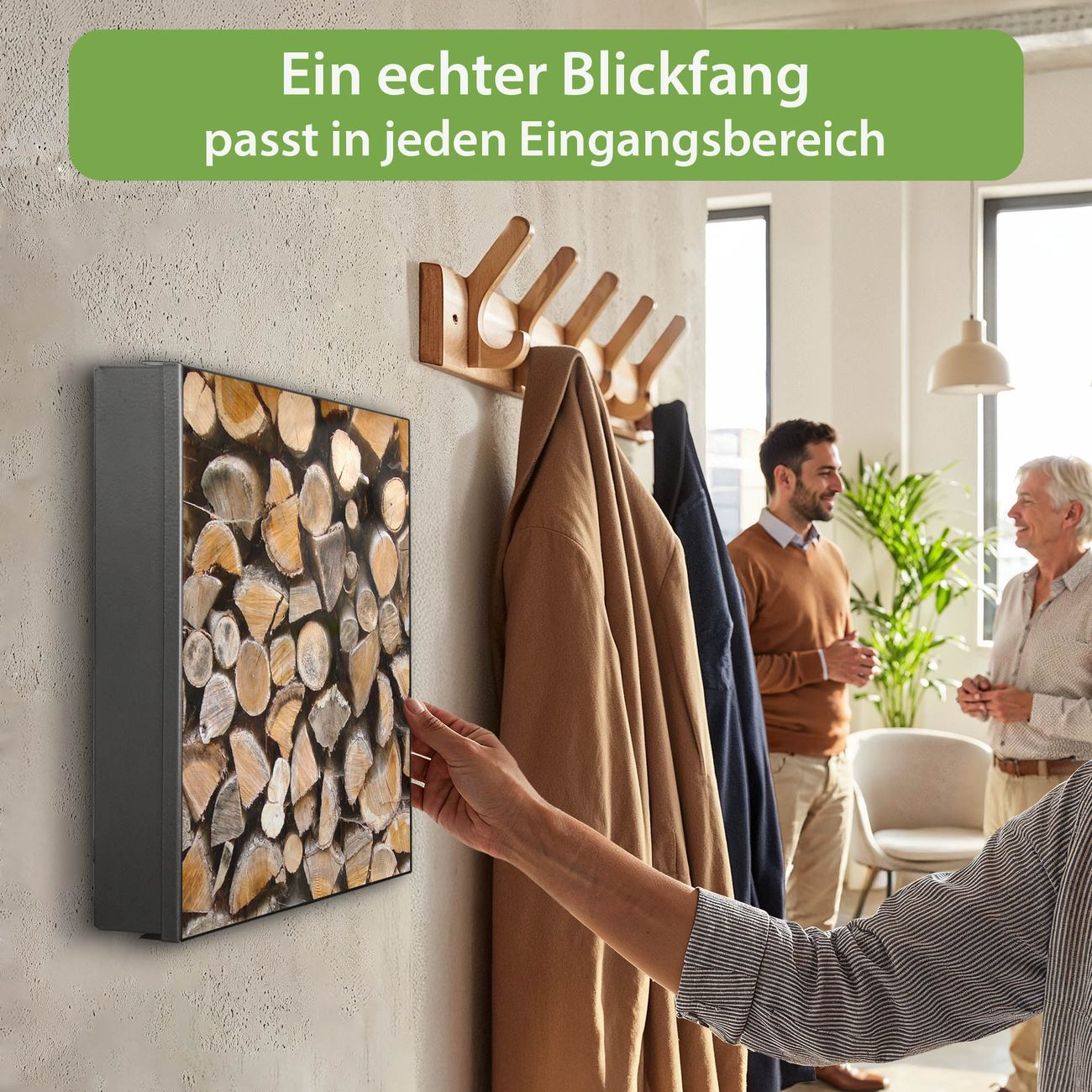 Bringe Ordnung und Eleganz in deinen Eingangsbereich mit dem banjado Schlüsselkasten Motiv Motiv Holzstapel. Die moderne Schlüsselbox kombiniert funktionales Design mit hochwertiger Verarbeitung und wird so zu einem echten Hingucker in Flur, Büro oder Ferienwohnung. ✅ Stilvolle Schlüsselaufbewahrung mit Motiv Motiv Holzstapel Der Design-Schlüsselkasten Motiv Motiv Holzstapel bietet Platz für bis zu 32 Schlüssel, die auf 4 stabilen Reihen mit je 8 Haken übersichtlich verstaut werden. Mit seinen kompakten Maßen von 30 x 30 x 5 cm passt die Schlüsselbox perfekt auch in kleinere Räume. Der schwarz lackierte Stahlkorpus mit links angeschlagenem Türscharnier harmoniert mit gedruckten Folie auf der Front und fügt sich nahtlos in jedes Wohnambiente ein. Ob als Schlüsselorganizer für Zuhause oder als praktische Lösung für Büros, Praxen und Gewerbe, der banjado Schlüsselkasten sorgt für Ordnung und Übersicht. Dank der magnetischen, mit Kreidestiften beschreibbaren Folie auf der Front kannst du Notizen anheften oder Termine direkt auf der Oberfläche festhalten. Die Schlüsselbox Motiv Motiv Holzstapel zur Wandmontage wird inklusive Befestigungsmaterial geliefert und ist schnell angebracht. So hast du deine Schlüssel jederzeit griffbereit und zugleich stilvoll verstaut. Mit diesem banjado Schlüsselkasten Motiv Motiv Holzstapel kombinierst du praktische Aufbewahrung mit stilvollem Wohndesign. Ob privat oder geschäftlich, die Schlüsselbox sorgt für mehr Ordnung, Übersicht und ein wohnliches Ambiente.Vorteile im Überblick
