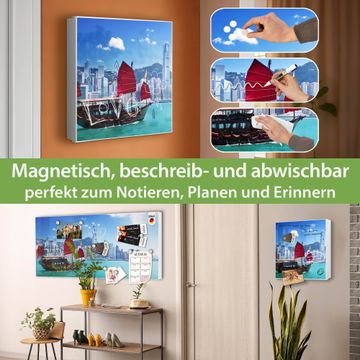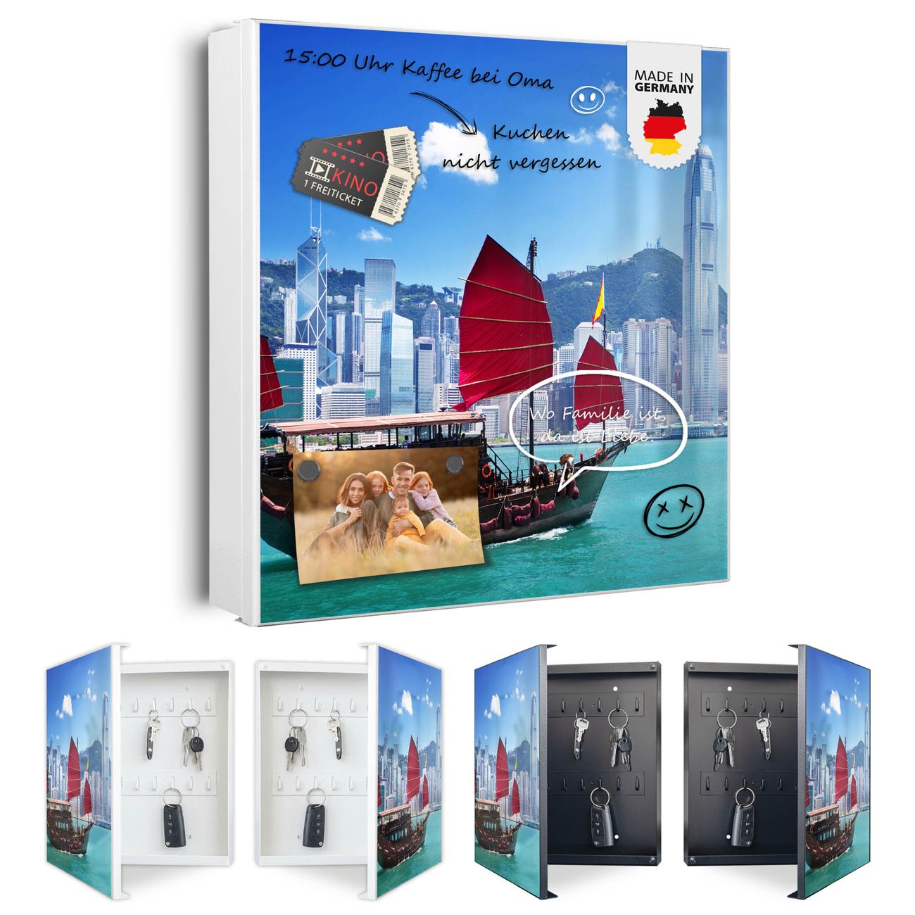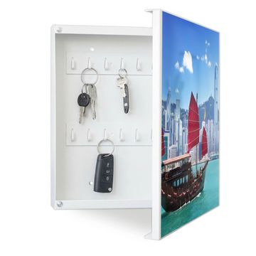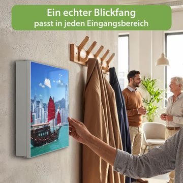 Bringe Ordnung und Eleganz in deinen Eingangsbereich mit dem banjado Schlüsselkasten Motiv Motiv Hong Kong. Die moderne Schlüsselbox kombiniert funktionales Design mit hochwertiger Verarbeitung und wird so zu einem echten Hingucker in Flur, Büro oder Ferienwohnung. ✅ Stilvolle Schlüsselaufbewahrung mit Motiv Motiv Hong Kong Der Design-Schlüsselkasten Motiv Motiv Hong Kong bietet Platz für bis zu 32 Schlüssel, die auf 4 stabilen Reihen mit je 8 Haken übersichtlich verstaut werden. Mit seinen kompakten Maßen von 30 x 30 x 5 cm passt die Schlüsselbox perfekt auch in kleinere Räume. Der weiß lackierte Stahlkorpus mit rechts angeschlagenem Türscharnier harmoniert mit gedruckten Folie auf der Front und fügt sich nahtlos in jedes Wohnambiente ein. Ob als Schlüsselorganizer für Zuhause oder als praktische Lösung für Büros, Praxen und Gewerbe, der banjado Schlüsselkasten sorgt für Ordnung und Übersicht. Dank der magnetischen, mit Kreidestiften beschreibbaren Folie auf der Front kannst du Notizen anheften oder Termine direkt auf der Oberfläche festhalten. Die Schlüsselbox Motiv Motiv Hong Kong zur Wandmontage wird inklusive Befestigungsmaterial geliefert und ist schnell angebracht. So hast du deine Schlüssel jederzeit griffbereit und zugleich stilvoll verstaut. Mit diesem banjado Schlüsselkasten Motiv Motiv Hong Kong kombinierst du praktische Aufbewahrung mit stilvollem Wohndesign. Ob privat oder geschäftlich, die Schlüsselbox sorgt für mehr Ordnung, Übersicht und ein wohnliches Ambiente.Vorteile im Überblick