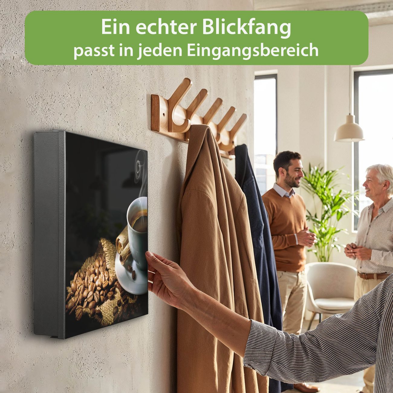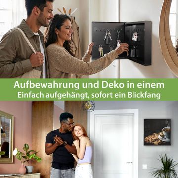 Bringe Ordnung und Eleganz in deinen Eingangsbereich mit dem banjado Schlüsselkasten Motiv Motiv Hot Coffee. Die moderne Schlüsselbox kombiniert funktionales Design mit hochwertiger Verarbeitung und wird so zu einem echten Hingucker in Flur, Büro oder Ferienwohnung. ✅ Stilvolle Schlüsselaufbewahrung mit Motiv Motiv Hot Coffee Der Design-Schlüsselkasten Motiv Motiv Hot Coffee bietet Platz für bis zu 32 Schlüssel, die auf 4 stabilen Reihen mit je 8 Haken übersichtlich verstaut werden. Mit seinen kompakten Maßen von 30 x 30 x 5 cm passt die Schlüsselbox perfekt auch in kleinere Räume. Der schwarz lackierte Stahlkorpus mit links angeschlagenem Türscharnier harmoniert mit gedruckten Folie auf der Front und fügt sich nahtlos in jedes Wohnambiente ein. Ob als Schlüsselorganizer für Zuhause oder als praktische Lösung für Büros, Praxen und Gewerbe, der banjado Schlüsselkasten sorgt für Ordnung und Übersicht. Dank der magnetischen, mit Kreidestiften beschreibbaren Folie auf der Front kannst du Notizen anheften oder Termine direkt auf der Oberfläche festhalten. Die Schlüsselbox Motiv Motiv Hot Coffee zur Wandmontage wird inklusive Befestigungsmaterial geliefert und ist schnell angebracht. So hast du deine Schlüssel jederzeit griffbereit und zugleich stilvoll verstaut. Mit diesem banjado Schlüsselkasten Motiv Motiv Hot Coffee kombinierst du praktische Aufbewahrung mit stilvollem Wohndesign. Ob privat oder geschäftlich, die Schlüsselbox sorgt für mehr Ordnung, Übersicht und ein wohnliches Ambiente.Vorteile im Überblick