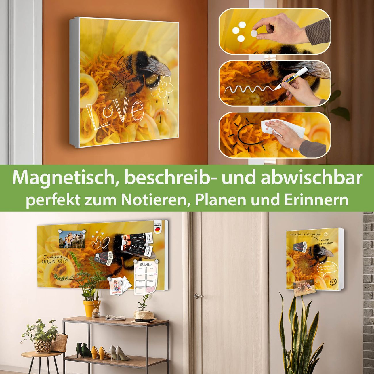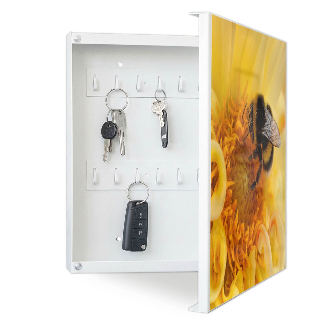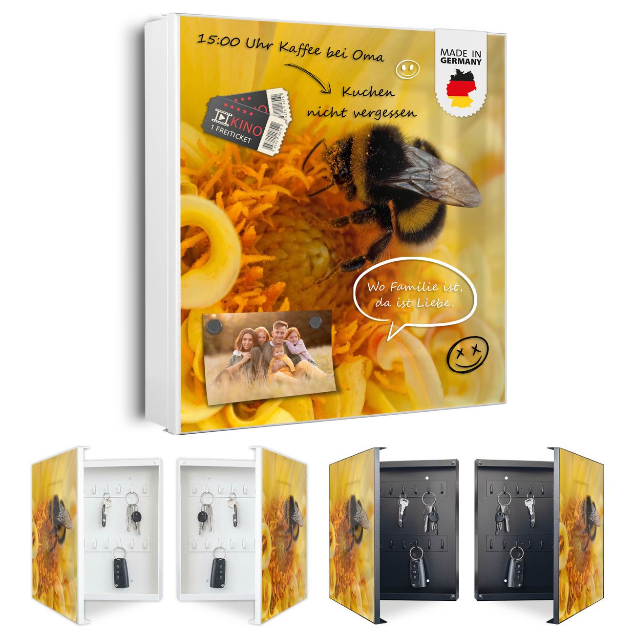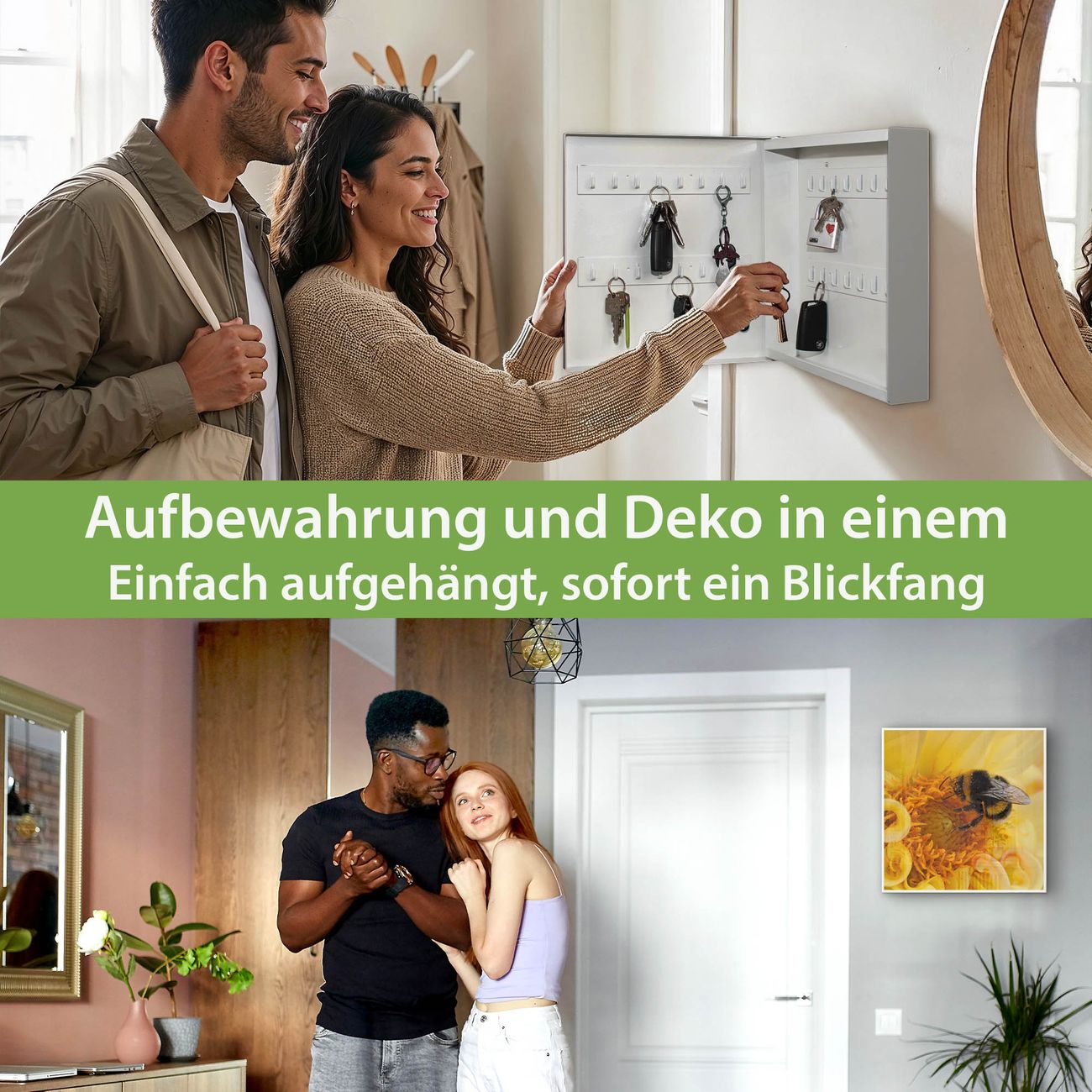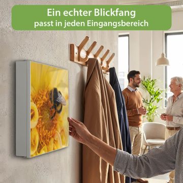 Bringe Ordnung und Eleganz in deinen Eingangsbereich mit dem banjado Schlüsselkasten Motiv Motiv Hummel. Die moderne Schlüsselbox kombiniert funktionales Design mit hochwertiger Verarbeitung und wird so zu einem echten Hingucker in Flur, Büro oder Ferienwohnung. ✅ Stilvolle Schlüsselaufbewahrung mit Motiv Motiv Hummel Der Design-Schlüsselkasten Motiv Motiv Hummel bietet Platz für bis zu 32 Schlüssel, die auf 4 stabilen Reihen mit je 8 Haken übersichtlich verstaut werden. Mit seinen kompakten Maßen von 30 x 30 x 5 cm passt die Schlüsselbox perfekt auch in kleinere Räume. Der weiß lackierte Stahlkorpus mit rechts angeschlagenem Türscharnier harmoniert mit gedruckten Folie auf der Front und fügt sich nahtlos in jedes Wohnambiente ein. Ob als Schlüsselorganizer für Zuhause oder als praktische Lösung für Büros, Praxen und Gewerbe, der banjado Schlüsselkasten sorgt für Ordnung und Übersicht. Dank der magnetischen, mit Kreidestiften beschreibbaren Folie auf der Front kannst du Notizen anheften oder Termine direkt auf der Oberfläche festhalten. Die Schlüsselbox Motiv Motiv Hummel zur Wandmontage wird inklusive Befestigungsmaterial geliefert und ist schnell angebracht. So hast du deine Schlüssel jederzeit griffbereit und zugleich stilvoll verstaut. Mit diesem banjado Schlüsselkasten Motiv Motiv Hummel kombinierst du praktische Aufbewahrung mit stilvollem Wohndesign. Ob privat oder geschäftlich, die Schlüsselbox sorgt für mehr Ordnung, Übersicht und ein wohnliches Ambiente.Vorteile im Überblick