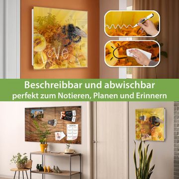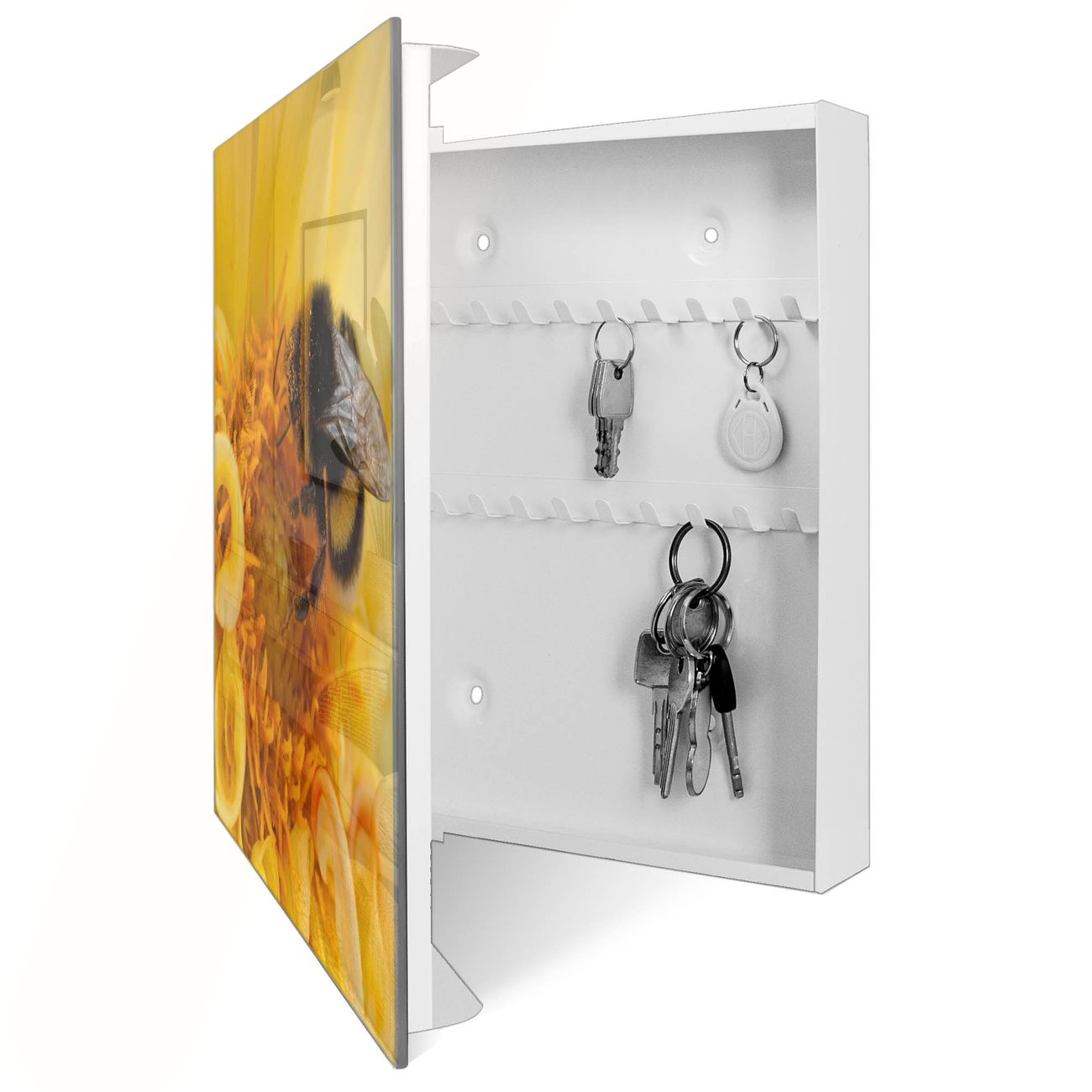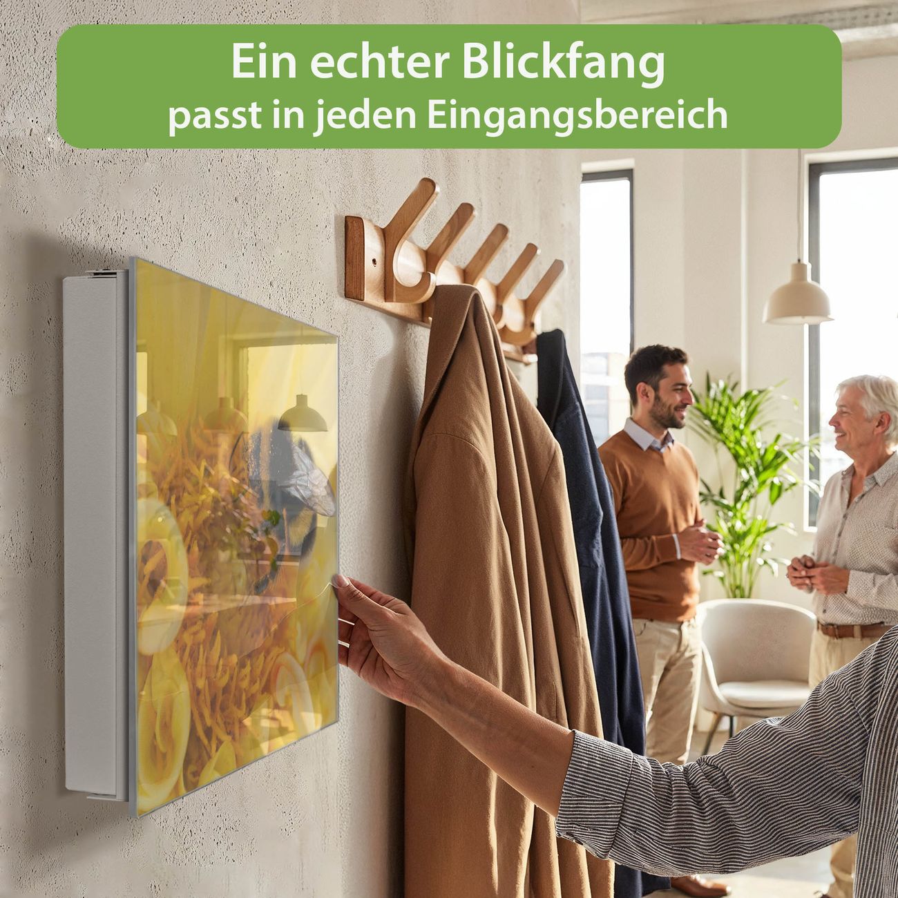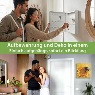 Bringe Ordnung und Eleganz in deinen Eingangsbereich mit dem banjado Schlüsselkasten Motiv Motiv Hummel. Die moderne Schlüsselbox kombiniert funktionales Design mit hochwertiger Verarbeitung und wird so zu einem echten Hingucker in Flur, Büro oder Ferienwohnung. ✅ Stilvolle Schlüsselaufbewahrung mit Glasfront im Motiv Motiv Hummel Der Design-Schlüsselkasten Motiv Motiv Hummel bietet Platz für bis zu 50 Schlüssel, die auf 5 stabilen Reihen mit je 10 Haken übersichtlich verstaut werden. Mit seinen kompakten Maßen von 30 x 30 x 5 cm passt die Schlüsselbox perfekt auch in kleinere Räume. Der weiß lackierte Stahlkorpus mit rechts angeschlagenem Türscharnier harmoniert mit der Glasfront und fügt sich nahtlos in jedes Wohnambiente ein. Ob als Schlüsselorganizer für Zuhause oder als praktische Lösung für Büros, Praxen und Gewerbe, der banjado Schlüsselkasten sorgt für Ordnung und Übersicht. Dank der magnetischen, mit Kreidestiften beschreibbaren Glasfront kannst du Notizen anheften oder Termine direkt auf der Oberfläche festhalten. Die Schlüsselbox Motiv Motiv Hummel zur Wandmontage wird inklusive Befestigungsmaterial geliefert und ist schnell angebracht. So hast du deine Schlüssel jederzeit griffbereit und zugleich stilvoll verstaut. Mit diesem banjado Schlüsselkasten Motiv Motiv Hummel kombinierst du praktische Aufbewahrung mit stilvollem Wohndesign. Ob privat oder geschäftlich, die Schlüsselbox sorgt für mehr Ordnung, Übersicht und ein wohnliches Ambiente.Vorteile im Überblick
