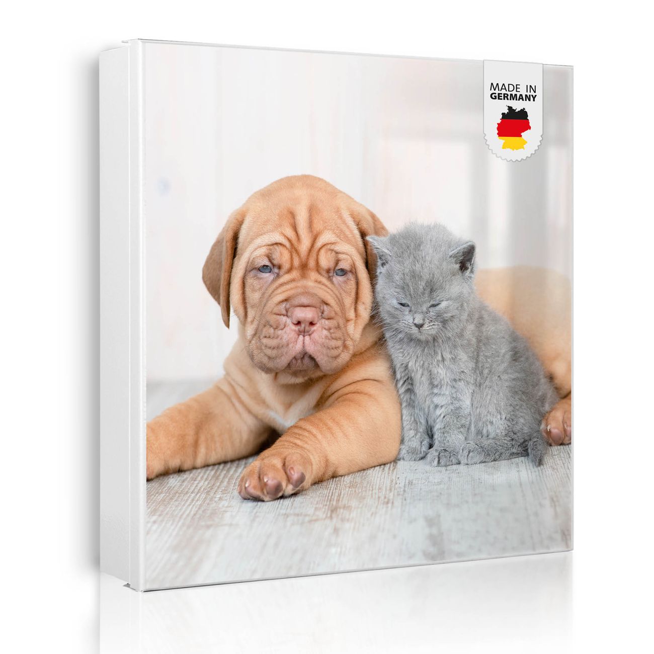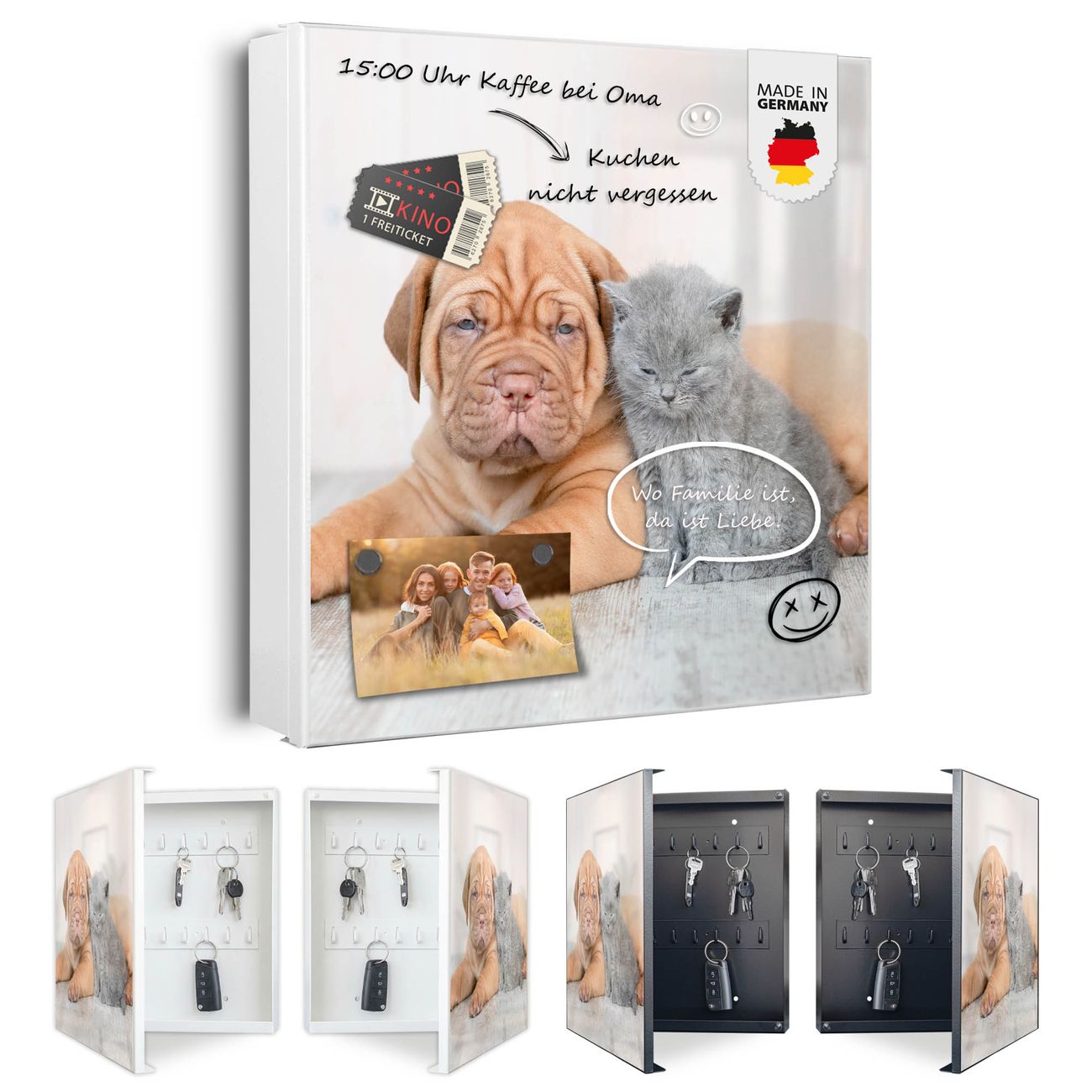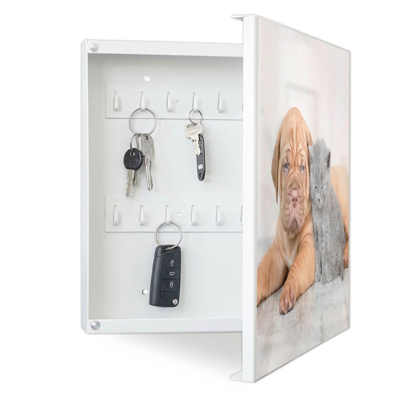 Bringe Ordnung und Eleganz in deinen Eingangsbereich mit dem banjado Schlüsselkasten Motiv Motiv Hund und Katze. Die moderne Schlüsselbox kombiniert funktionales Design mit hochwertiger Verarbeitung und wird so zu einem echten Hingucker in Flur, Büro oder Ferienwohnung. ✅ Stilvolle Schlüsselaufbewahrung mit Motiv Motiv Hund und Katze Der Design-Schlüsselkasten Motiv Motiv Hund und Katze bietet Platz für bis zu 32 Schlüssel, die auf 4 stabilen Reihen mit je 8 Haken übersichtlich verstaut werden. Mit seinen kompakten Maßen von 30 x 30 x 5 cm passt die Schlüsselbox perfekt auch in kleinere Räume. Der weiß lackierte Stahlkorpus mit rechts angeschlagenem Türscharnier harmoniert mit gedruckten Folie auf der Front und fügt sich nahtlos in jedes Wohnambiente ein. Ob als Schlüsselorganizer für Zuhause oder als praktische Lösung für Büros, Praxen und Gewerbe, der banjado Schlüsselkasten sorgt für Ordnung und Übersicht. Dank der magnetischen, mit Kreidestiften beschreibbaren Folie auf der Front kannst du Notizen anheften oder Termine direkt auf der Oberfläche festhalten. Die Schlüsselbox Motiv Motiv Hund und Katze zur Wandmontage wird inklusive Befestigungsmaterial geliefert und ist schnell angebracht. So hast du deine Schlüssel jederzeit griffbereit und zugleich stilvoll verstaut. Mit diesem banjado Schlüsselkasten Motiv Motiv Hund und Katze kombinierst du praktische Aufbewahrung mit stilvollem Wohndesign. Ob privat oder geschäftlich, die Schlüsselbox sorgt für mehr Ordnung, Übersicht und ein wohnliches Ambiente.Vorteile im Überblick