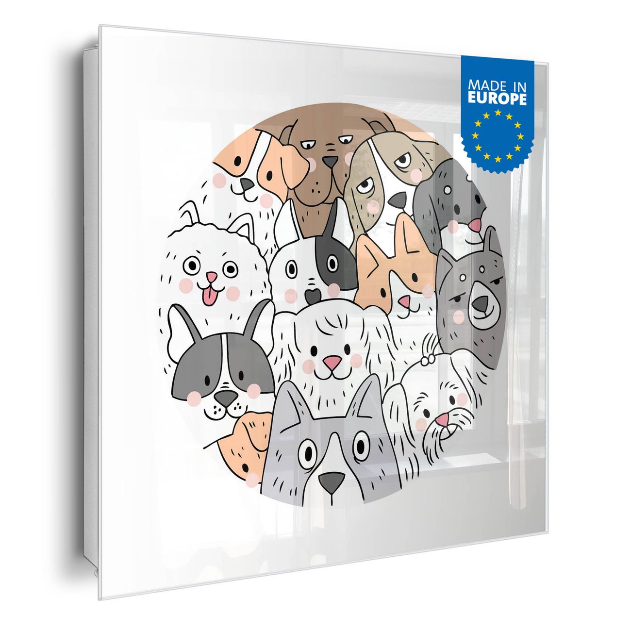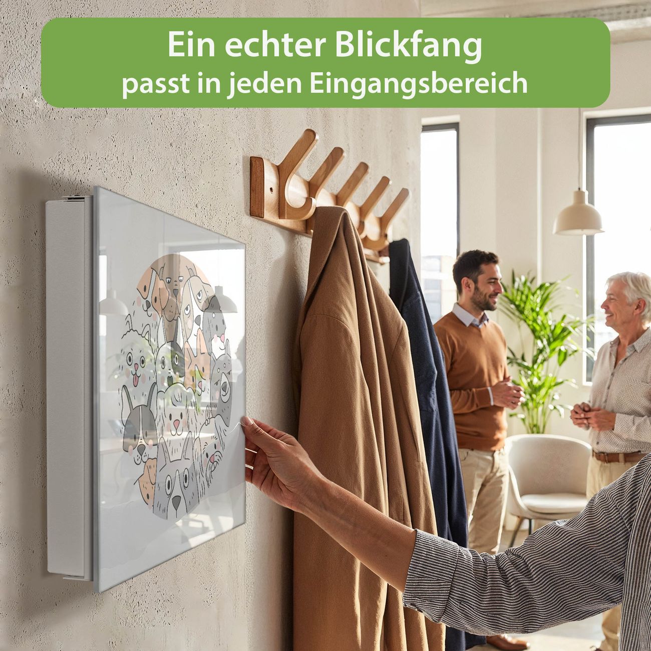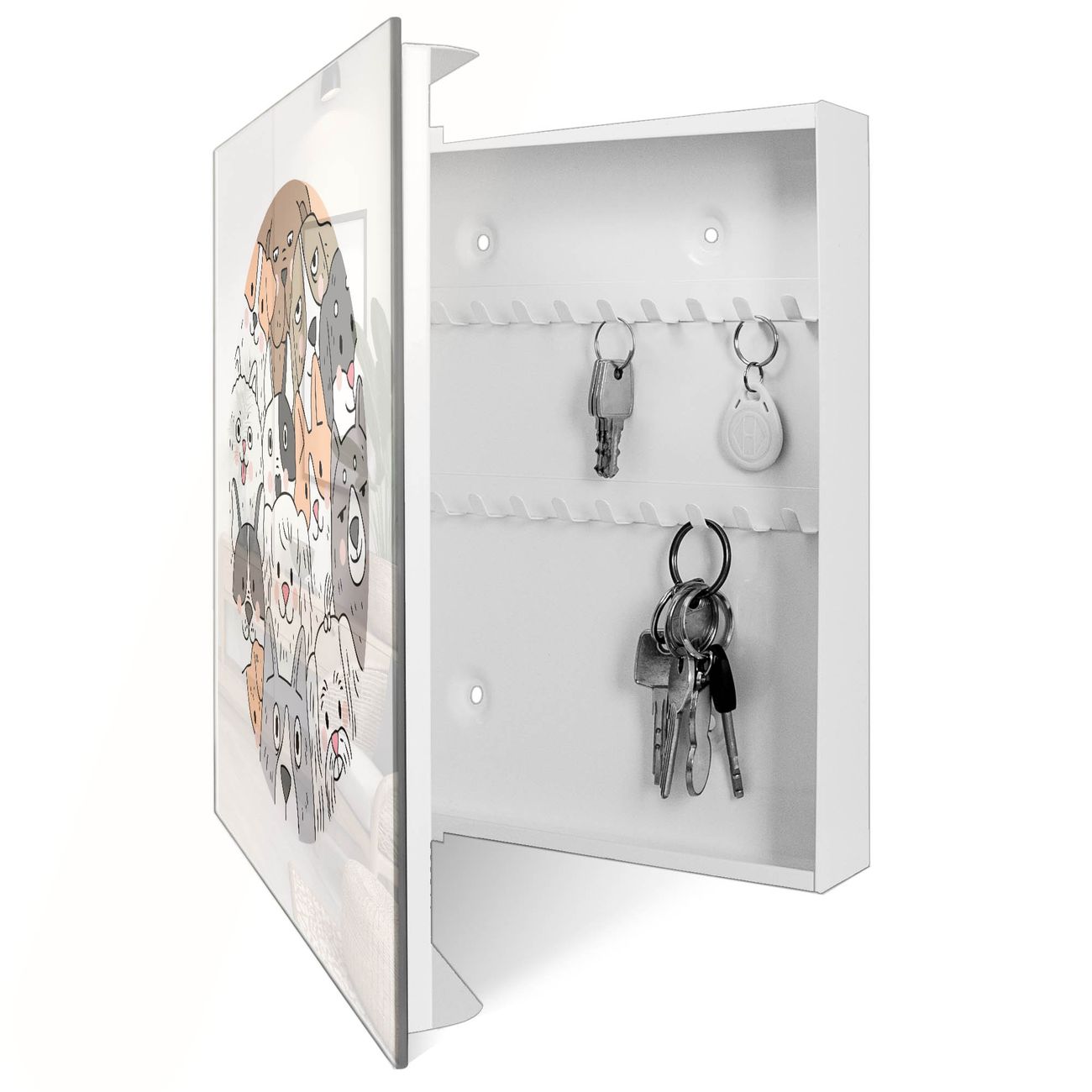 Bringe Ordnung und Eleganz in deinen Eingangsbereich mit dem banjado Schlüsselkasten Motiv Motiv Hundefreunde. Die moderne Schlüsselbox kombiniert funktionales Design mit hochwertiger Verarbeitung und wird so zu einem echten Hingucker in Flur, Büro oder Ferienwohnung. ✅ Stilvolle Schlüsselaufbewahrung mit Glasfront im Motiv Motiv Hundefreunde Der Design-Schlüsselkasten Motiv Motiv Hundefreunde bietet Platz für bis zu 50 Schlüssel, die auf 5 stabilen Reihen mit je 10 Haken übersichtlich verstaut werden. Mit seinen kompakten Maßen von 30 x 30 x 5 cm passt die Schlüsselbox perfekt auch in kleinere Räume. Der weiß lackierte Stahlkorpus mit rechts angeschlagenem Türscharnier harmoniert mit der Glasfront und fügt sich nahtlos in jedes Wohnambiente ein. Ob als Schlüsselorganizer für Zuhause oder als praktische Lösung für Büros, Praxen und Gewerbe, der banjado Schlüsselkasten sorgt für Ordnung und Übersicht. Dank der magnetischen, mit Kreidestiften beschreibbaren Glasfront kannst du Notizen anheften oder Termine direkt auf der Oberfläche festhalten. Die Schlüsselbox Motiv Motiv Hundefreunde zur Wandmontage wird inklusive Befestigungsmaterial geliefert und ist schnell angebracht. So hast du deine Schlüssel jederzeit griffbereit und zugleich stilvoll verstaut. Mit diesem banjado Schlüsselkasten Motiv Motiv Hundefreunde kombinierst du praktische Aufbewahrung mit stilvollem Wohndesign. Ob privat oder geschäftlich, die Schlüsselbox sorgt für mehr Ordnung, Übersicht und ein wohnliches Ambiente.Vorteile im Überblick