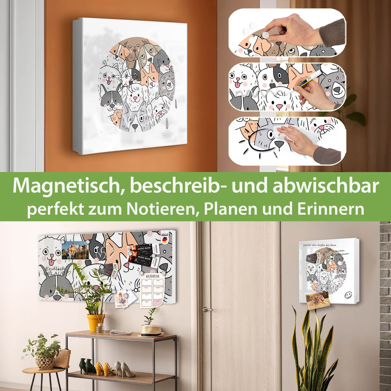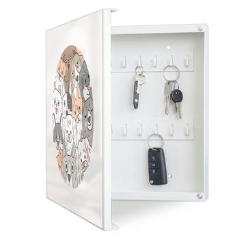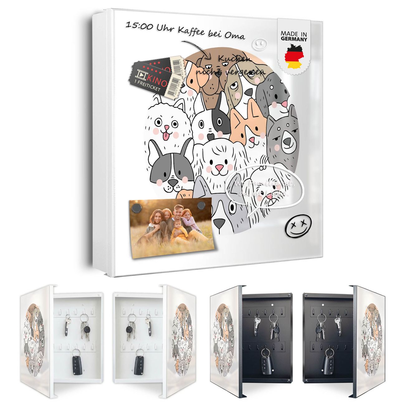 Bringe Ordnung und Eleganz in deinen Eingangsbereich mit dem banjado Schlüsselkasten Motiv Motiv Hunde Gruppe neugierig. Die moderne Schlüsselbox kombiniert funktionales Design mit hochwertiger Verarbeitung und wird so zu einem echten Hingucker in Flur, Büro oder Ferienwohnung. ✅ Stilvolle Schlüsselaufbewahrung mit Motiv Motiv Hunde Gruppe neugierig Der Design-Schlüsselkasten Motiv Motiv Hunde Gruppe neugierig bietet Platz für bis zu 32 Schlüssel, die auf 4 stabilen Reihen mit je 8 Haken übersichtlich verstaut werden. Mit seinen kompakten Maßen von 30 x 30 x 5 cm passt die Schlüsselbox perfekt auch in kleinere Räume. Der weiß lackierte Stahlkorpus mit links angeschlagenem Türscharnier harmoniert mit gedruckten Folie auf der Front und fügt sich nahtlos in jedes Wohnambiente ein. Ob als Schlüsselorganizer für Zuhause oder als praktische Lösung für Büros, Praxen und Gewerbe, der banjado Schlüsselkasten sorgt für Ordnung und Übersicht. Dank der magnetischen, mit Kreidestiften beschreibbaren Folie auf der Front kannst du Notizen anheften oder Termine direkt auf der Oberfläche festhalten. Die Schlüsselbox Motiv Motiv Hunde Gruppe neugierig zur Wandmontage wird inklusive Befestigungsmaterial geliefert und ist schnell angebracht. So hast du deine Schlüssel jederzeit griffbereit und zugleich stilvoll verstaut. Mit diesem banjado Schlüsselkasten Motiv Motiv Hunde Gruppe neugierig kombinierst du praktische Aufbewahrung mit stilvollem Wohndesign. Ob privat oder geschäftlich, die Schlüsselbox sorgt für mehr Ordnung, Übersicht und ein wohnliches Ambiente.Vorteile im Überblick