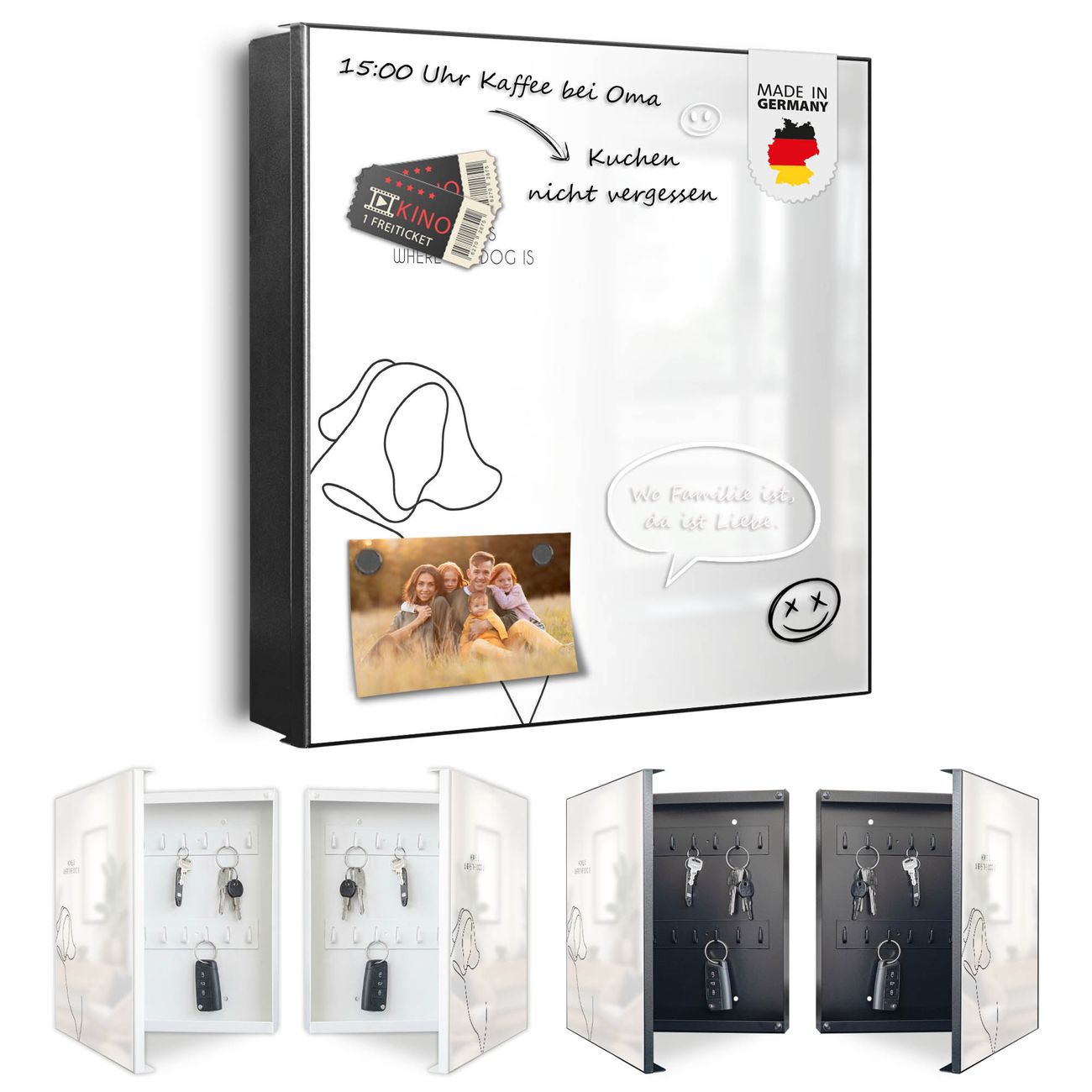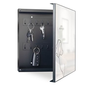 Bringe Ordnung und Eleganz in deinen Eingangsbereich mit dem banjado Schlüsselkasten Motiv Motiv Home is where the Dog is. Die moderne Schlüsselbox kombiniert funktionales Design mit hochwertiger Verarbeitung und wird so zu einem echten Hingucker in Flur, Büro oder Ferienwohnung. ✅ Stilvolle Schlüsselaufbewahrung mit Motiv Motiv Home is where the Dog is Der Design-Schlüsselkasten Motiv Motiv Home is where the Dog is bietet Platz für bis zu 32 Schlüssel, die auf 4 stabilen Reihen mit je 8 Haken übersichtlich verstaut werden. Mit seinen kompakten Maßen von 30 x 30 x 5 cm passt die Schlüsselbox perfekt auch in kleinere Räume. Der schwarz lackierte Stahlkorpus mit rechts angeschlagenem Türscharnier harmoniert mit gedruckten Folie auf der Front und fügt sich nahtlos in jedes Wohnambiente ein. Ob als Schlüsselorganizer für Zuhause oder als praktische Lösung für Büros, Praxen und Gewerbe, der banjado Schlüsselkasten sorgt für Ordnung und Übersicht. Dank der magnetischen, mit Kreidestiften beschreibbaren Folie auf der Front kannst du Notizen anheften oder Termine direkt auf der Oberfläche festhalten. Die Schlüsselbox Motiv Motiv Home is where the Dog is zur Wandmontage wird inklusive Befestigungsmaterial geliefert und ist schnell angebracht. So hast du deine Schlüssel jederzeit griffbereit und zugleich stilvoll verstaut. Mit diesem banjado Schlüsselkasten Motiv Motiv Home is where the Dog is kombinierst du praktische Aufbewahrung mit stilvollem Wohndesign. Ob privat oder geschäftlich, die Schlüsselbox sorgt für mehr Ordnung, Übersicht und ein wohnliches Ambiente.Vorteile im Überblick