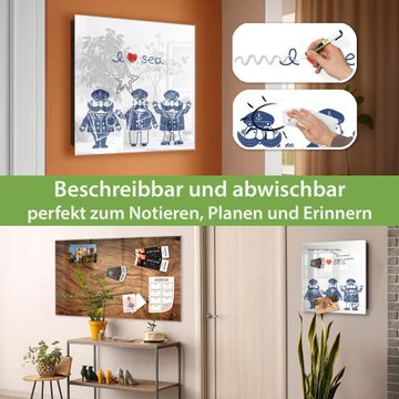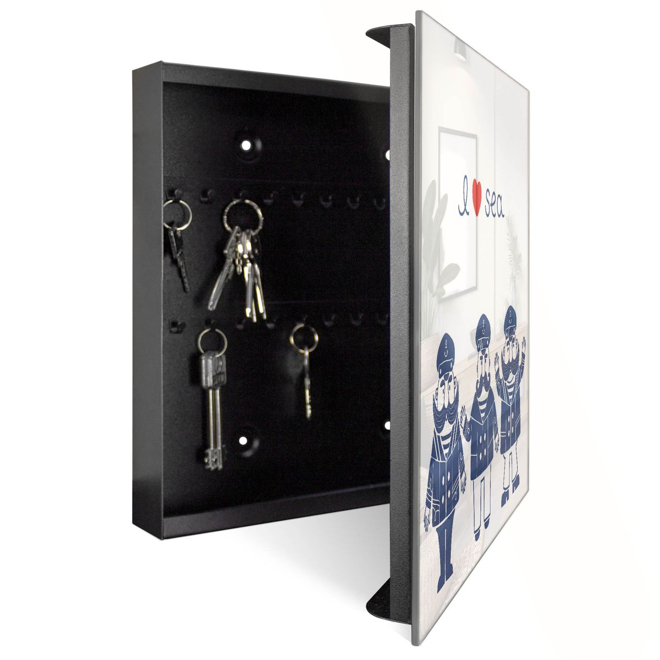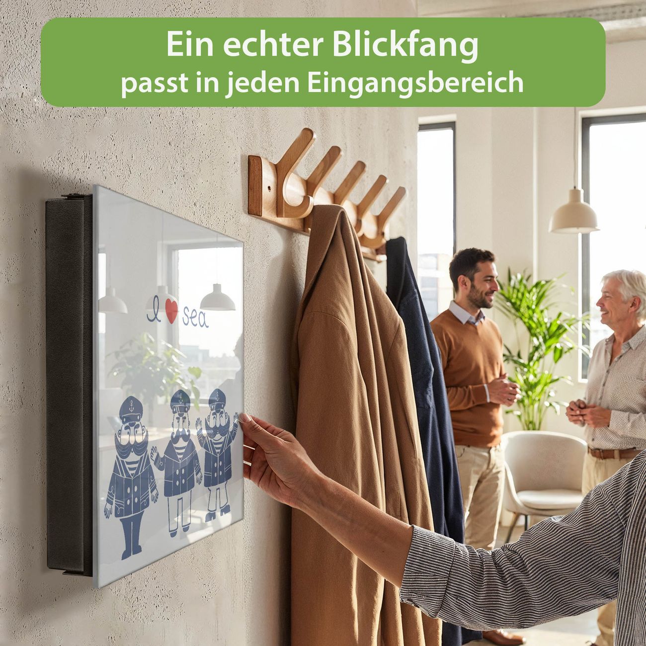 Bringe Ordnung und Eleganz in deinen Eingangsbereich mit dem banjado Schlüsselkasten Motiv Motiv I Love Sea. Die moderne Schlüsselbox kombiniert funktionales Design mit hochwertiger Verarbeitung und wird so zu einem echten Hingucker in Flur, Büro oder Ferienwohnung. ✅ Stilvolle Schlüsselaufbewahrung mit Glasfront im Motiv Motiv I Love Sea Der Design-Schlüsselkasten Motiv Motiv I Love Sea bietet Platz für bis zu 50 Schlüssel, die auf 5 stabilen Reihen mit je 10 Haken übersichtlich verstaut werden. Mit seinen kompakten Maßen von 30 x 30 x 5 cm passt die Schlüsselbox perfekt auch in kleinere Räume. Der schwarz lackierte Stahlkorpus mit rechts angeschlagenem Türscharnier harmoniert mit der Glasfront und fügt sich nahtlos in jedes Wohnambiente ein. Ob als Schlüsselorganizer für Zuhause oder als praktische Lösung für Büros, Praxen und Gewerbe, der banjado Schlüsselkasten sorgt für Ordnung und Übersicht. Dank der magnetischen, mit Kreidestiften beschreibbaren Glasfront kannst du Notizen anheften oder Termine direkt auf der Oberfläche festhalten. Die Schlüsselbox Motiv Motiv I Love Sea zur Wandmontage wird inklusive Befestigungsmaterial geliefert und ist schnell angebracht. So hast du deine Schlüssel jederzeit griffbereit und zugleich stilvoll verstaut. Mit diesem banjado Schlüsselkasten Motiv Motiv I Love Sea kombinierst du praktische Aufbewahrung mit stilvollem Wohndesign. Ob privat oder geschäftlich, die Schlüsselbox sorgt für mehr Ordnung, Übersicht und ein wohnliches Ambiente.Vorteile im Überblick