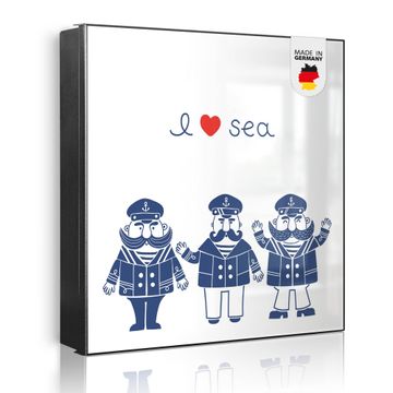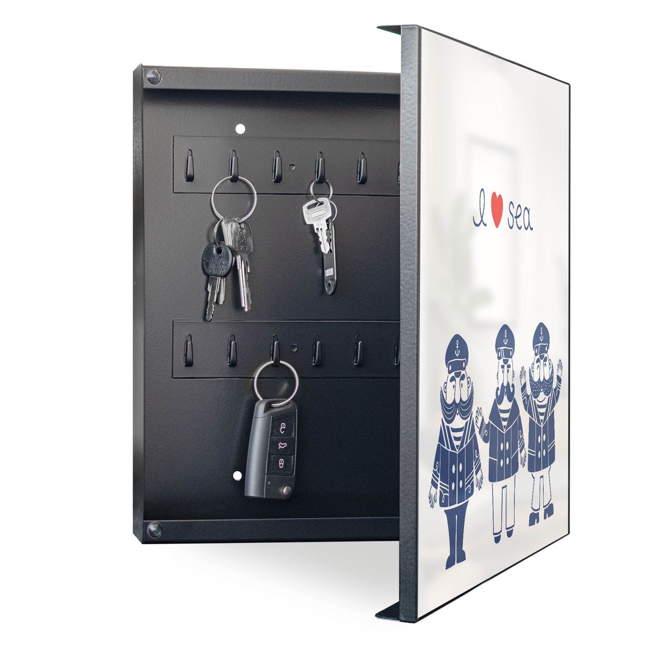Bringe Ordnung und Eleganz in deinen Eingangsbereich mit dem banjado Schlüsselkasten Motiv Motiv I Love Sea. Die moderne Schlüsselbox kombiniert funktionales Design mit hochwertiger Verarbeitung und wird so zu einem echten Hingucker in Flur, Büro oder Ferienwohnung. ✅ Stilvolle Schlüsselaufbewahrung mit Motiv Motiv I Love Sea Der Design-Schlüsselkasten Motiv Motiv I Love Sea bietet Platz für bis zu 32 Schlüssel, die auf 4 stabilen Reihen mit je 8 Haken übersichtlich verstaut werden. Mit seinen kompakten Maßen von 30 x 30 x 5 cm passt die Schlüsselbox perfekt auch in kleinere Räume. Der schwarz lackierte Stahlkorpus mit rechts angeschlagenem Türscharnier harmoniert mit gedruckten Folie auf der Front und fügt sich nahtlos in jedes Wohnambiente ein. Ob als Schlüsselorganizer für Zuhause oder als praktische Lösung für Büros, Praxen und Gewerbe, der banjado Schlüsselkasten sorgt für Ordnung und Übersicht. Dank der magnetischen, mit Kreidestiften beschreibbaren Folie auf der Front kannst du Notizen anheften oder Termine direkt auf der Oberfläche festhalten. Die Schlüsselbox Motiv Motiv I Love Sea zur Wandmontage wird inklusive Befestigungsmaterial geliefert und ist schnell angebracht. So hast du deine Schlüssel jederzeit griffbereit und zugleich stilvoll verstaut. Mit diesem banjado Schlüsselkasten Motiv Motiv I Love Sea kombinierst du praktische Aufbewahrung mit stilvollem Wohndesign. Ob privat oder geschäftlich, die Schlüsselbox sorgt für mehr Ordnung, Übersicht und ein wohnliches Ambiente.Vorteile im Überblick