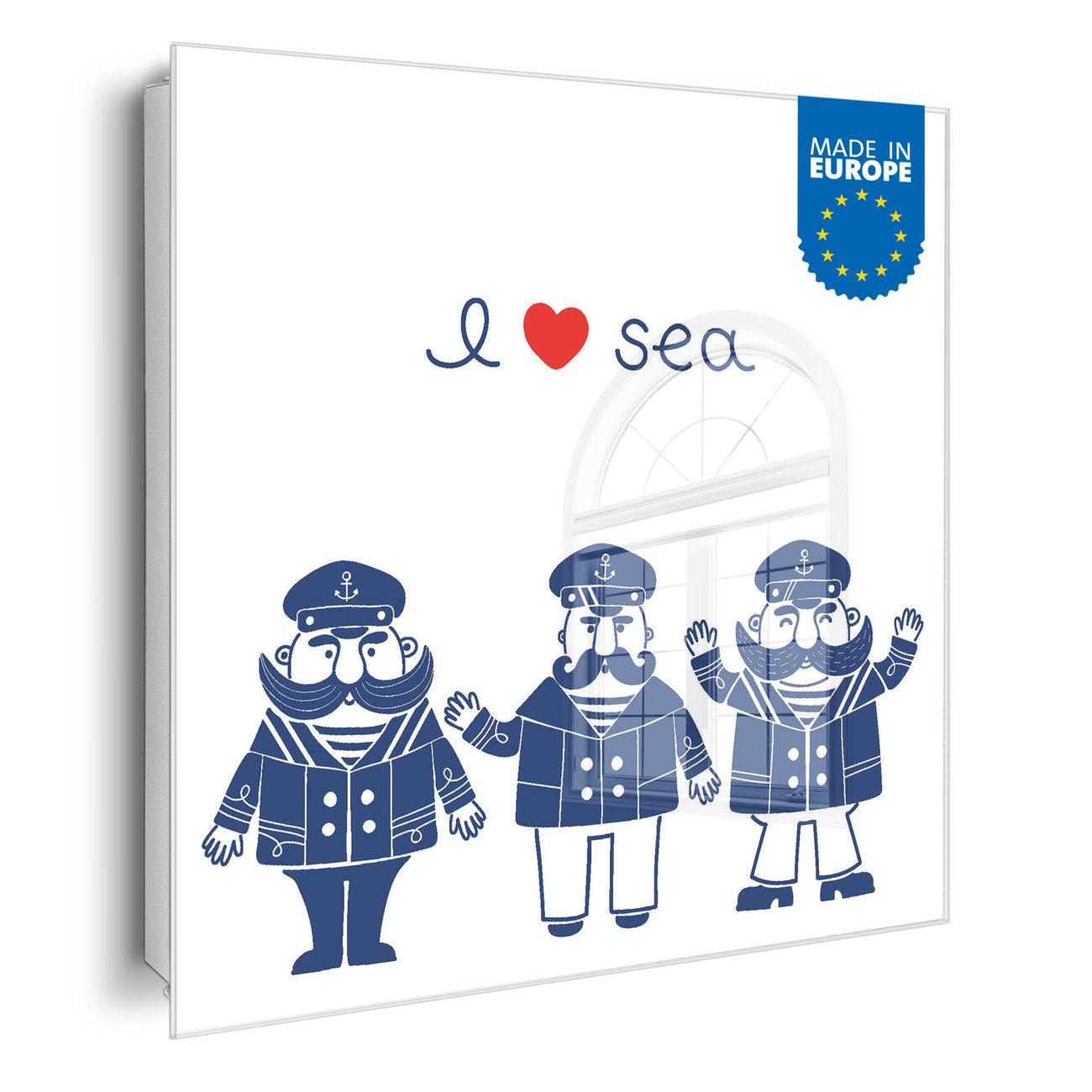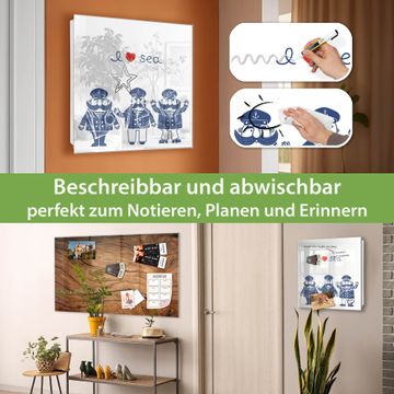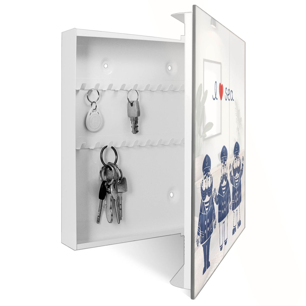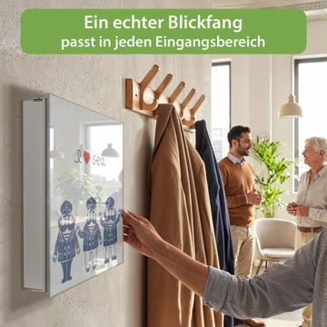 Bringe Ordnung und Eleganz in deinen Eingangsbereich mit dem banjado Schlüsselkasten Motiv Motiv I Love Sea. Die moderne Schlüsselbox kombiniert funktionales Design mit hochwertiger Verarbeitung und wird so zu einem echten Hingucker in Flur, Büro oder Ferienwohnung. ✅ Stilvolle Schlüsselaufbewahrung mit Glasfront im Motiv Motiv I Love Sea Der Design-Schlüsselkasten Motiv Motiv I Love Sea bietet Platz für bis zu 50 Schlüssel, die auf 5 stabilen Reihen mit je 10 Haken übersichtlich verstaut werden. Mit seinen kompakten Maßen von 30 x 30 x 5 cm passt die Schlüsselbox perfekt auch in kleinere Räume. Der weiß lackierte Stahlkorpus mit rechts angeschlagenem Türscharnier harmoniert mit der Glasfront und fügt sich nahtlos in jedes Wohnambiente ein. Ob als Schlüsselorganizer für Zuhause oder als praktische Lösung für Büros, Praxen und Gewerbe, der banjado Schlüsselkasten sorgt für Ordnung und Übersicht. Dank der magnetischen, mit Kreidestiften beschreibbaren Glasfront kannst du Notizen anheften oder Termine direkt auf der Oberfläche festhalten. Die Schlüsselbox Motiv Motiv I Love Sea zur Wandmontage wird inklusive Befestigungsmaterial geliefert und ist schnell angebracht. So hast du deine Schlüssel jederzeit griffbereit und zugleich stilvoll verstaut. Mit diesem banjado Schlüsselkasten Motiv Motiv I Love Sea kombinierst du praktische Aufbewahrung mit stilvollem Wohndesign. Ob privat oder geschäftlich, die Schlüsselbox sorgt für mehr Ordnung, Übersicht und ein wohnliches Ambiente.Vorteile im Überblick