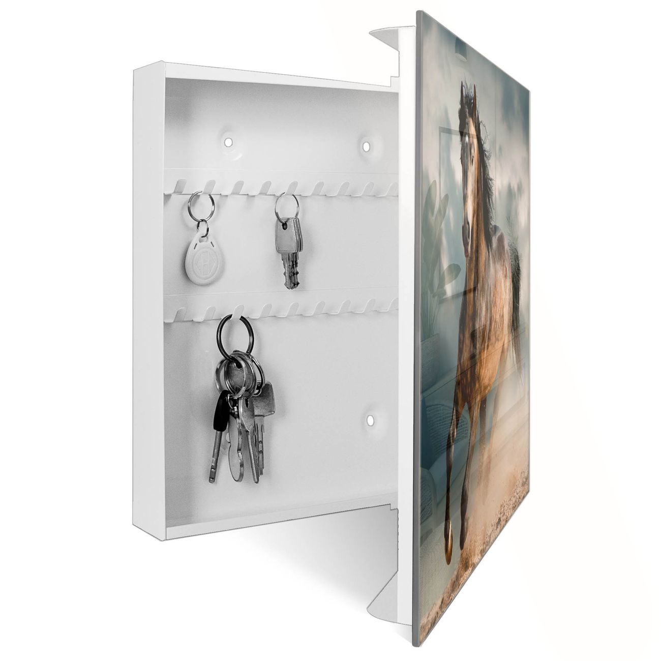 Bringe Ordnung und Eleganz in deinen Eingangsbereich mit dem banjado Schlüsselkasten Motiv Motiv Ibrahim. Die moderne Schlüsselbox kombiniert funktionales Design mit hochwertiger Verarbeitung und wird so zu einem echten Hingucker in Flur, Büro oder Ferienwohnung. ✅ Stilvolle Schlüsselaufbewahrung mit Glasfront im Motiv Motiv Ibrahim Der Design-Schlüsselkasten Motiv Motiv Ibrahim bietet Platz für bis zu 50 Schlüssel, die auf 5 stabilen Reihen mit je 10 Haken übersichtlich verstaut werden. Mit seinen kompakten Maßen von 30 x 30 x 5 cm passt die Schlüsselbox perfekt auch in kleinere Räume. Der weiß lackierte Stahlkorpus mit rechts angeschlagenem Türscharnier harmoniert mit der Glasfront und fügt sich nahtlos in jedes Wohnambiente ein. Ob als Schlüsselorganizer für Zuhause oder als praktische Lösung für Büros, Praxen und Gewerbe, der banjado Schlüsselkasten sorgt für Ordnung und Übersicht. Dank der magnetischen, mit Kreidestiften beschreibbaren Glasfront kannst du Notizen anheften oder Termine direkt auf der Oberfläche festhalten. Die Schlüsselbox Motiv Motiv Ibrahim zur Wandmontage wird inklusive Befestigungsmaterial geliefert und ist schnell angebracht. So hast du deine Schlüssel jederzeit griffbereit und zugleich stilvoll verstaut. Mit diesem banjado Schlüsselkasten Motiv Motiv Ibrahim kombinierst du praktische Aufbewahrung mit stilvollem Wohndesign. Ob privat oder geschäftlich, die Schlüsselbox sorgt für mehr Ordnung, Übersicht und ein wohnliches Ambiente.Vorteile im Überblick