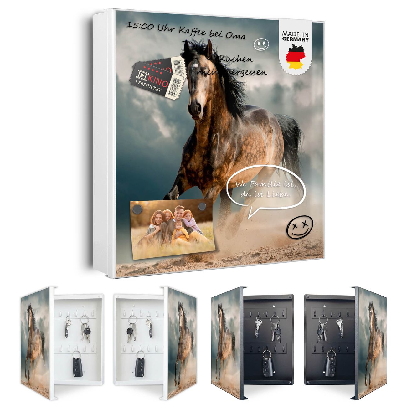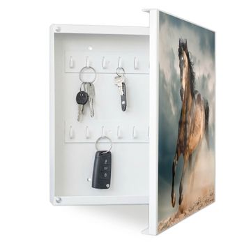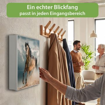 Bringe Ordnung und Eleganz in deinen Eingangsbereich mit dem banjado Schlüsselkasten Motiv Motiv Ibrahim. Die moderne Schlüsselbox kombiniert funktionales Design mit hochwertiger Verarbeitung und wird so zu einem echten Hingucker in Flur, Büro oder Ferienwohnung. ✅ Stilvolle Schlüsselaufbewahrung mit Motiv Motiv Ibrahim Der Design-Schlüsselkasten Motiv Motiv Ibrahim bietet Platz für bis zu 32 Schlüssel, die auf 4 stabilen Reihen mit je 8 Haken übersichtlich verstaut werden. Mit seinen kompakten Maßen von 30 x 30 x 5 cm passt die Schlüsselbox perfekt auch in kleinere Räume. Der weiß lackierte Stahlkorpus mit rechts angeschlagenem Türscharnier harmoniert mit gedruckten Folie auf der Front und fügt sich nahtlos in jedes Wohnambiente ein. Ob als Schlüsselorganizer für Zuhause oder als praktische Lösung für Büros, Praxen und Gewerbe, der banjado Schlüsselkasten sorgt für Ordnung und Übersicht. Dank der magnetischen, mit Kreidestiften beschreibbaren Folie auf der Front kannst du Notizen anheften oder Termine direkt auf der Oberfläche festhalten. Die Schlüsselbox Motiv Motiv Ibrahim zur Wandmontage wird inklusive Befestigungsmaterial geliefert und ist schnell angebracht. So hast du deine Schlüssel jederzeit griffbereit und zugleich stilvoll verstaut. Mit diesem banjado Schlüsselkasten Motiv Motiv Ibrahim kombinierst du praktische Aufbewahrung mit stilvollem Wohndesign. Ob privat oder geschäftlich, die Schlüsselbox sorgt für mehr Ordnung, Übersicht und ein wohnliches Ambiente.Vorteile im Überblick