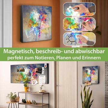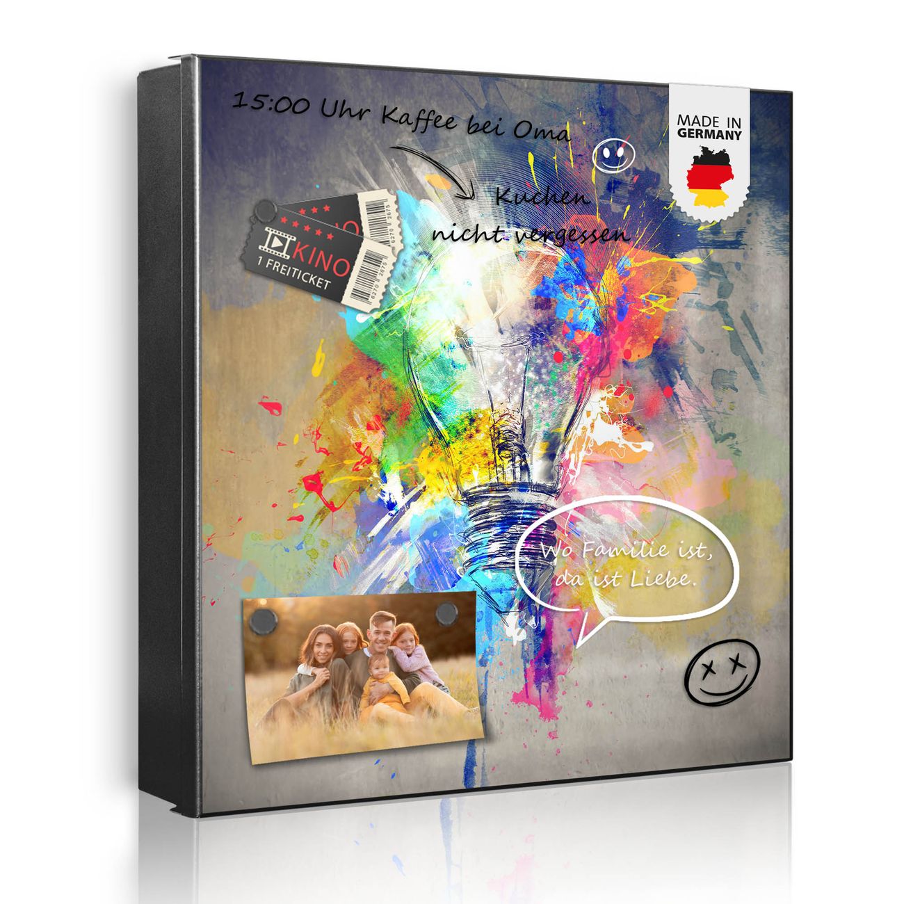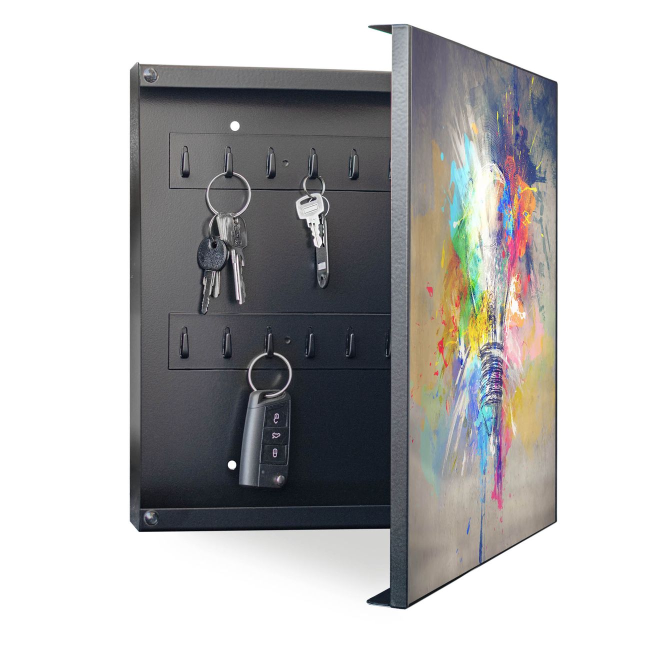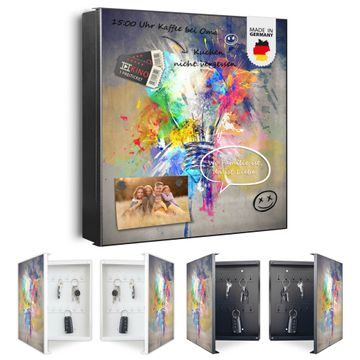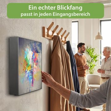 Bringe Ordnung und Eleganz in deinen Eingangsbereich mit dem banjado Schlüsselkasten Motiv Motiv Idee. Die moderne Schlüsselbox kombiniert funktionales Design mit hochwertiger Verarbeitung und wird so zu einem echten Hingucker in Flur, Büro oder Ferienwohnung. ✅ Stilvolle Schlüsselaufbewahrung mit Motiv Motiv Idee Der Design-Schlüsselkasten Motiv Motiv Idee bietet Platz für bis zu 32 Schlüssel, die auf 4 stabilen Reihen mit je 8 Haken übersichtlich verstaut werden. Mit seinen kompakten Maßen von 30 x 30 x 5 cm passt die Schlüsselbox perfekt auch in kleinere Räume. Der schwarz lackierte Stahlkorpus mit rechts angeschlagenem Türscharnier harmoniert mit gedruckten Folie auf der Front und fügt sich nahtlos in jedes Wohnambiente ein. Ob als Schlüsselorganizer für Zuhause oder als praktische Lösung für Büros, Praxen und Gewerbe, der banjado Schlüsselkasten sorgt für Ordnung und Übersicht. Dank der magnetischen, mit Kreidestiften beschreibbaren Folie auf der Front kannst du Notizen anheften oder Termine direkt auf der Oberfläche festhalten. Die Schlüsselbox Motiv Motiv Idee zur Wandmontage wird inklusive Befestigungsmaterial geliefert und ist schnell angebracht. So hast du deine Schlüssel jederzeit griffbereit und zugleich stilvoll verstaut. Mit diesem banjado Schlüsselkasten Motiv Motiv Idee kombinierst du praktische Aufbewahrung mit stilvollem Wohndesign. Ob privat oder geschäftlich, die Schlüsselbox sorgt für mehr Ordnung, Übersicht und ein wohnliches Ambiente.Vorteile im Überblick
