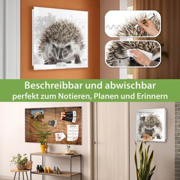 Bringe Ordnung und Eleganz in deinen Eingangsbereich mit dem banjado Schlüsselkasten Motiv Motiv Igel. Die moderne Schlüsselbox kombiniert funktionales Design mit hochwertiger Verarbeitung und wird so zu einem echten Hingucker in Flur, Büro oder Ferienwohnung. ✅ Stilvolle Schlüsselaufbewahrung mit Glasfront im Motiv Motiv Igel Der Design-Schlüsselkasten Motiv Motiv Igel bietet Platz für bis zu 50 Schlüssel, die auf 5 stabilen Reihen mit je 10 Haken übersichtlich verstaut werden. Mit seinen kompakten Maßen von 30 x 30 x 5 cm passt die Schlüsselbox perfekt auch in kleinere Räume. Der weiß lackierte Stahlkorpus mit rechts angeschlagenem Türscharnier harmoniert mit der Glasfront und fügt sich nahtlos in jedes Wohnambiente ein. Ob als Schlüsselorganizer für Zuhause oder als praktische Lösung für Büros, Praxen und Gewerbe, der banjado Schlüsselkasten sorgt für Ordnung und Übersicht. Dank der magnetischen, mit Kreidestiften beschreibbaren Glasfront kannst du Notizen anheften oder Termine direkt auf der Oberfläche festhalten. Die Schlüsselbox Motiv Motiv Igel zur Wandmontage wird inklusive Befestigungsmaterial geliefert und ist schnell angebracht. So hast du deine Schlüssel jederzeit griffbereit und zugleich stilvoll verstaut. Mit diesem banjado Schlüsselkasten Motiv Motiv Igel kombinierst du praktische Aufbewahrung mit stilvollem Wohndesign. Ob privat oder geschäftlich, die Schlüsselbox sorgt für mehr Ordnung, Übersicht und ein wohnliches Ambiente.Vorteile im Überblick