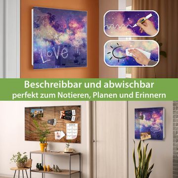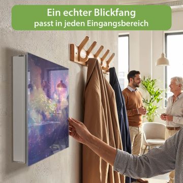 Bringe Ordnung und Eleganz in deinen Eingangsbereich mit dem banjado Schlüsselkasten Motiv Motiv Im Weltall 1. Die moderne Schlüsselbox kombiniert funktionales Design mit hochwertiger Verarbeitung und wird so zu einem echten Hingucker in Flur, Büro oder Ferienwohnung. ✅ Stilvolle Schlüsselaufbewahrung mit Glasfront im Motiv Motiv Im Weltall 1 Der Design-Schlüsselkasten Motiv Motiv Im Weltall 1 bietet Platz für bis zu 50 Schlüssel, die auf 5 stabilen Reihen mit je 10 Haken übersichtlich verstaut werden. Mit seinen kompakten Maßen von 30 x 30 x 5 cm passt die Schlüsselbox perfekt auch in kleinere Räume. Der weiß lackierte Stahlkorpus mit rechts angeschlagenem Türscharnier harmoniert mit der Glasfront und fügt sich nahtlos in jedes Wohnambiente ein. Ob als Schlüsselorganizer für Zuhause oder als praktische Lösung für Büros, Praxen und Gewerbe, der banjado Schlüsselkasten sorgt für Ordnung und Übersicht. Dank der magnetischen, mit Kreidestiften beschreibbaren Glasfront kannst du Notizen anheften oder Termine direkt auf der Oberfläche festhalten. Die Schlüsselbox Motiv Motiv Im Weltall 1 zur Wandmontage wird inklusive Befestigungsmaterial geliefert und ist schnell angebracht. So hast du deine Schlüssel jederzeit griffbereit und zugleich stilvoll verstaut. Mit diesem banjado Schlüsselkasten Motiv Motiv Im Weltall 1 kombinierst du praktische Aufbewahrung mit stilvollem Wohndesign. Ob privat oder geschäftlich, die Schlüsselbox sorgt für mehr Ordnung, Übersicht und ein wohnliches Ambiente.Vorteile im Überblick