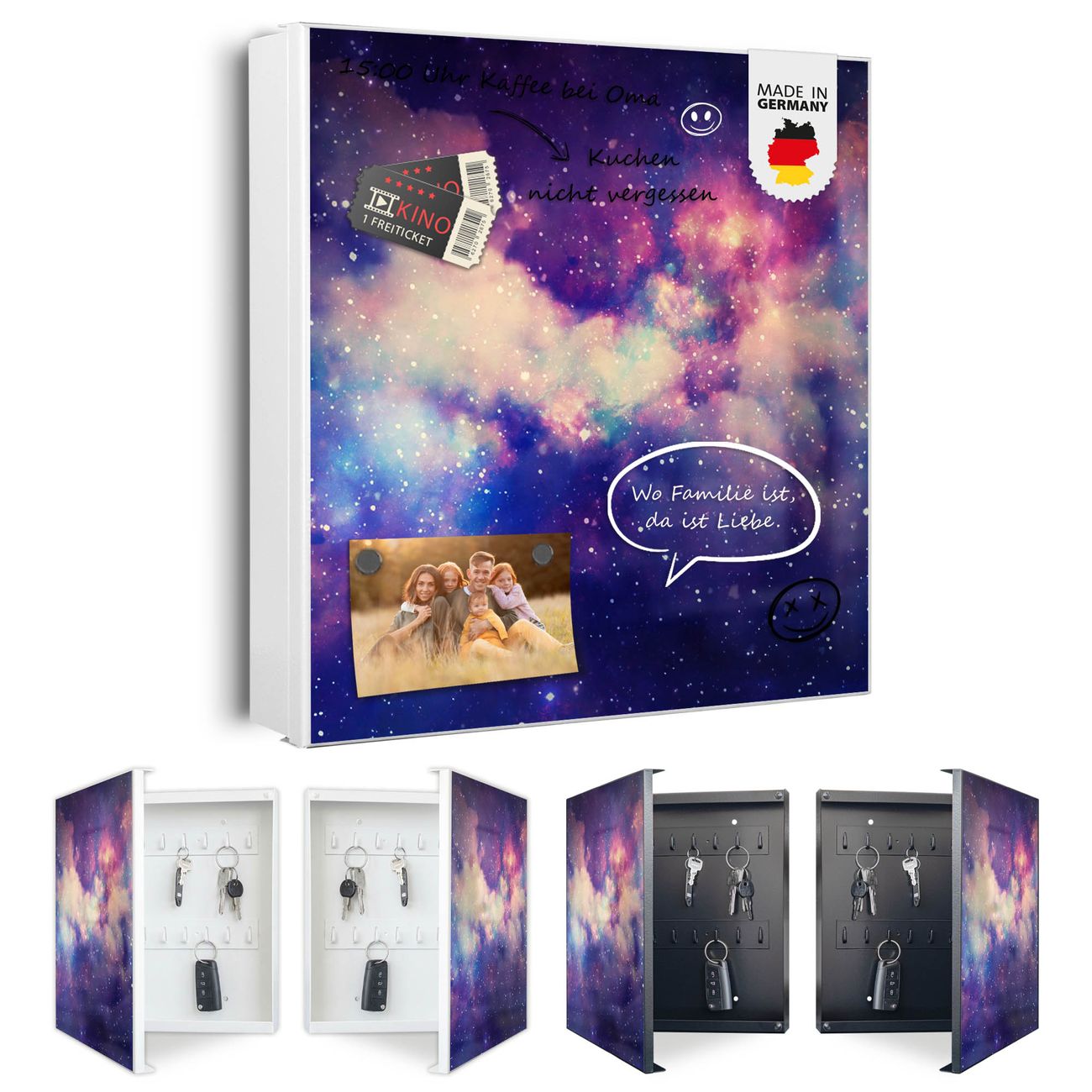 Bringe Ordnung und Eleganz in deinen Eingangsbereich mit dem banjado Schlüsselkasten Motiv Motiv Im Weltall 1. Die moderne Schlüsselbox kombiniert funktionales Design mit hochwertiger Verarbeitung und wird so zu einem echten Hingucker in Flur, Büro oder Ferienwohnung. ✅ Stilvolle Schlüsselaufbewahrung mit Motiv Motiv Im Weltall 1 Der Design-Schlüsselkasten Motiv Motiv Im Weltall 1 bietet Platz für bis zu 32 Schlüssel, die auf 4 stabilen Reihen mit je 8 Haken übersichtlich verstaut werden. Mit seinen kompakten Maßen von 30 x 30 x 5 cm passt die Schlüsselbox perfekt auch in kleinere Räume. Der weiß lackierte Stahlkorpus mit links angeschlagenem Türscharnier harmoniert mit gedruckten Folie auf der Front und fügt sich nahtlos in jedes Wohnambiente ein. Ob als Schlüsselorganizer für Zuhause oder als praktische Lösung für Büros, Praxen und Gewerbe, der banjado Schlüsselkasten sorgt für Ordnung und Übersicht. Dank der magnetischen, mit Kreidestiften beschreibbaren Folie auf der Front kannst du Notizen anheften oder Termine direkt auf der Oberfläche festhalten. Die Schlüsselbox Motiv Motiv Im Weltall 1 zur Wandmontage wird inklusive Befestigungsmaterial geliefert und ist schnell angebracht. So hast du deine Schlüssel jederzeit griffbereit und zugleich stilvoll verstaut. Mit diesem banjado Schlüsselkasten Motiv Motiv Im Weltall 1 kombinierst du praktische Aufbewahrung mit stilvollem Wohndesign. Ob privat oder geschäftlich, die Schlüsselbox sorgt für mehr Ordnung, Übersicht und ein wohnliches Ambiente.Vorteile im Überblick