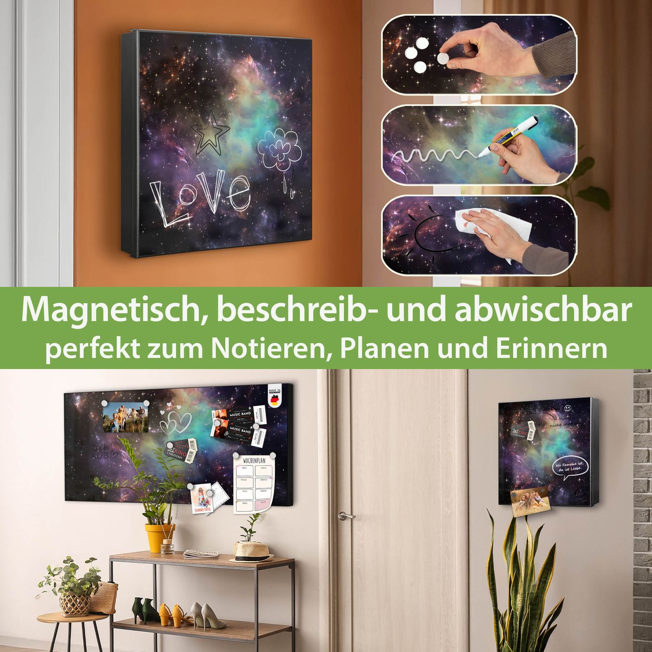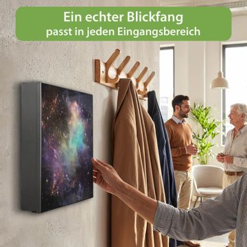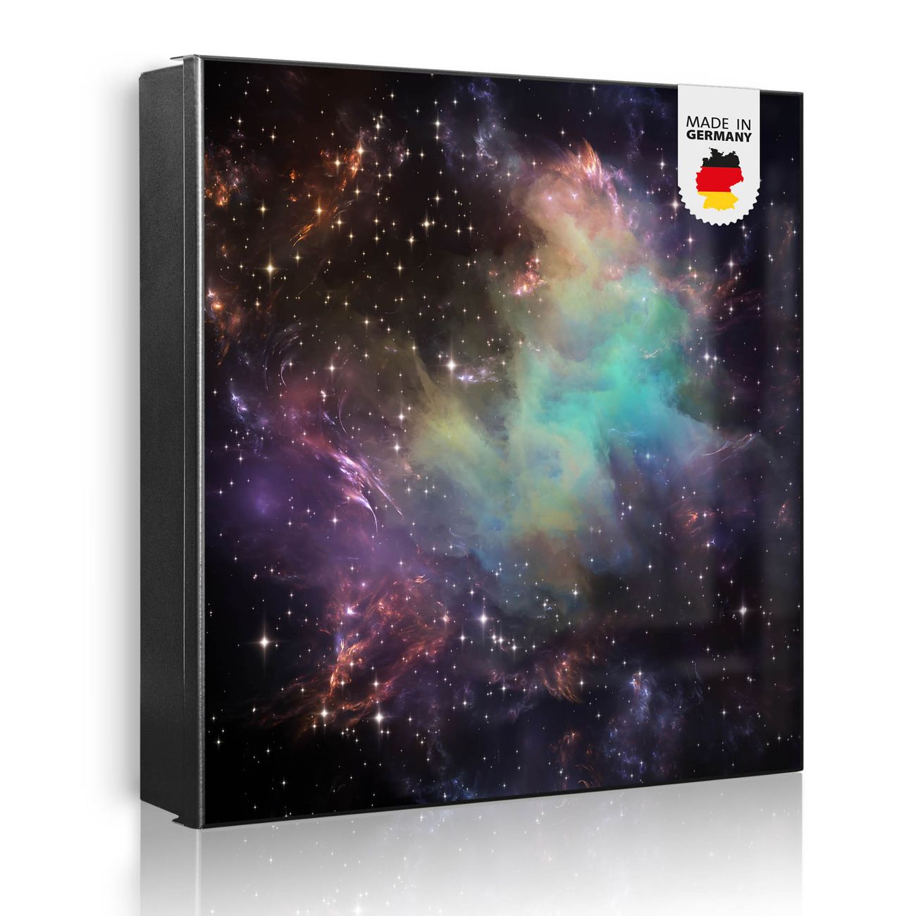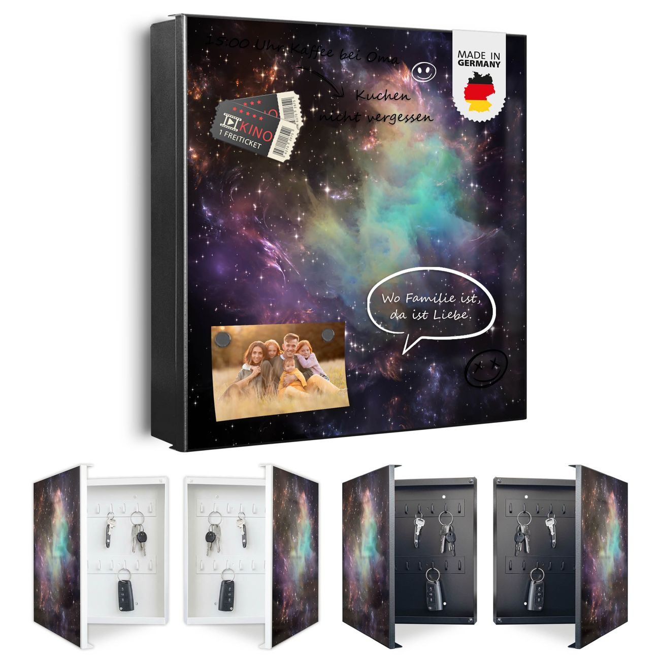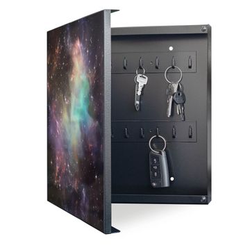 Bringe Ordnung und Eleganz in deinen Eingangsbereich mit dem banjado Schlüsselkasten Motiv Motiv Im Weltall 2. Die moderne Schlüsselbox kombiniert funktionales Design mit hochwertiger Verarbeitung und wird so zu einem echten Hingucker in Flur, Büro oder Ferienwohnung. ✅ Stilvolle Schlüsselaufbewahrung mit Motiv Motiv Im Weltall 2 Der Design-Schlüsselkasten Motiv Motiv Im Weltall 2 bietet Platz für bis zu 32 Schlüssel, die auf 4 stabilen Reihen mit je 8 Haken übersichtlich verstaut werden. Mit seinen kompakten Maßen von 30 x 30 x 5 cm passt die Schlüsselbox perfekt auch in kleinere Räume. Der schwarz lackierte Stahlkorpus mit links angeschlagenem Türscharnier harmoniert mit gedruckten Folie auf der Front und fügt sich nahtlos in jedes Wohnambiente ein. Ob als Schlüsselorganizer für Zuhause oder als praktische Lösung für Büros, Praxen und Gewerbe, der banjado Schlüsselkasten sorgt für Ordnung und Übersicht. Dank der magnetischen, mit Kreidestiften beschreibbaren Folie auf der Front kannst du Notizen anheften oder Termine direkt auf der Oberfläche festhalten. Die Schlüsselbox Motiv Motiv Im Weltall 2 zur Wandmontage wird inklusive Befestigungsmaterial geliefert und ist schnell angebracht. So hast du deine Schlüssel jederzeit griffbereit und zugleich stilvoll verstaut. Mit diesem banjado Schlüsselkasten Motiv Motiv Im Weltall 2 kombinierst du praktische Aufbewahrung mit stilvollem Wohndesign. Ob privat oder geschäftlich, die Schlüsselbox sorgt für mehr Ordnung, Übersicht und ein wohnliches Ambiente.Vorteile im Überblick