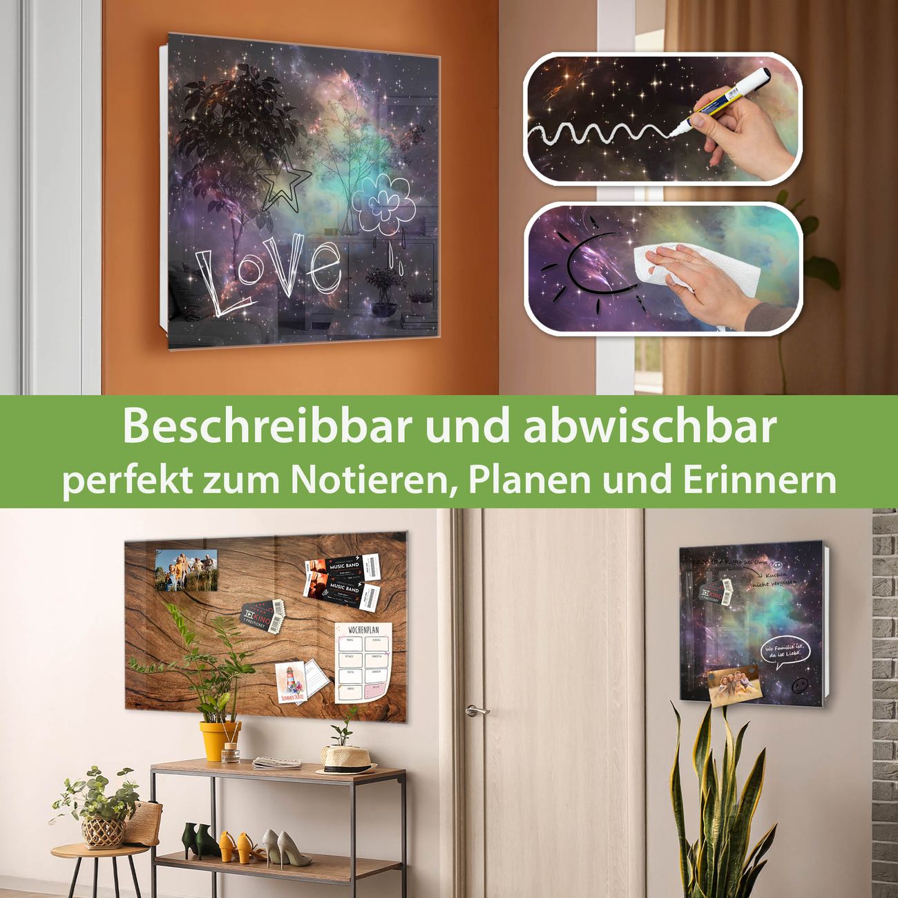 Bringe Ordnung und Eleganz in deinen Eingangsbereich mit dem banjado Schlüsselkasten Motiv Motiv Im Weltall 2. Die moderne Schlüsselbox kombiniert funktionales Design mit hochwertiger Verarbeitung und wird so zu einem echten Hingucker in Flur, Büro oder Ferienwohnung. ✅ Stilvolle Schlüsselaufbewahrung mit Glasfront im Motiv Motiv Im Weltall 2 Der Design-Schlüsselkasten Motiv Motiv Im Weltall 2 bietet Platz für bis zu 50 Schlüssel, die auf 5 stabilen Reihen mit je 10 Haken übersichtlich verstaut werden. Mit seinen kompakten Maßen von 30 x 30 x 5 cm passt die Schlüsselbox perfekt auch in kleinere Räume. Der weiß lackierte Stahlkorpus mit rechts angeschlagenem Türscharnier harmoniert mit der Glasfront und fügt sich nahtlos in jedes Wohnambiente ein. Ob als Schlüsselorganizer für Zuhause oder als praktische Lösung für Büros, Praxen und Gewerbe, der banjado Schlüsselkasten sorgt für Ordnung und Übersicht. Dank der magnetischen, mit Kreidestiften beschreibbaren Glasfront kannst du Notizen anheften oder Termine direkt auf der Oberfläche festhalten. Die Schlüsselbox Motiv Motiv Im Weltall 2 zur Wandmontage wird inklusive Befestigungsmaterial geliefert und ist schnell angebracht. So hast du deine Schlüssel jederzeit griffbereit und zugleich stilvoll verstaut. Mit diesem banjado Schlüsselkasten Motiv Motiv Im Weltall 2 kombinierst du praktische Aufbewahrung mit stilvollem Wohndesign. Ob privat oder geschäftlich, die Schlüsselbox sorgt für mehr Ordnung, Übersicht und ein wohnliches Ambiente.Vorteile im Überblick