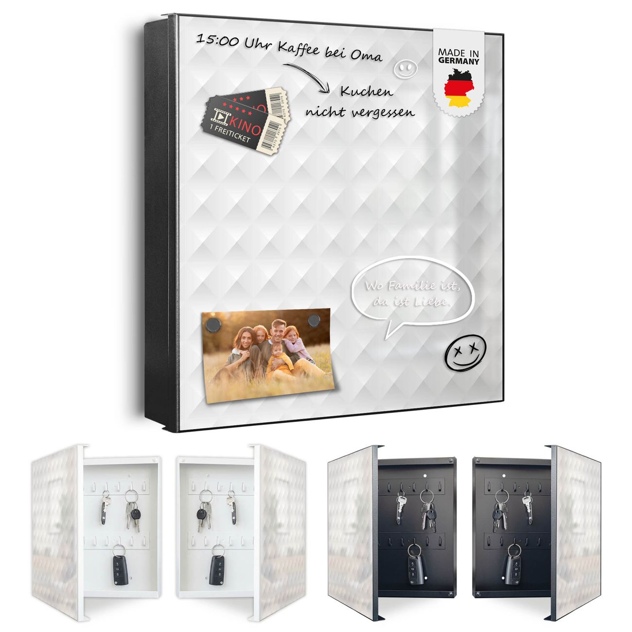 Bringe Ordnung und Eleganz in deinen Eingangsbereich mit dem banjado Schlüsselkasten Motiv Motiv In Out. Die moderne Schlüsselbox kombiniert funktionales Design mit hochwertiger Verarbeitung und wird so zu einem echten Hingucker in Flur, Büro oder Ferienwohnung. ✅ Stilvolle Schlüsselaufbewahrung mit Motiv Motiv In Out Der Design-Schlüsselkasten Motiv Motiv In Out bietet Platz für bis zu 32 Schlüssel, die auf 4 stabilen Reihen mit je 8 Haken übersichtlich verstaut werden. Mit seinen kompakten Maßen von 30 x 30 x 5 cm passt die Schlüsselbox perfekt auch in kleinere Räume. Der schwarz lackierte Stahlkorpus mit rechts angeschlagenem Türscharnier harmoniert mit gedruckten Folie auf der Front und fügt sich nahtlos in jedes Wohnambiente ein. Ob als Schlüsselorganizer für Zuhause oder als praktische Lösung für Büros, Praxen und Gewerbe, der banjado Schlüsselkasten sorgt für Ordnung und Übersicht. Dank der magnetischen, mit Kreidestiften beschreibbaren Folie auf der Front kannst du Notizen anheften oder Termine direkt auf der Oberfläche festhalten. Die Schlüsselbox Motiv Motiv In Out zur Wandmontage wird inklusive Befestigungsmaterial geliefert und ist schnell angebracht. So hast du deine Schlüssel jederzeit griffbereit und zugleich stilvoll verstaut. Mit diesem banjado Schlüsselkasten Motiv Motiv In Out kombinierst du praktische Aufbewahrung mit stilvollem Wohndesign. Ob privat oder geschäftlich, die Schlüsselbox sorgt für mehr Ordnung, Übersicht und ein wohnliches Ambiente.Vorteile im Überblick