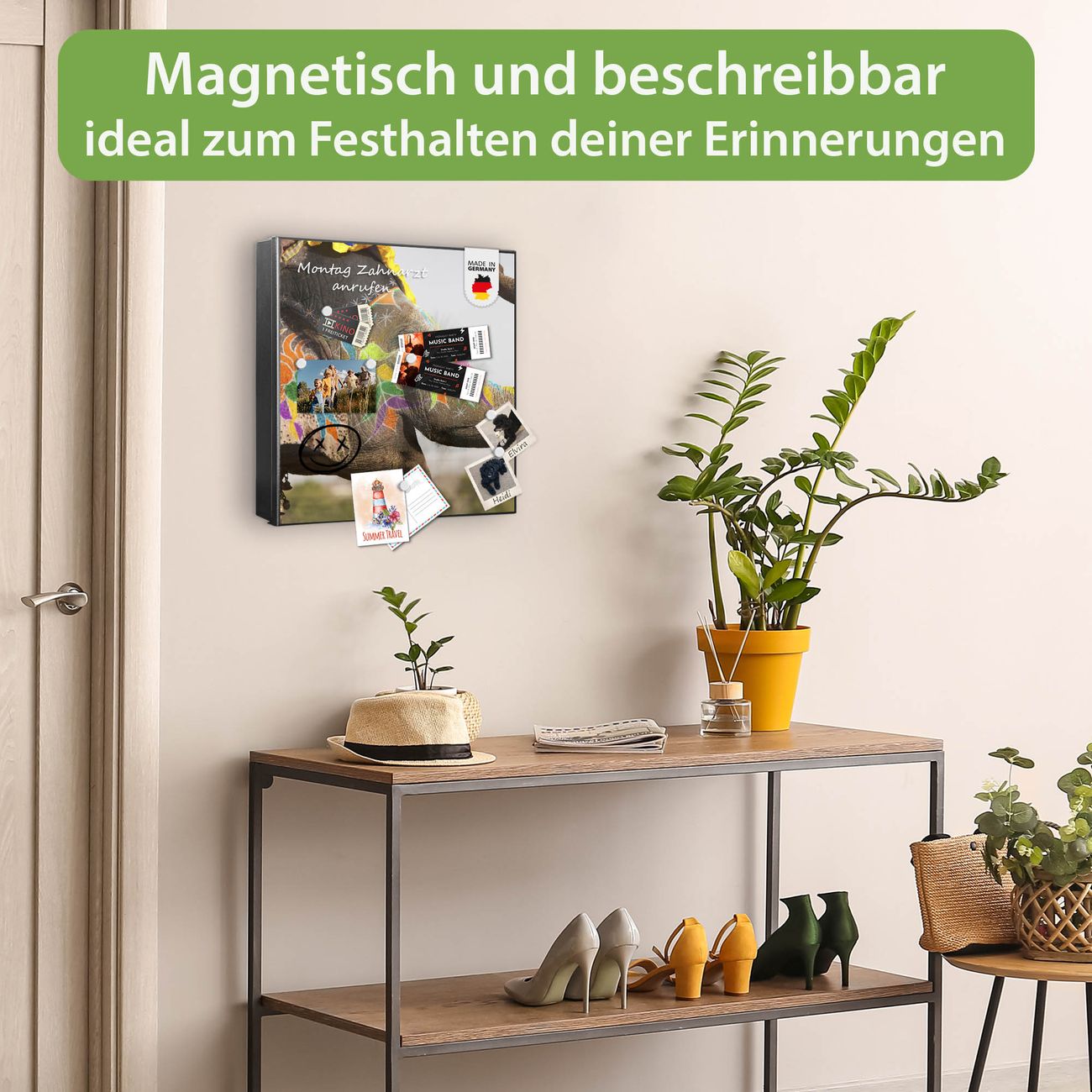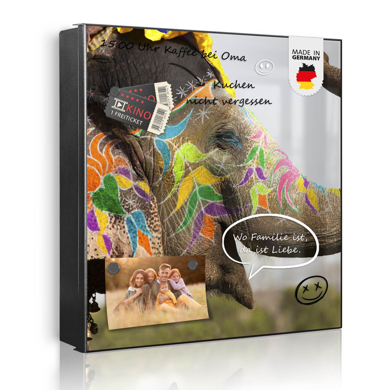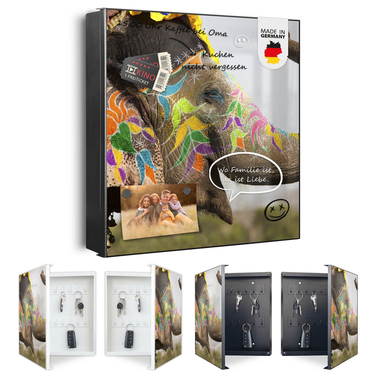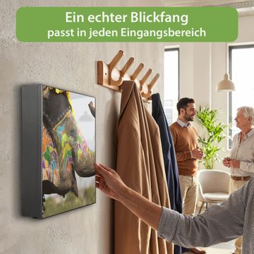 Bringe Ordnung und Eleganz in deinen Eingangsbereich mit dem banjado Schlüsselkasten Motiv Motiv Indischer Elephant. Die moderne Schlüsselbox kombiniert funktionales Design mit hochwertiger Verarbeitung und wird so zu einem echten Hingucker in Flur, Büro oder Ferienwohnung. ✅ Stilvolle Schlüsselaufbewahrung mit Motiv Motiv Indischer Elephant Der Design-Schlüsselkasten Motiv Motiv Indischer Elephant bietet Platz für bis zu 32 Schlüssel, die auf 4 stabilen Reihen mit je 8 Haken übersichtlich verstaut werden. Mit seinen kompakten Maßen von 30 x 30 x 5 cm passt die Schlüsselbox perfekt auch in kleinere Räume. Der schwarz lackierte Stahlkorpus mit rechts angeschlagenem Türscharnier harmoniert mit gedruckten Folie auf der Front und fügt sich nahtlos in jedes Wohnambiente ein. Ob als Schlüsselorganizer für Zuhause oder als praktische Lösung für Büros, Praxen und Gewerbe, der banjado Schlüsselkasten sorgt für Ordnung und Übersicht. Dank der magnetischen, mit Kreidestiften beschreibbaren Folie auf der Front kannst du Notizen anheften oder Termine direkt auf der Oberfläche festhalten. Die Schlüsselbox Motiv Motiv Indischer Elephant zur Wandmontage wird inklusive Befestigungsmaterial geliefert und ist schnell angebracht. So hast du deine Schlüssel jederzeit griffbereit und zugleich stilvoll verstaut. Mit diesem banjado Schlüsselkasten Motiv Motiv Indischer Elephant kombinierst du praktische Aufbewahrung mit stilvollem Wohndesign. Ob privat oder geschäftlich, die Schlüsselbox sorgt für mehr Ordnung, Übersicht und ein wohnliches Ambiente.Vorteile im Überblick