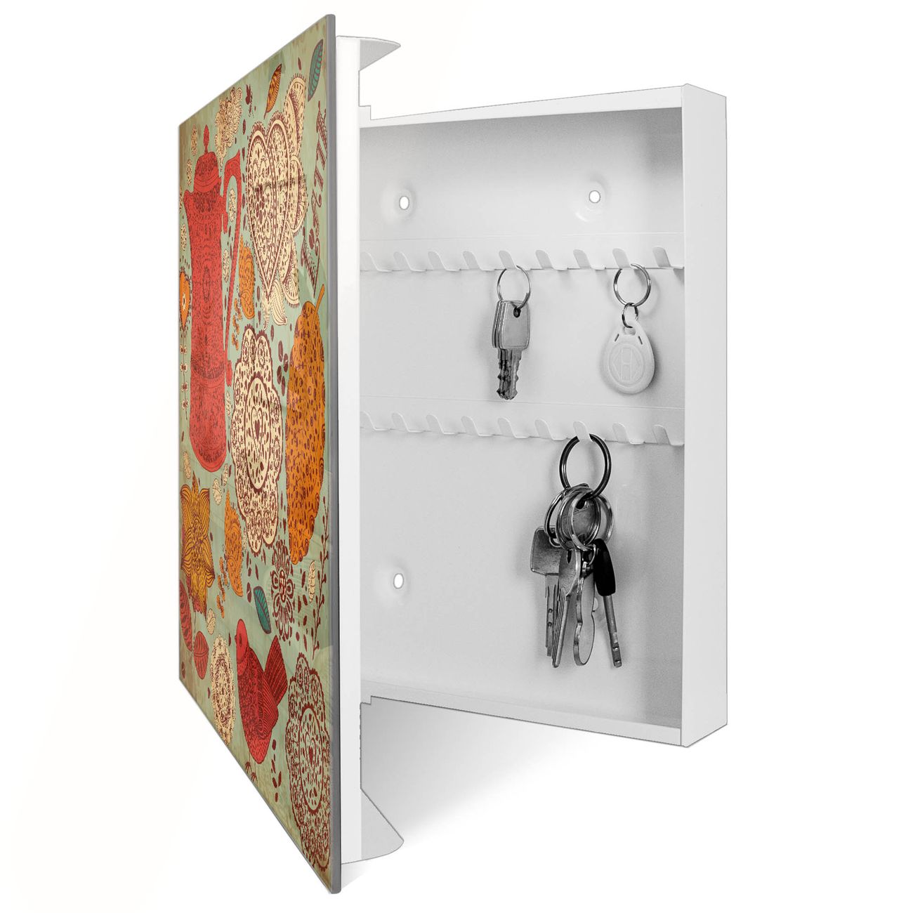 Bringe Ordnung und Eleganz in deinen Eingangsbereich mit dem banjado Schlüsselkasten Motiv Motiv Indischer Kaffee. Die moderne Schlüsselbox kombiniert funktionales Design mit hochwertiger Verarbeitung und wird so zu einem echten Hingucker in Flur, Büro oder Ferienwohnung. ✅ Stilvolle Schlüsselaufbewahrung mit Glasfront im Motiv Motiv Indischer Kaffee Der Design-Schlüsselkasten Motiv Motiv Indischer Kaffee bietet Platz für bis zu 50 Schlüssel, die auf 5 stabilen Reihen mit je 10 Haken übersichtlich verstaut werden. Mit seinen kompakten Maßen von 30 x 30 x 5 cm passt die Schlüsselbox perfekt auch in kleinere Räume. Der weiß lackierte Stahlkorpus mit rechts angeschlagenem Türscharnier harmoniert mit der Glasfront und fügt sich nahtlos in jedes Wohnambiente ein. Ob als Schlüsselorganizer für Zuhause oder als praktische Lösung für Büros, Praxen und Gewerbe, der banjado Schlüsselkasten sorgt für Ordnung und Übersicht. Dank der magnetischen, mit Kreidestiften beschreibbaren Glasfront kannst du Notizen anheften oder Termine direkt auf der Oberfläche festhalten. Die Schlüsselbox Motiv Motiv Indischer Kaffee zur Wandmontage wird inklusive Befestigungsmaterial geliefert und ist schnell angebracht. So hast du deine Schlüssel jederzeit griffbereit und zugleich stilvoll verstaut. Mit diesem banjado Schlüsselkasten Motiv Motiv Indischer Kaffee kombinierst du praktische Aufbewahrung mit stilvollem Wohndesign. Ob privat oder geschäftlich, die Schlüsselbox sorgt für mehr Ordnung, Übersicht und ein wohnliches Ambiente.Vorteile im Überblick
