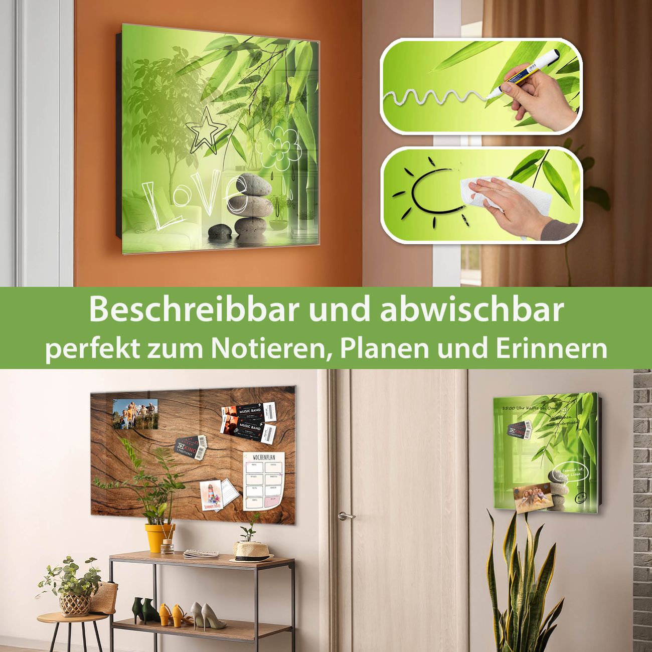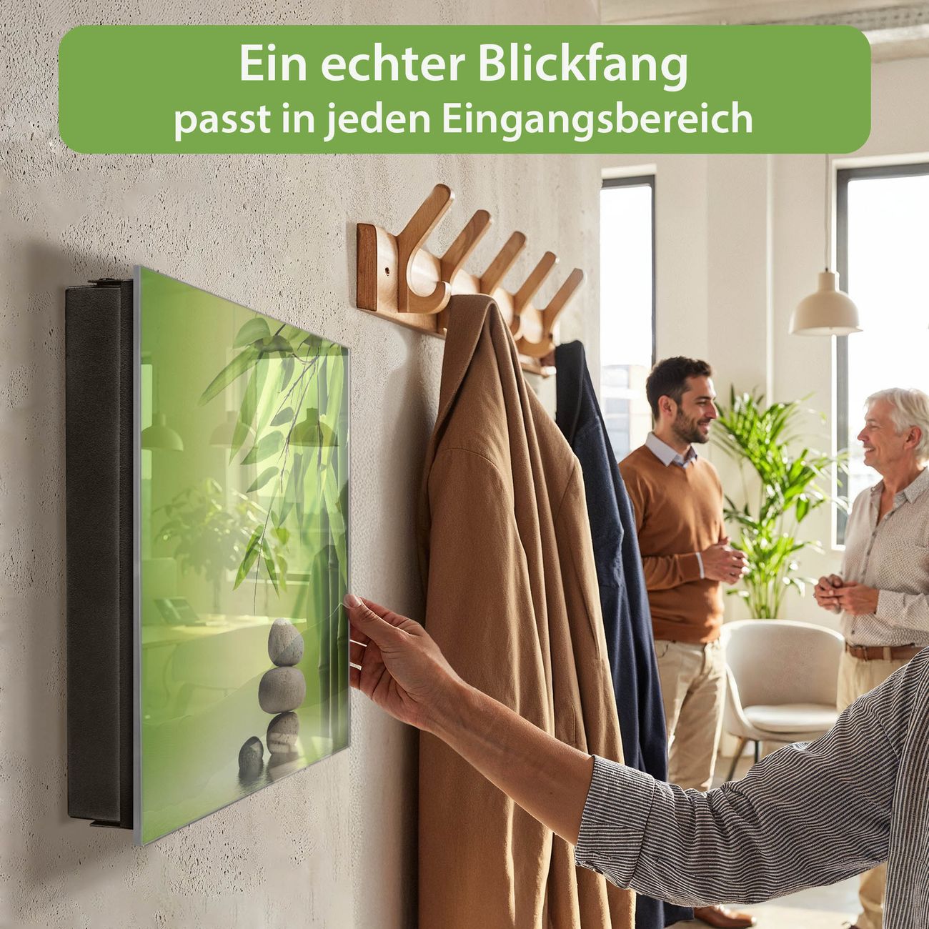 Bringe Ordnung und Eleganz in deinen Eingangsbereich mit dem banjado Schlüsselkasten Motiv Motiv Innere Ruhe. Die moderne Schlüsselbox kombiniert funktionales Design mit hochwertiger Verarbeitung und wird so zu einem echten Hingucker in Flur, Büro oder Ferienwohnung. ✅ Stilvolle Schlüsselaufbewahrung mit Glasfront im Motiv Motiv Innere Ruhe Der Design-Schlüsselkasten Motiv Motiv Innere Ruhe bietet Platz für bis zu 50 Schlüssel, die auf 5 stabilen Reihen mit je 10 Haken übersichtlich verstaut werden. Mit seinen kompakten Maßen von 30 x 30 x 5 cm passt die Schlüsselbox perfekt auch in kleinere Räume. Der schwarz lackierte Stahlkorpus mit rechts angeschlagenem Türscharnier harmoniert mit der Glasfront und fügt sich nahtlos in jedes Wohnambiente ein. Ob als Schlüsselorganizer für Zuhause oder als praktische Lösung für Büros, Praxen und Gewerbe, der banjado Schlüsselkasten sorgt für Ordnung und Übersicht. Dank der magnetischen, mit Kreidestiften beschreibbaren Glasfront kannst du Notizen anheften oder Termine direkt auf der Oberfläche festhalten. Die Schlüsselbox Motiv Motiv Innere Ruhe zur Wandmontage wird inklusive Befestigungsmaterial geliefert und ist schnell angebracht. So hast du deine Schlüssel jederzeit griffbereit und zugleich stilvoll verstaut. Mit diesem banjado Schlüsselkasten Motiv Motiv Innere Ruhe kombinierst du praktische Aufbewahrung mit stilvollem Wohndesign. Ob privat oder geschäftlich, die Schlüsselbox sorgt für mehr Ordnung, Übersicht und ein wohnliches Ambiente.Vorteile im Überblick
