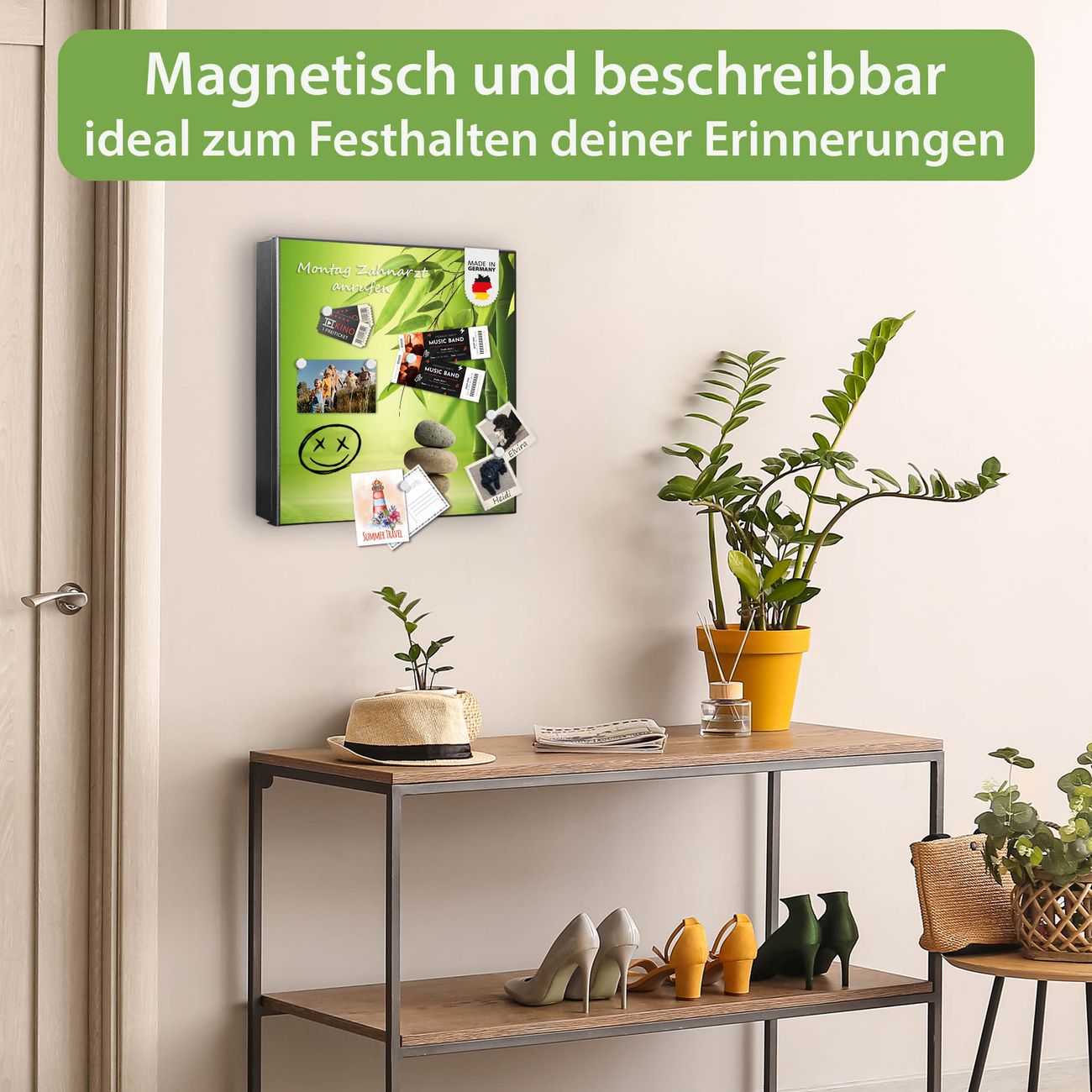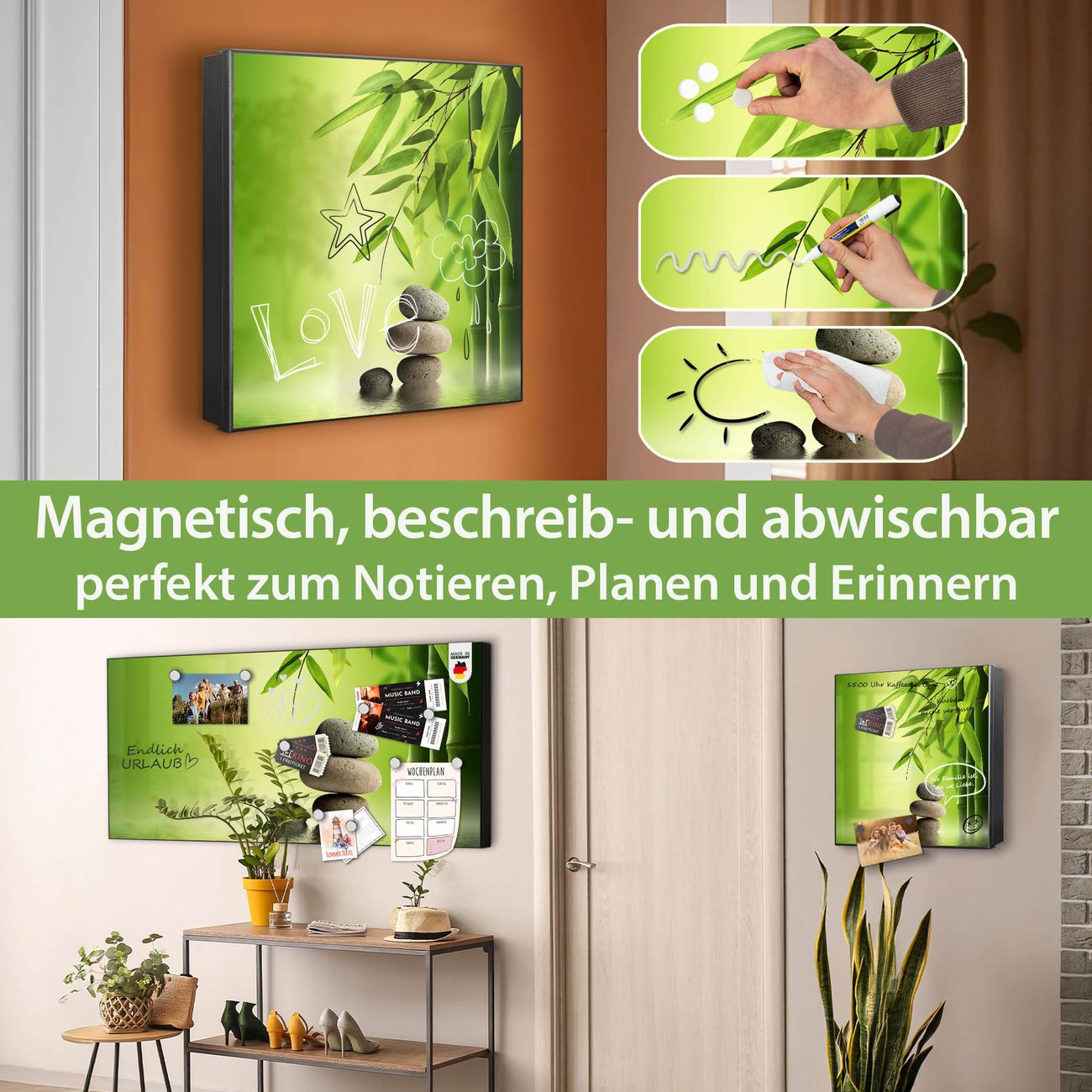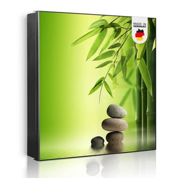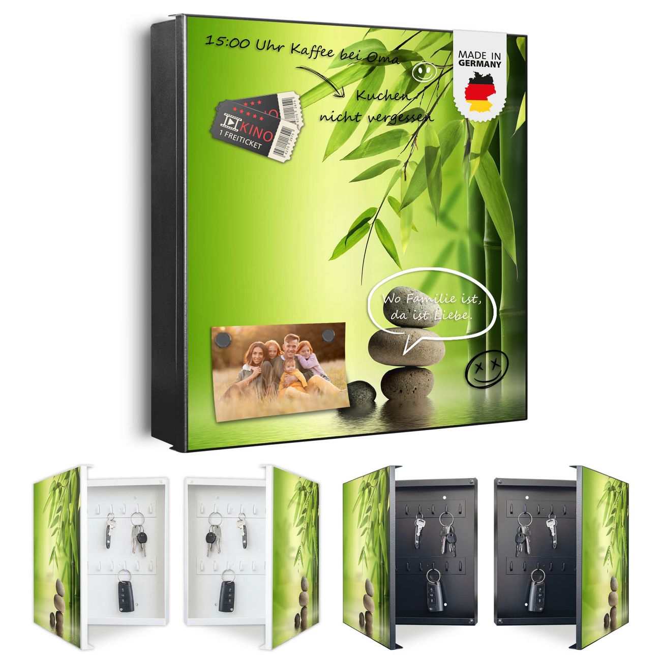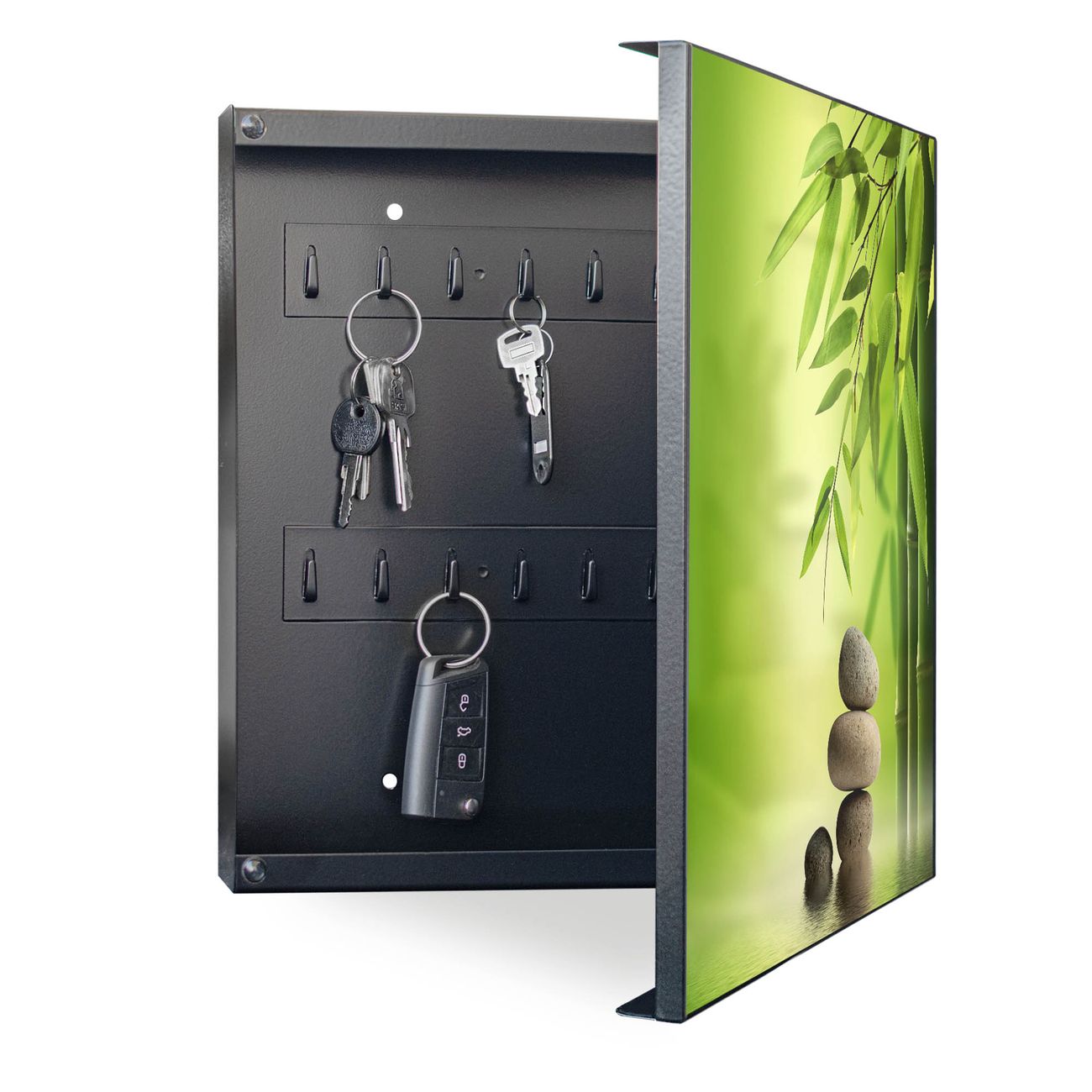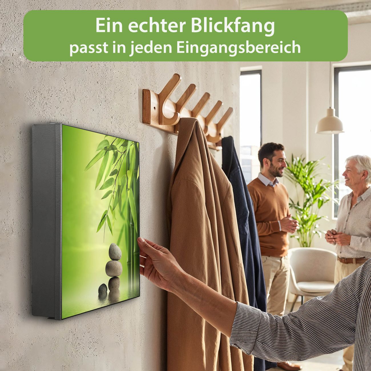 Bringe Ordnung und Eleganz in deinen Eingangsbereich mit dem banjado Schlüsselkasten Motiv Motiv Innere Ruhe. Die moderne Schlüsselbox kombiniert funktionales Design mit hochwertiger Verarbeitung und wird so zu einem echten Hingucker in Flur, Büro oder Ferienwohnung. ✅ Stilvolle Schlüsselaufbewahrung mit Motiv Motiv Innere Ruhe Der Design-Schlüsselkasten Motiv Motiv Innere Ruhe bietet Platz für bis zu 32 Schlüssel, die auf 4 stabilen Reihen mit je 8 Haken übersichtlich verstaut werden. Mit seinen kompakten Maßen von 30 x 30 x 5 cm passt die Schlüsselbox perfekt auch in kleinere Räume. Der schwarz lackierte Stahlkorpus mit rechts angeschlagenem Türscharnier harmoniert mit gedruckten Folie auf der Front und fügt sich nahtlos in jedes Wohnambiente ein. Ob als Schlüsselorganizer für Zuhause oder als praktische Lösung für Büros, Praxen und Gewerbe, der banjado Schlüsselkasten sorgt für Ordnung und Übersicht. Dank der magnetischen, mit Kreidestiften beschreibbaren Folie auf der Front kannst du Notizen anheften oder Termine direkt auf der Oberfläche festhalten. Die Schlüsselbox Motiv Motiv Innere Ruhe zur Wandmontage wird inklusive Befestigungsmaterial geliefert und ist schnell angebracht. So hast du deine Schlüssel jederzeit griffbereit und zugleich stilvoll verstaut. Mit diesem banjado Schlüsselkasten Motiv Motiv Innere Ruhe kombinierst du praktische Aufbewahrung mit stilvollem Wohndesign. Ob privat oder geschäftlich, die Schlüsselbox sorgt für mehr Ordnung, Übersicht und ein wohnliches Ambiente.Vorteile im Überblick