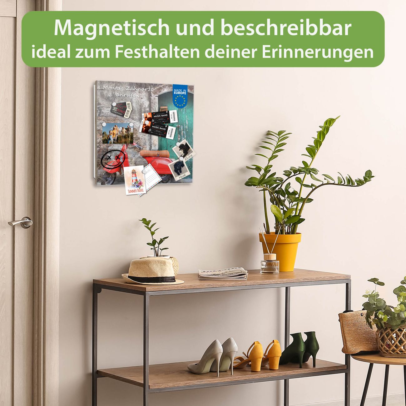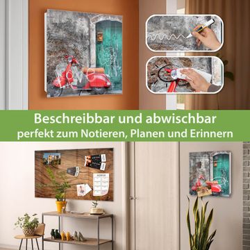Bringe Ordnung und Eleganz in deinen Eingangsbereich mit dem banjado Schlüsselkasten Motiv Motiv Italienischer Roller. Die moderne Schlüsselbox kombiniert funktionales Design mit hochwertiger Verarbeitung und wird so zu einem echten Hingucker in Flur, Büro oder Ferienwohnung. ✅ Stilvolle Schlüsselaufbewahrung mit Glasfront im Motiv Motiv Italienischer Roller Der Design-Schlüsselkasten Motiv Motiv Italienischer Roller bietet Platz für bis zu 50 Schlüssel, die auf 5 stabilen Reihen mit je 10 Haken übersichtlich verstaut werden. Mit seinen kompakten Maßen von 30 x 30 x 5 cm passt die Schlüsselbox perfekt auch in kleinere Räume. Der weiß lackierte Stahlkorpus mit rechts angeschlagenem Türscharnier harmoniert mit der Glasfront und fügt sich nahtlos in jedes Wohnambiente ein. Ob als Schlüsselorganizer für Zuhause oder als praktische Lösung für Büros, Praxen und Gewerbe, der banjado Schlüsselkasten sorgt für Ordnung und Übersicht. Dank der magnetischen, mit Kreidestiften beschreibbaren Glasfront kannst du Notizen anheften oder Termine direkt auf der Oberfläche festhalten. Die Schlüsselbox Motiv Motiv Italienischer Roller zur Wandmontage wird inklusive Befestigungsmaterial geliefert und ist schnell angebracht. So hast du deine Schlüssel jederzeit griffbereit und zugleich stilvoll verstaut. Mit diesem banjado Schlüsselkasten Motiv Motiv Italienischer Roller kombinierst du praktische Aufbewahrung mit stilvollem Wohndesign. Ob privat oder geschäftlich, die Schlüsselbox sorgt für mehr Ordnung, Übersicht und ein wohnliches Ambiente.Vorteile im Überblick