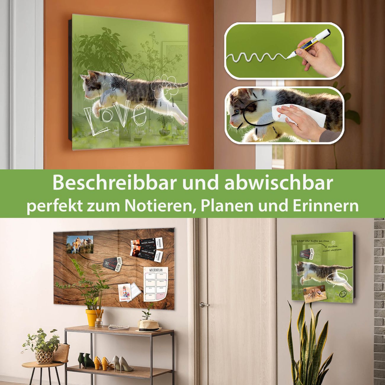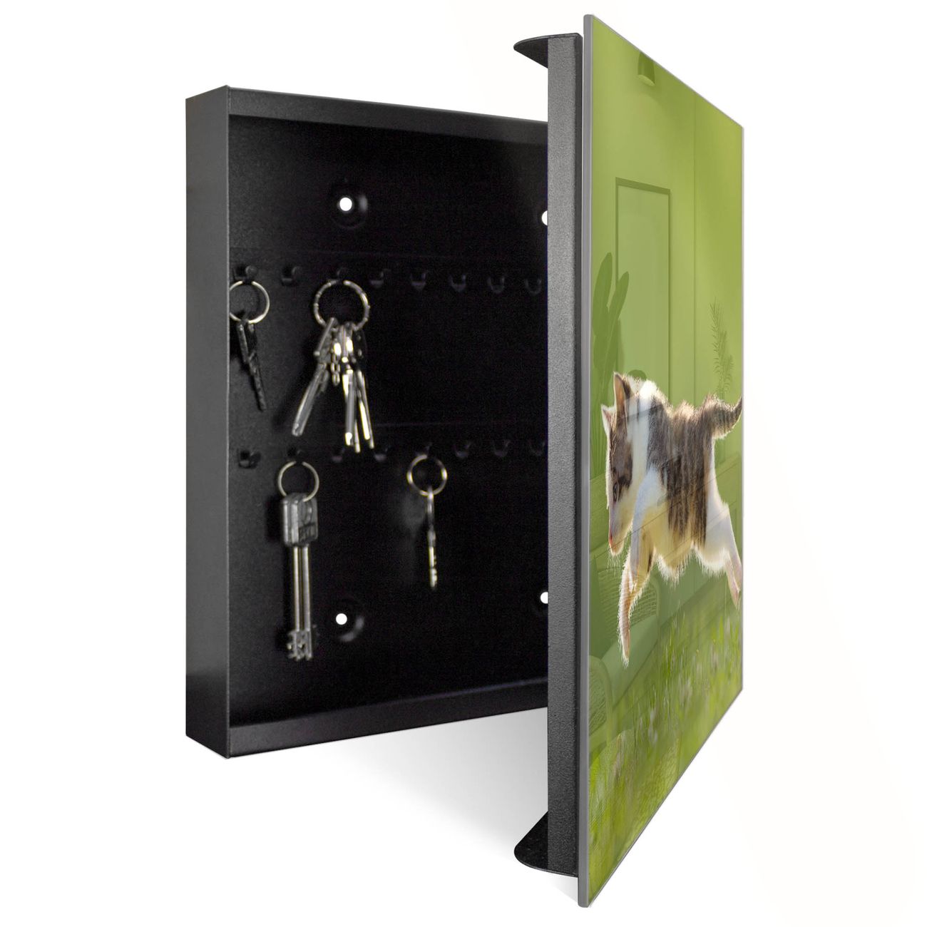 Bringe Ordnung und Eleganz in deinen Eingangsbereich mit dem banjado Schlüsselkasten Motiv Motiv Jagende Katze. Die moderne Schlüsselbox kombiniert funktionales Design mit hochwertiger Verarbeitung und wird so zu einem echten Hingucker in Flur, Büro oder Ferienwohnung. ✅ Stilvolle Schlüsselaufbewahrung mit Glasfront im Motiv Motiv Jagende Katze Der Design-Schlüsselkasten Motiv Motiv Jagende Katze bietet Platz für bis zu 50 Schlüssel, die auf 5 stabilen Reihen mit je 10 Haken übersichtlich verstaut werden. Mit seinen kompakten Maßen von 30 x 30 x 5 cm passt die Schlüsselbox perfekt auch in kleinere Räume. Der schwarz lackierte Stahlkorpus mit rechts angeschlagenem Türscharnier harmoniert mit der Glasfront und fügt sich nahtlos in jedes Wohnambiente ein. Ob als Schlüsselorganizer für Zuhause oder als praktische Lösung für Büros, Praxen und Gewerbe, der banjado Schlüsselkasten sorgt für Ordnung und Übersicht. Dank der magnetischen, mit Kreidestiften beschreibbaren Glasfront kannst du Notizen anheften oder Termine direkt auf der Oberfläche festhalten. Die Schlüsselbox Motiv Motiv Jagende Katze zur Wandmontage wird inklusive Befestigungsmaterial geliefert und ist schnell angebracht. So hast du deine Schlüssel jederzeit griffbereit und zugleich stilvoll verstaut. Mit diesem banjado Schlüsselkasten Motiv Motiv Jagende Katze kombinierst du praktische Aufbewahrung mit stilvollem Wohndesign. Ob privat oder geschäftlich, die Schlüsselbox sorgt für mehr Ordnung, Übersicht und ein wohnliches Ambiente.Vorteile im Überblick