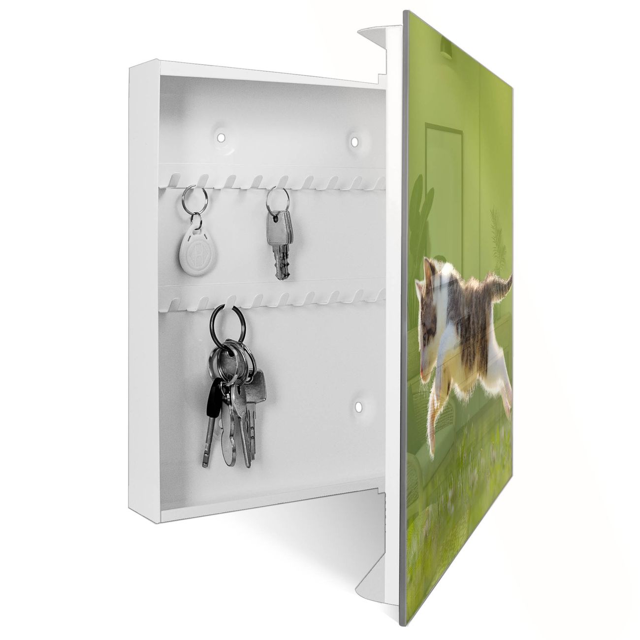 Bringe Ordnung und Eleganz in deinen Eingangsbereich mit dem banjado Schlüsselkasten Motiv Motiv Jagende Katze. Die moderne Schlüsselbox kombiniert funktionales Design mit hochwertiger Verarbeitung und wird so zu einem echten Hingucker in Flur, Büro oder Ferienwohnung. ✅ Stilvolle Schlüsselaufbewahrung mit Glasfront im Motiv Motiv Jagende Katze Der Design-Schlüsselkasten Motiv Motiv Jagende Katze bietet Platz für bis zu 50 Schlüssel, die auf 5 stabilen Reihen mit je 10 Haken übersichtlich verstaut werden. Mit seinen kompakten Maßen von 30 x 30 x 5 cm passt die Schlüsselbox perfekt auch in kleinere Räume. Der weiß lackierte Stahlkorpus mit rechts angeschlagenem Türscharnier harmoniert mit der Glasfront und fügt sich nahtlos in jedes Wohnambiente ein. Ob als Schlüsselorganizer für Zuhause oder als praktische Lösung für Büros, Praxen und Gewerbe, der banjado Schlüsselkasten sorgt für Ordnung und Übersicht. Dank der magnetischen, mit Kreidestiften beschreibbaren Glasfront kannst du Notizen anheften oder Termine direkt auf der Oberfläche festhalten. Die Schlüsselbox Motiv Motiv Jagende Katze zur Wandmontage wird inklusive Befestigungsmaterial geliefert und ist schnell angebracht. So hast du deine Schlüssel jederzeit griffbereit und zugleich stilvoll verstaut. Mit diesem banjado Schlüsselkasten Motiv Motiv Jagende Katze kombinierst du praktische Aufbewahrung mit stilvollem Wohndesign. Ob privat oder geschäftlich, die Schlüsselbox sorgt für mehr Ordnung, Übersicht und ein wohnliches Ambiente.Vorteile im Überblick